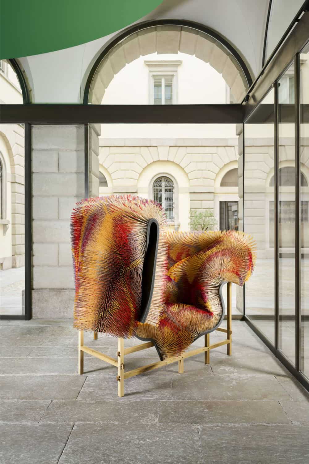 Historically MCM is best known for their leather goods but the German brand decided to venture into the design space for the first time, with their presentation at Salone del Mobile. Held at the Palazzo Cusani, it was the debut of the MCM Wearable Casa Collection as conceived by Atelier Biagetti and curated by Maria Cristina Didero. The pieces explored the idea of objects that fit into our increasingly futuristic lifestyle, with the result being seven pieces that brought together Bauhaus functionality with modern needs including, naturally, a metaverse version of the space that anyone can browse on . Pieces include the Chatty Sofa, which draws from graffiti as well as Gufram’s Bocca sofa for its design as well as the Tatamu, which reinterprets Tatami mats into a soft rolled object that can become anything you’d like to sit on. The Mind Teaser is another transformative item that can be a stool, chair or coffee table and brings to mind a Rubik’s Cube as well as Mario Bellini’s work. For lighting, they imagined the Clepsydra Lantern, a light that can follow you wherever your travels take you while the Magic Gilet is a wearable utility vest that draws from a Vitra design.