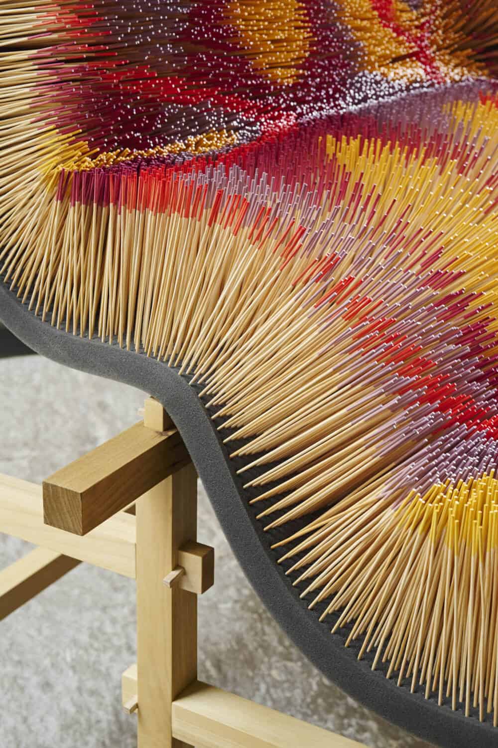 Normally when you want a rug to be soft underfoot but that’s not always the case — think about those so-called pressure point mats that feel like sharp jabs to the soles. Well, for design week Issey Miyake took it one step further, with an installation that might technically be a carpet in name but is anything but meant to be laid on the floor. Working in conjunction with Dutch collective We Make Carpets, the two pieces use everyday objects in delicate compositions. The first utilizes 60,000 bamboo skewers that were dipped into batches of paint before being inserted one-by-one by hand into the foam base. Laid over a wooden frame, the base itself was made without screws or glue, highlighting a painstaking attention to detail. For the second piece, the collective was inspired by the pins used in clothes-making, jabbing them into a foam layer that is then fitted into a wooden frame that allows them to distort open and close to create organic patterns. Definitely not something you want to jab you but beautiful to admire from a distance!