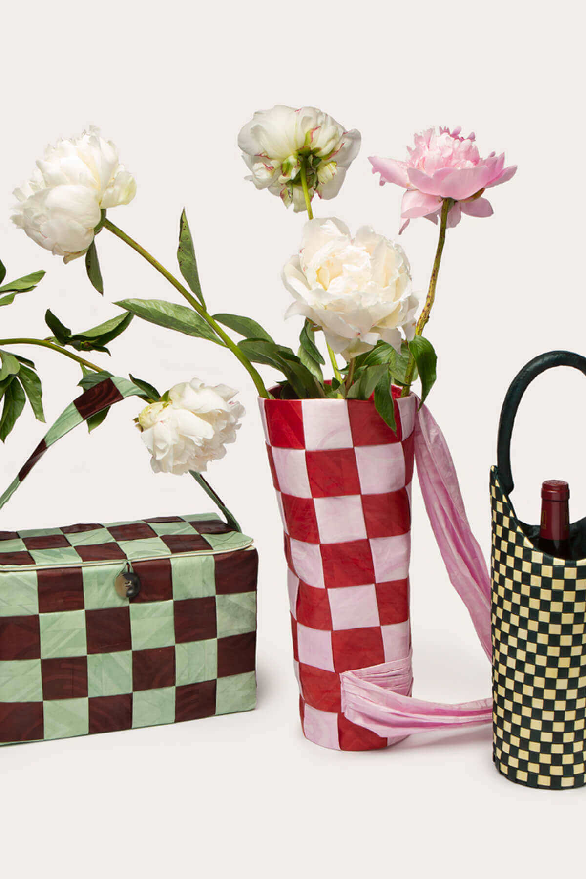 Consisting of four pieces: a picnic basket, a bottle carrier, and two types of flower carriers, they’re made up of bazin, a type of cotton that’s widely worn in West African countries. After being dyed in the Ivory Coast utilizing natural dyes the pieces are then handwoven in Beirut. Like both brands, the colors are vibrant and playful, mixing pastels and jewel tones to create an eye-catching checkered pattern made to be instantly recognizable.