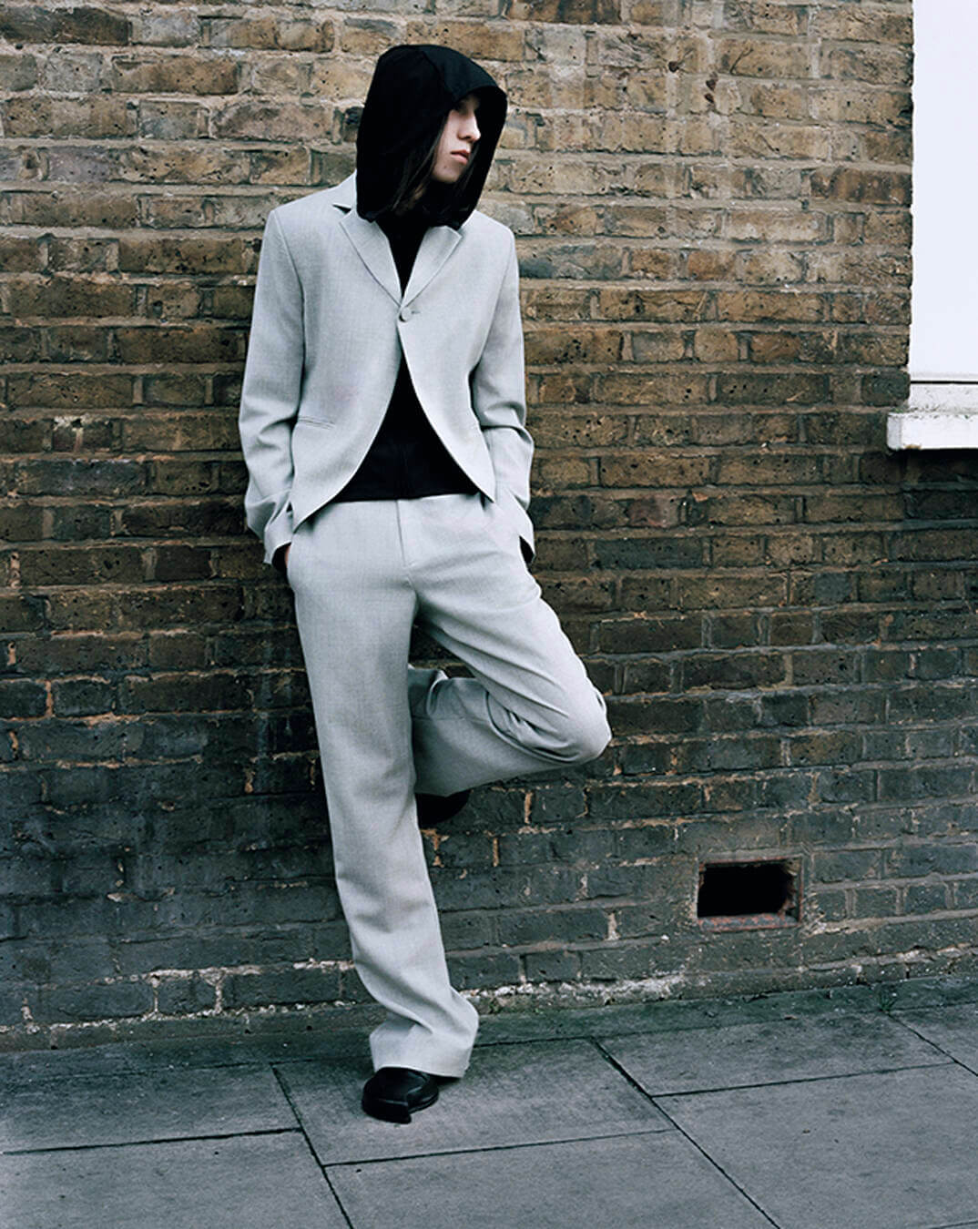 Having designed fashion-forward menswear thus far, he is now introducing womenswear into his eponymous label’s arsenal. An easy transition, no doubt, thanks to the fact that half of Esh’s customer base is already made up of women who are delighted with the designer’s quietly sensual tailoring. His collections come peppered with plenty of feminine flourishes. Sliced and diced suit jackets become torso-hugging halternecks, liquid silk shirts drape elegantly off the shoulder and, most distinctly, a bubble-hem mini skirt sits atop a pair of Armani-grey tailored trousers. (That last piece is based on a styling trick by Esh’s girlfriend, System magazine’s Fiona Hartley.) Clever borrowings from womenswear and an impeccable approach to cut and silhouette helped propel Esh to this year’s LVMH Prize finals. When we speak, he’s still in disbelief at the whole experience, particularly about having been able to meet a slew of his design heroes, including Jonathan Anderson, at the semifinals in Paris. “I told him that I wouldn’t be standing here if it wasn’t for his work. Afterwards, I thought to myself, ‘That was so cringe.’” Throughout the competition process, it wasn’t only his talent, but his authenticity that shone through. “I wanted to speak to Anna [Wintour] in the same way I would speak to someone’s mum if they came up to me. I described the brand to [her] like taking Jil [Sander] and placing it on Kingsland High Road. I had no idea, but her brother lives on Kingsland High Road. You could see on her face she understood the reference.”