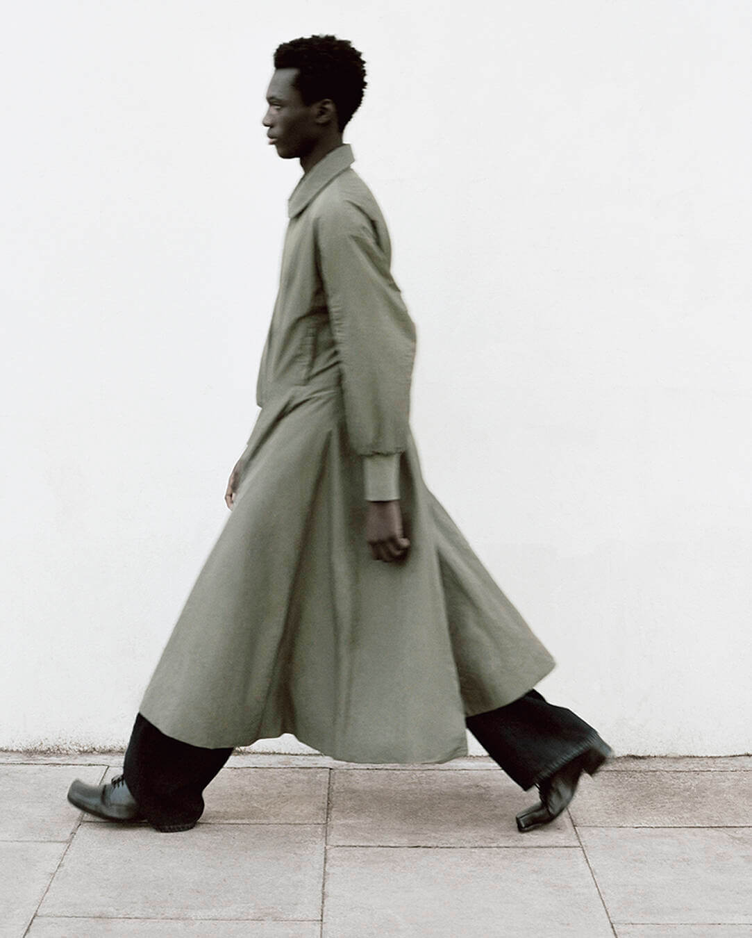 Esh grew up fascinated with fashion but didn’t have the inkling he would pursue it as a career. Since his early teens, he studied the style tribes that populated his native city. “I could tell the boy that was from South London [compared] to the boy that was from East London, to the boy that went to the footy to the boy that was off to a rave,” says Esh. His grandfather was a tailor, having moved to London from Cyprus in the 1960s to open a series of dry cleaners and clothing factories acrossIslington (Esh’s father grew up a stone’s throw from the designer’s studio). Through his teens, Esh’s interests spanned from Raf Simons to skaters to Savile Row. “Even now, we use so many techniques that feel very classic in Savile Row. There are little elements which are taken from classic British tailoring but in a piece which feels very new.” He ended up pursuing a graphic design degree before making a switch to fashion design at the age of 25. “It wasn’t necessarily like I found fashion as my medium– I could’ve easily gone into sculpture, photography or something different. I love making things with my hands. I think that graphics and doing things on a computer weren’t fulfilling that need.” Following an undergraduate degree at London College of Fashion, he joined the menswear master’s programme at Central Saint Martins in 2020. Esh’s graduate collection, shown in February of last year, was largely inspired by his mother, a Polish sculptor who now lives in the US. “I grew up with all these mad things in the house,” says Esh, “like a coat she made out of pins or when she made a ball of yarn that was the height of this room.”