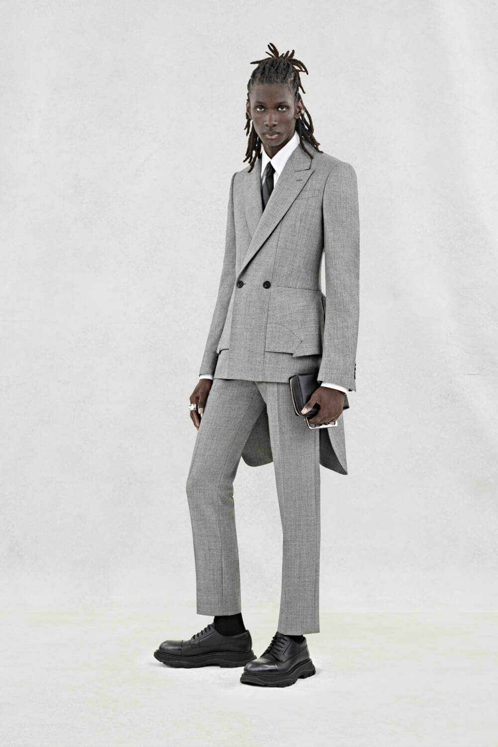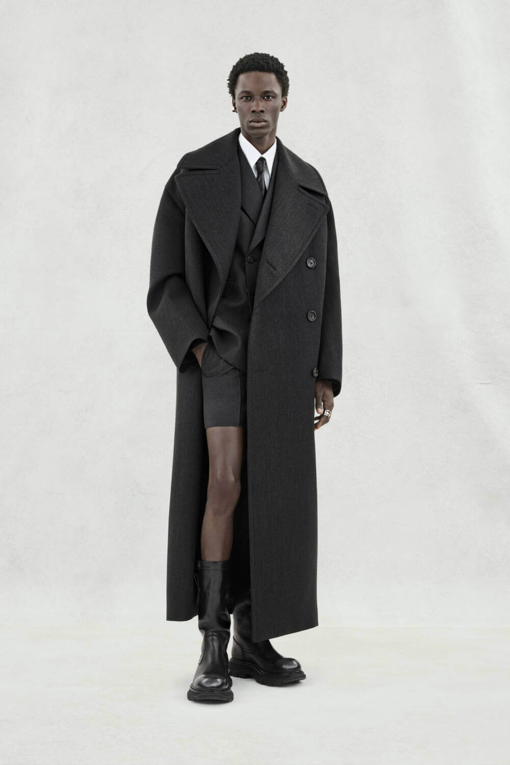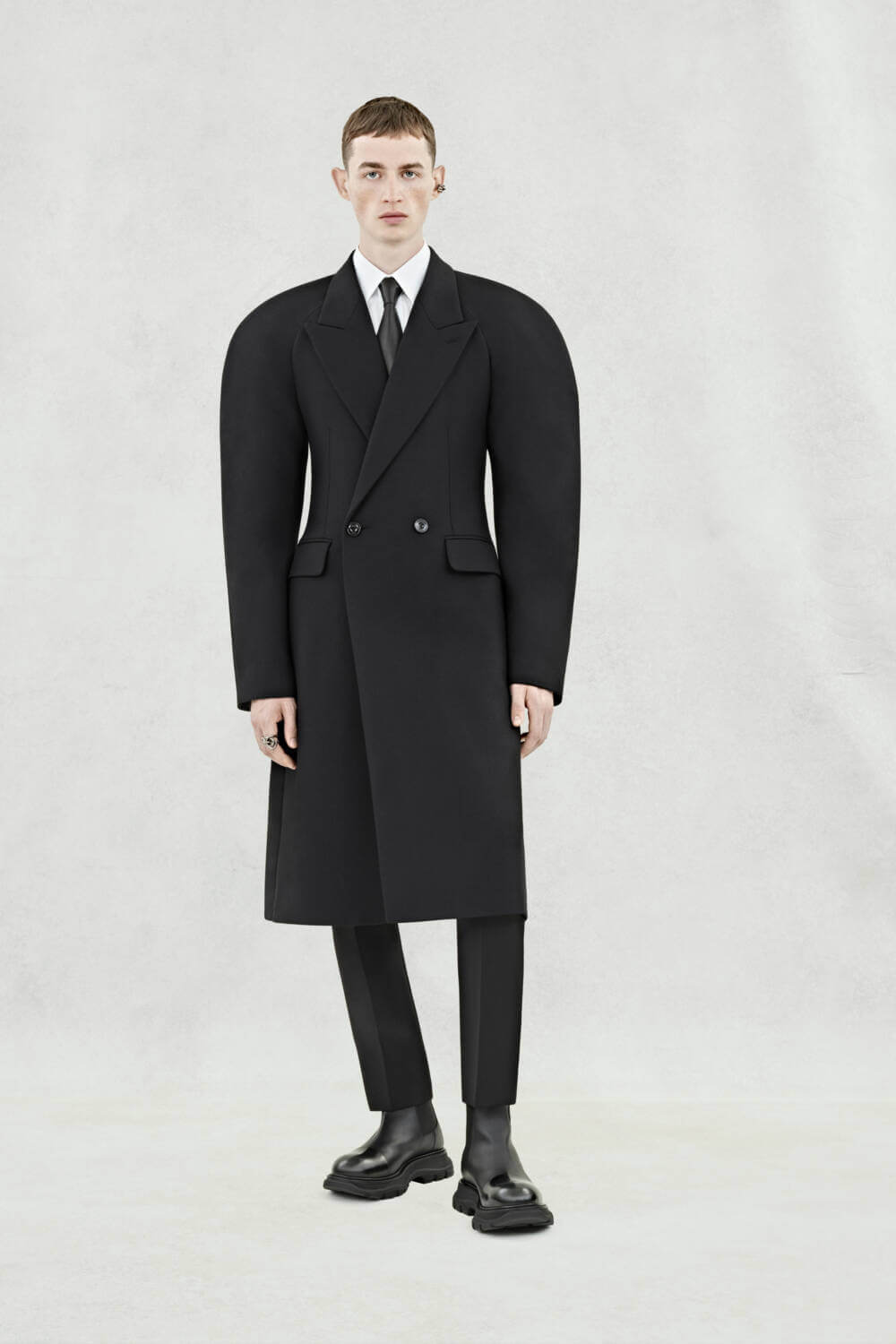 Alexander McQueen’s SS24 menswear collection is a lesson in soft yet statement elegance. With an emphasis on silhouette, the offering includes double breasted jackets, shin-length overcoats and a healthy array of statement suiting – most of which have been edited with swollen sleeves, widened lapels and augmented breast pockets. A continuation of creative director Sarah Burton’s AW23 collection, which explored anatomy by subverting garments that were structured on the body, this season interprets the same theme with a greater emphasis on moulding and curving.