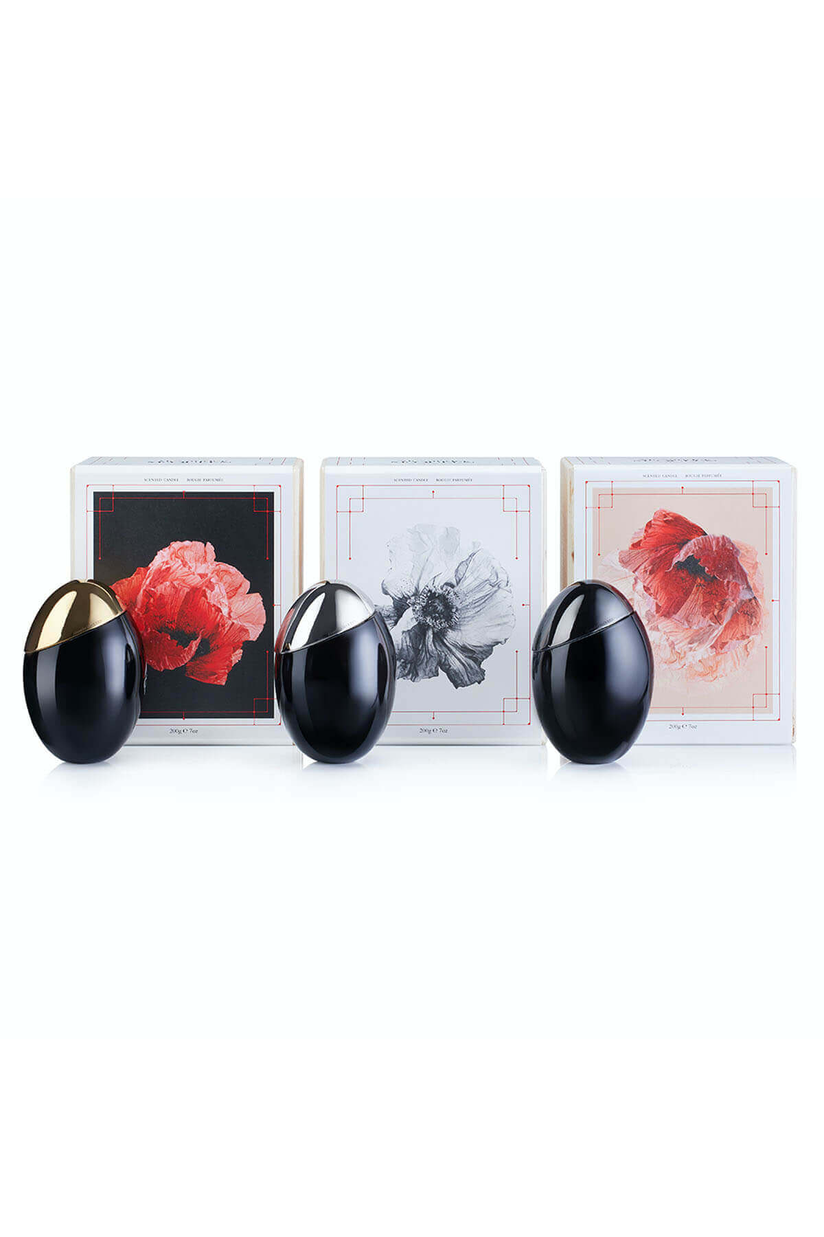 At $395, they’re a bigger splurge than your average luxury candle but once you get your hands on them, you’ll understand why. Consisting of a hefty wooden box that carefully encases the egg-shaped black lacquered glass holders and featuring a metal lid in either silver, dark metal, or gold, they feel substantial. Made from black mineral waxes and rapeseed wax, it’s made to retain its scent for longer and have an extended burn time, so that the fragrance can infuse every inch of your space.