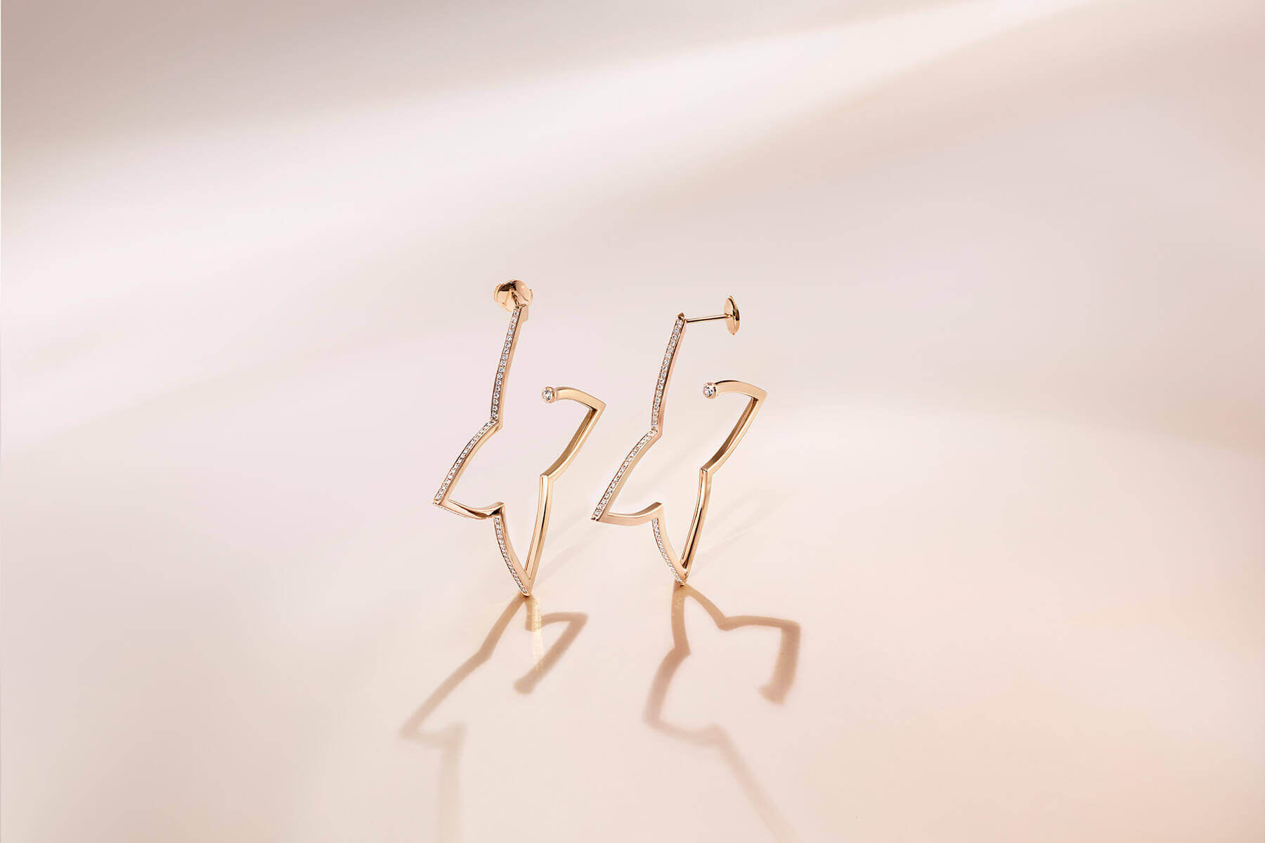 Unlike the previous collections, Amfitheatrof opted to interpret the star-shaped motif by highlighting outlines of the shape as well as playing with volume and size. Featuring 11 pieces in either pink or white gold, the designs are meant to complement your personal styles. For those seeking delicate personal jewelry you’ll find stackable earrings, rings and pendants, accented with a smattering of diamonds. If over-the-top creations are more your speed, there are exaggerated hoops, as seen on Ana de Armas, made with an open flower design. To round it out, a modern, on-trend ear cuff as well as an edgy earring meant to be worn solo are for those looking to add some cool to their wardrobe.