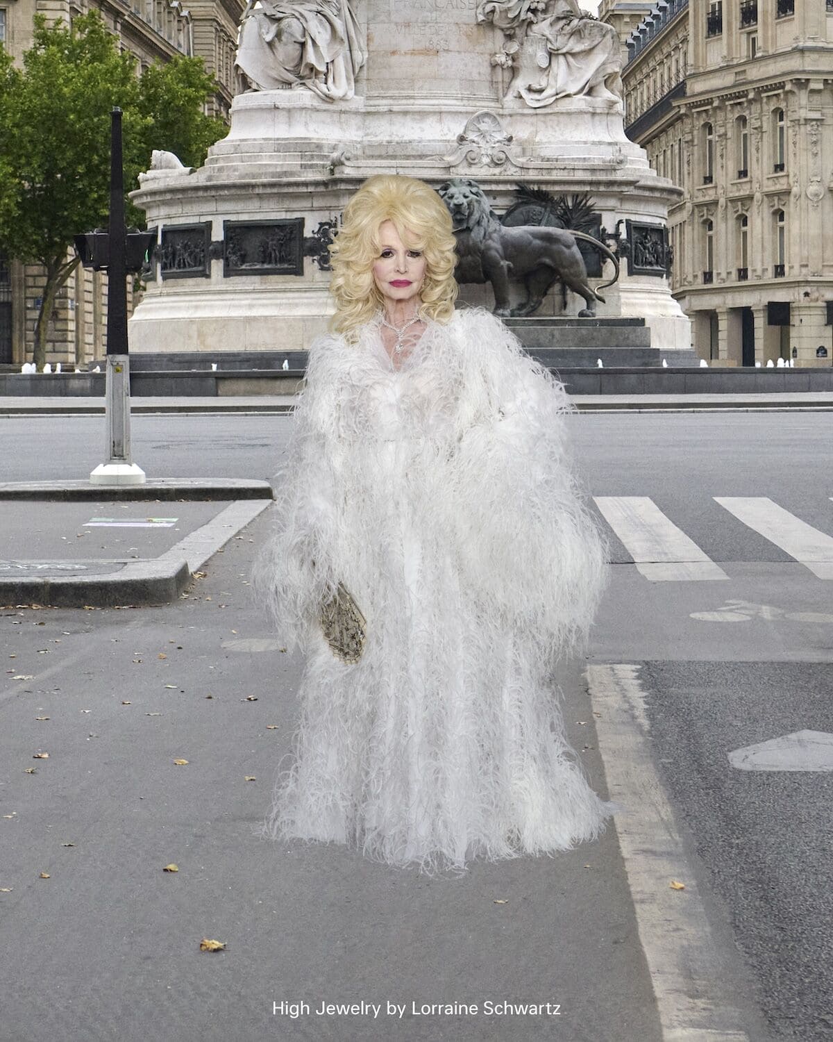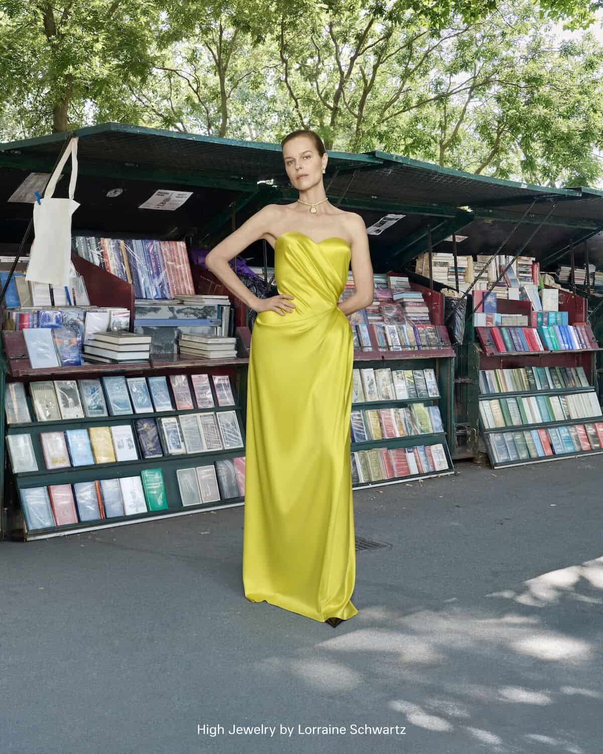 Both dress codes of the Bourgeoisie and Old Hollywood glamour led Demna’s design hand. Most impressive were Kardashian’s “mink” coat, a tribute to Elizabeth Taylor, which was entirely embroidered from feathers. Or Eva Herzigová’s statuesque red-carpet wonder, its buttercup yellow silk gorgeously complimenting a canary yellow diamond necklace by Lorraine Schwartz, also a nod to Taylor’s love of bling.