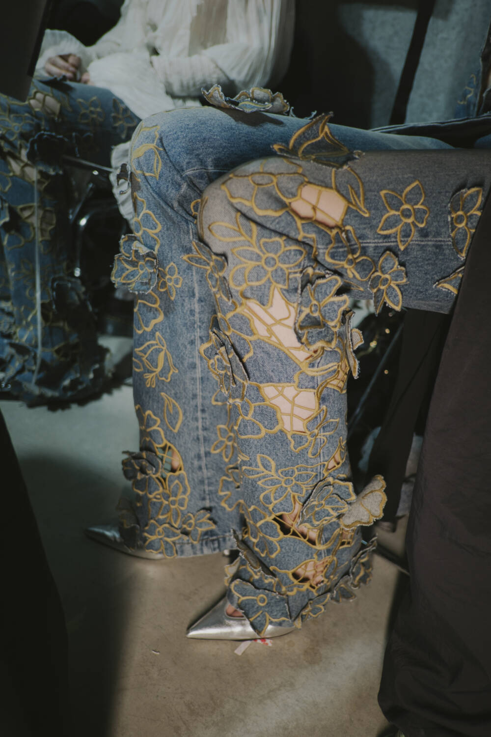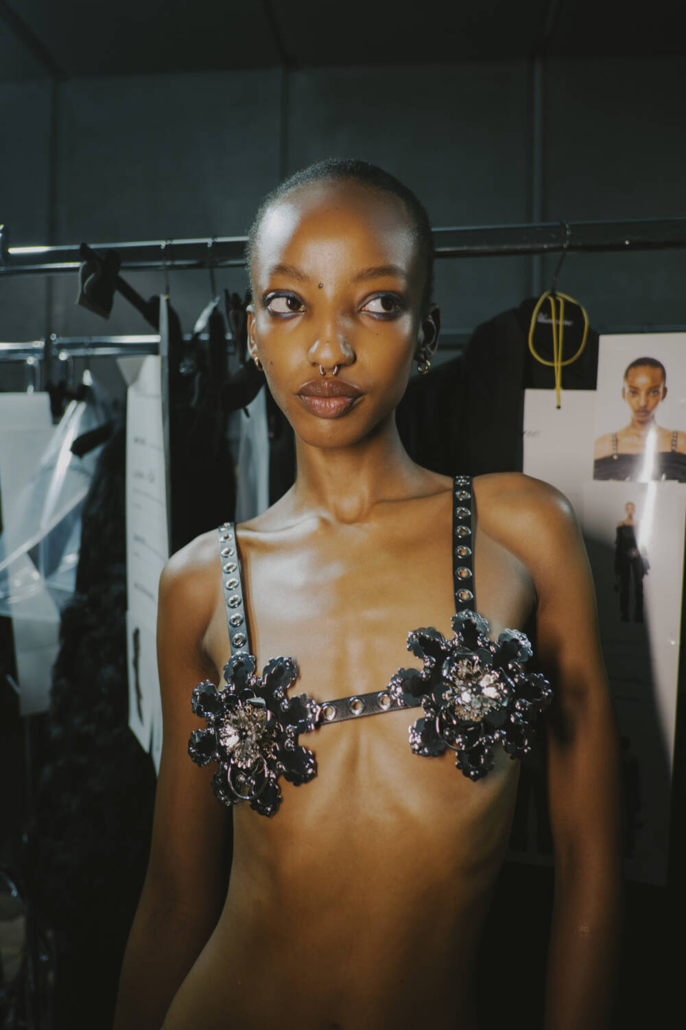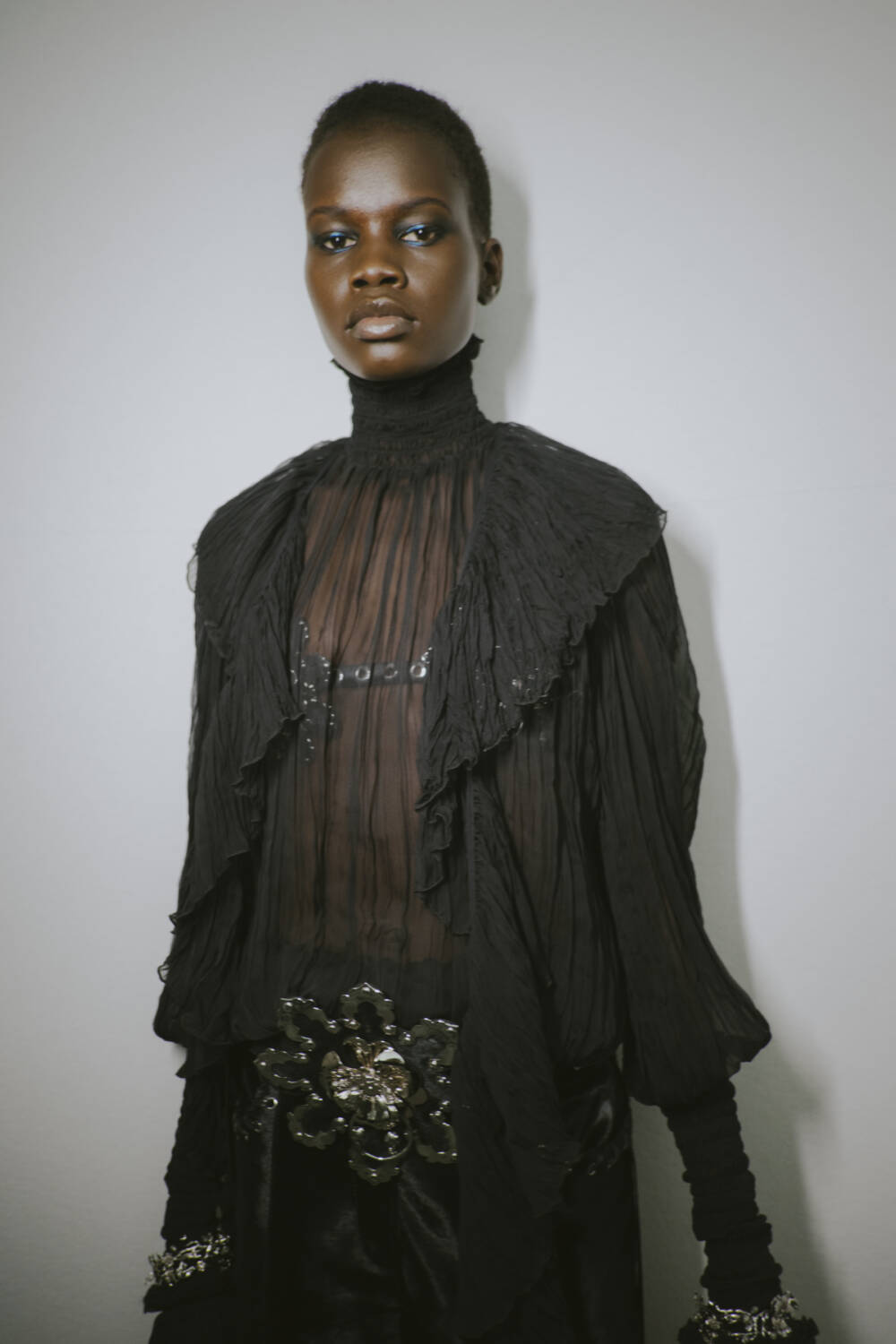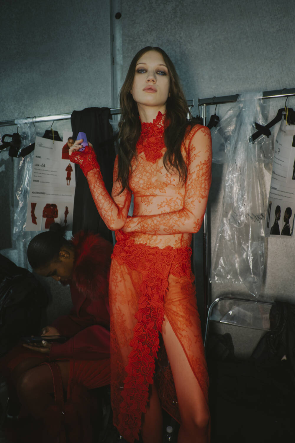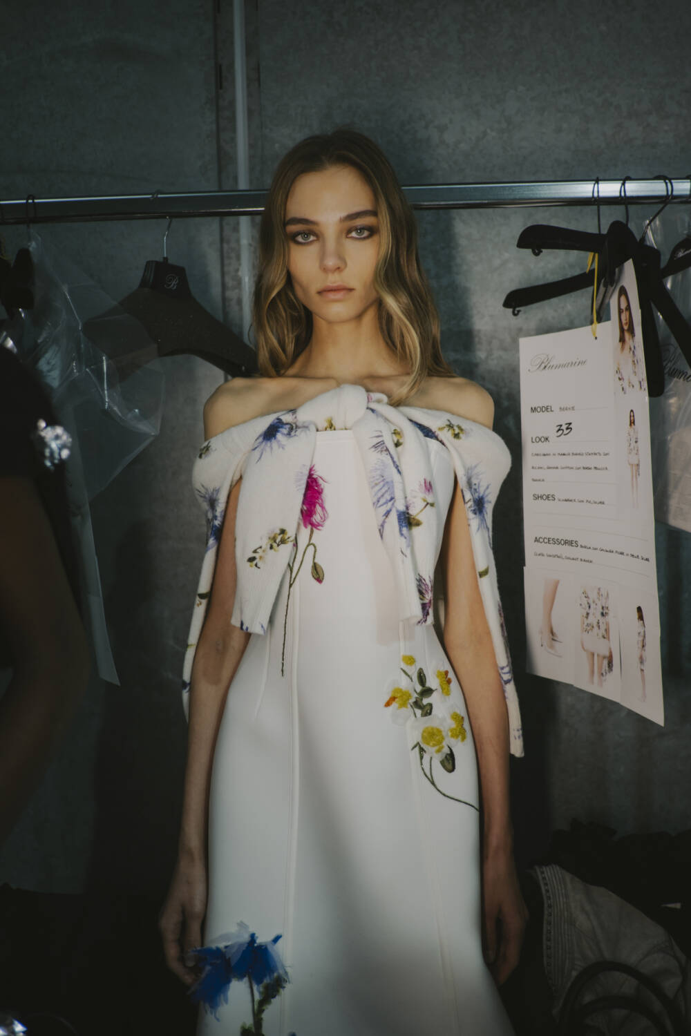 Indulgent faux fur accents, alongside Koma’s signature asymmetric silhouettes, gave the collection a structured fluidity that was unmistakably his. His careful consideration of colour – from the bold blood reds to dark blacks and whites – played out like a rich emotional palette, blending romance and modernism in equal measure. This attention to both silhouette and texture was further reflected in the metal adornments, delicate lace and three-dimensional floral and butterfly embroideries that added layers of sophistication and a taste of true Blumarine spirit.