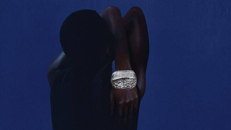 Up next is Eau D’encre, which is inspired by Iceland’s inky depths and incorporates obsidian. With the stone’s rippled shape nested between two pave diamond borders, the finished bracelet simulates rough seas. Also in this group is a 2.01-carat pear-shaped ring that combines black and white to resemble foamy water drifting onto black sand. The shoreline also provides the jumping-off point for Sable Noir, which uses diamonds as well as crystal black sand (a material the brand has used before in 2015) to create a striking and graphic suite consisting of a necklace, ring, and earrings.