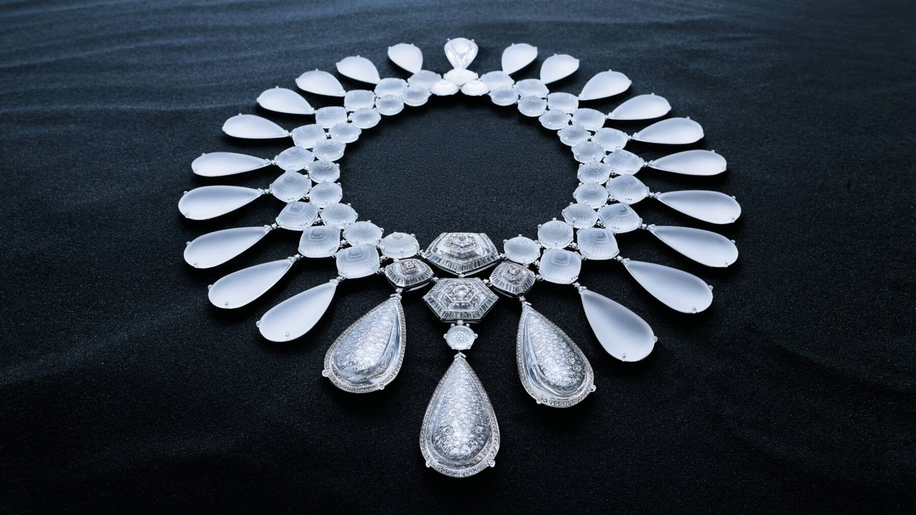 Where there is water, there must also be ice, especially when it comes to Iceland’s Diamond Beach, which is known for bits of glaciers that resemble sparkling gemstones washing ashore. Iceberg takes its name from that locale with a necklace and earrings that give off the impression of light and transparency. The former is designed to float around the neck, requiring an astonishing 2,000 hours of work, while the latter clocked in at 410 hours worth of labor.