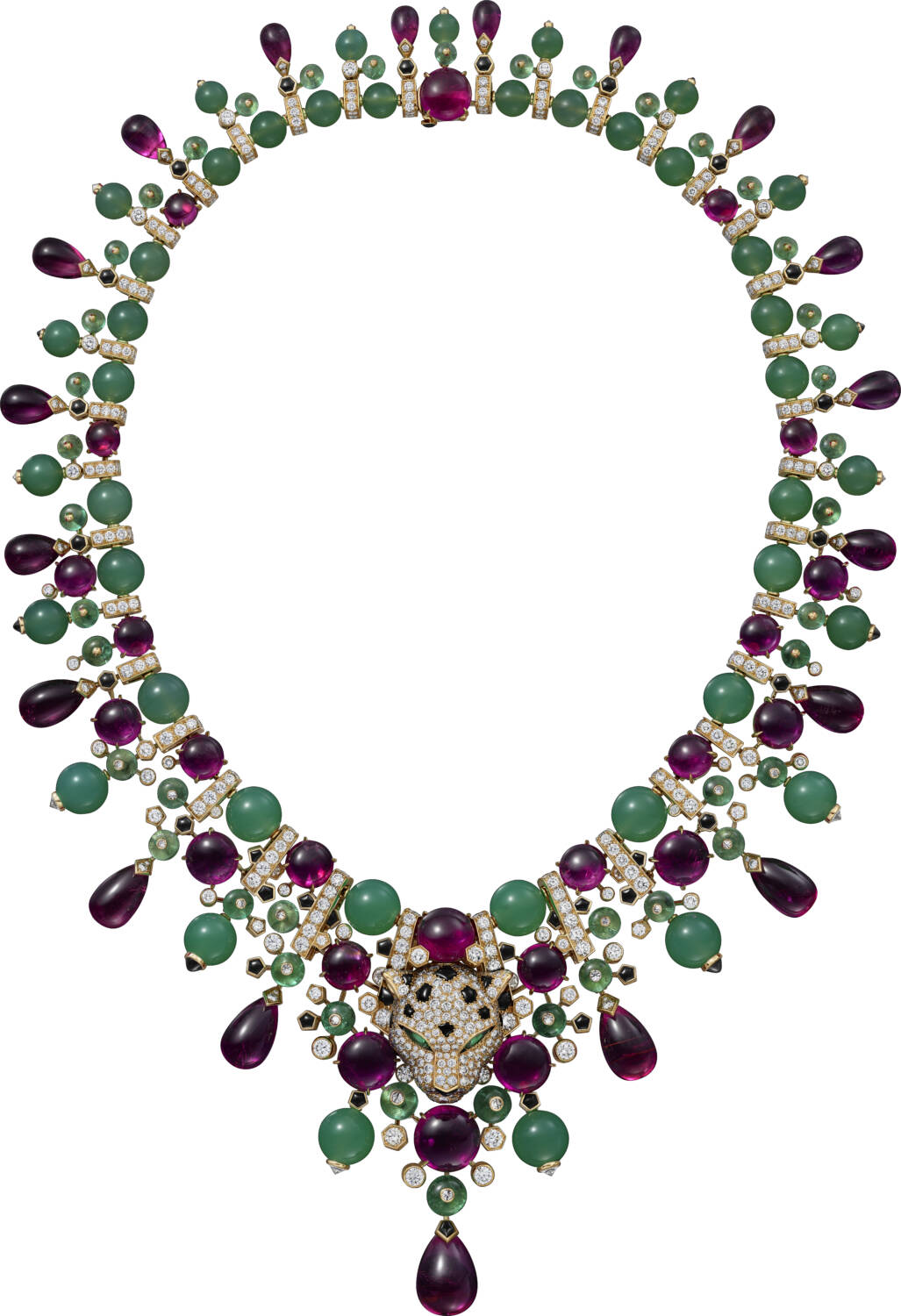 The Panthère Chatoyante necklace, featuring Cartier’s iconic panther, is another highlight of the collection. This feline, with its emerald eyes and black lacquer accents, embodies the power and grace of the animal kingdom. The necklace dazzles with a luxurious array of rubellites, chrysoprases, and emeralds that mimic the panther’s coat, creating a spectacle of color and light.