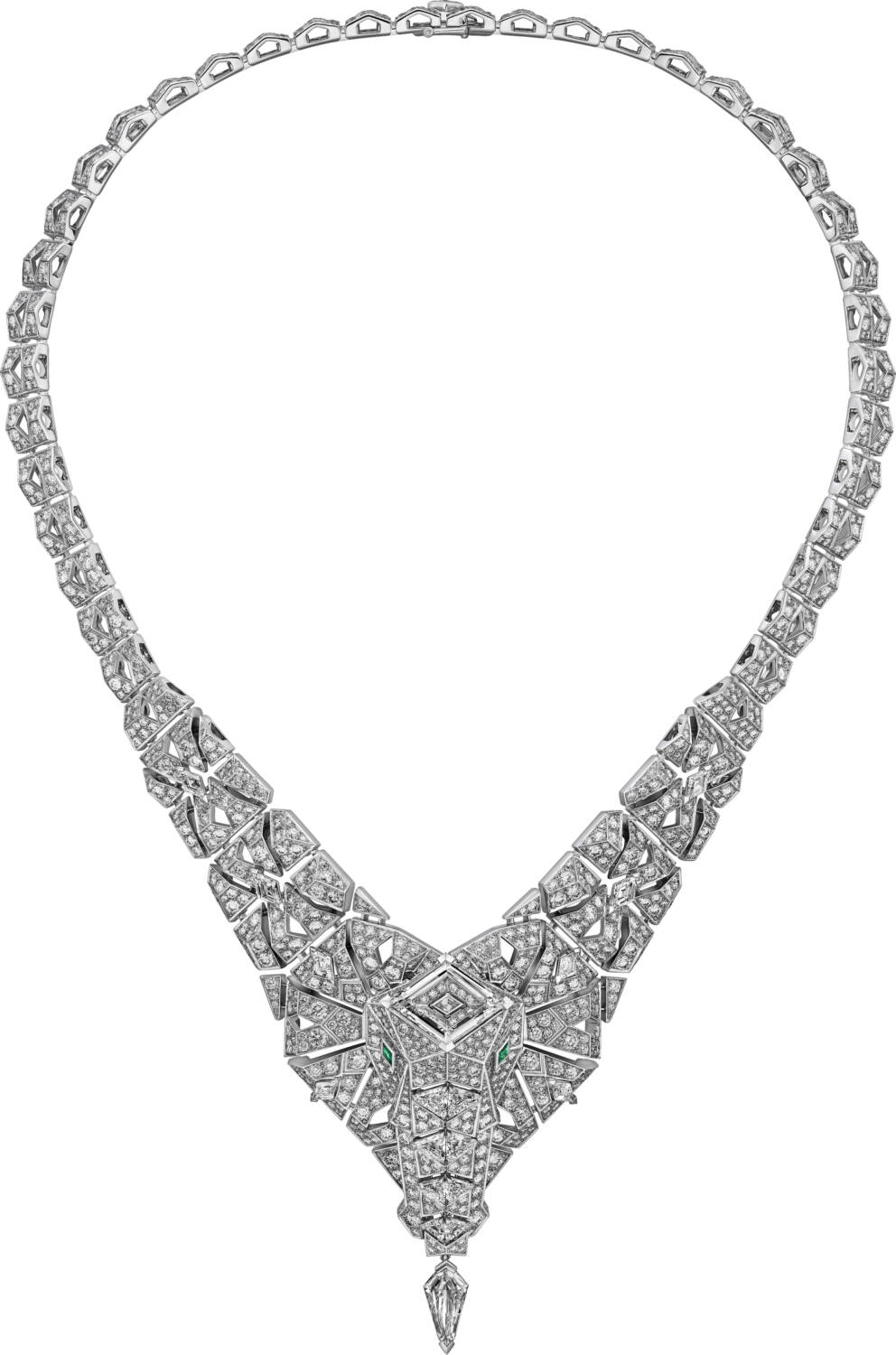 Equally captivating is the Vamana necklace, where the elephant is reimagined in a blend of abstract styles. The ears, trunk, and emerald eyes emerge from an arrangement of diamonds, forming a graphic mesh that sits on the neck with elegance. This piece not only showcases Cartier’s technical skills but also its ability to infuse each design with a sense of life and movement.