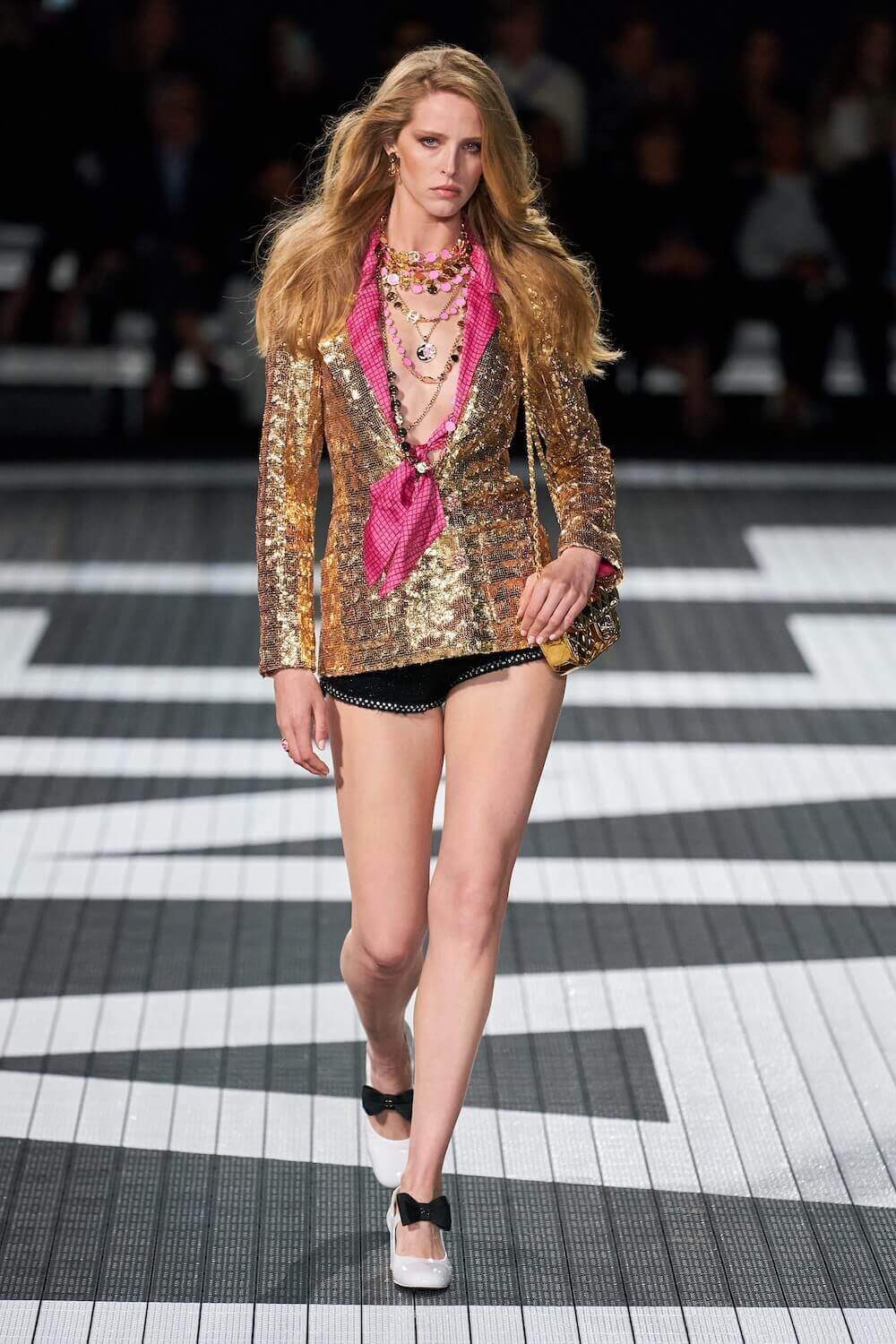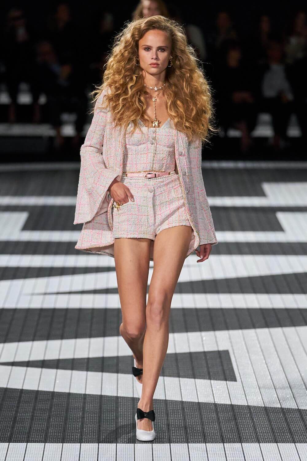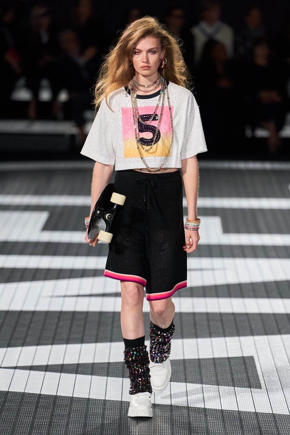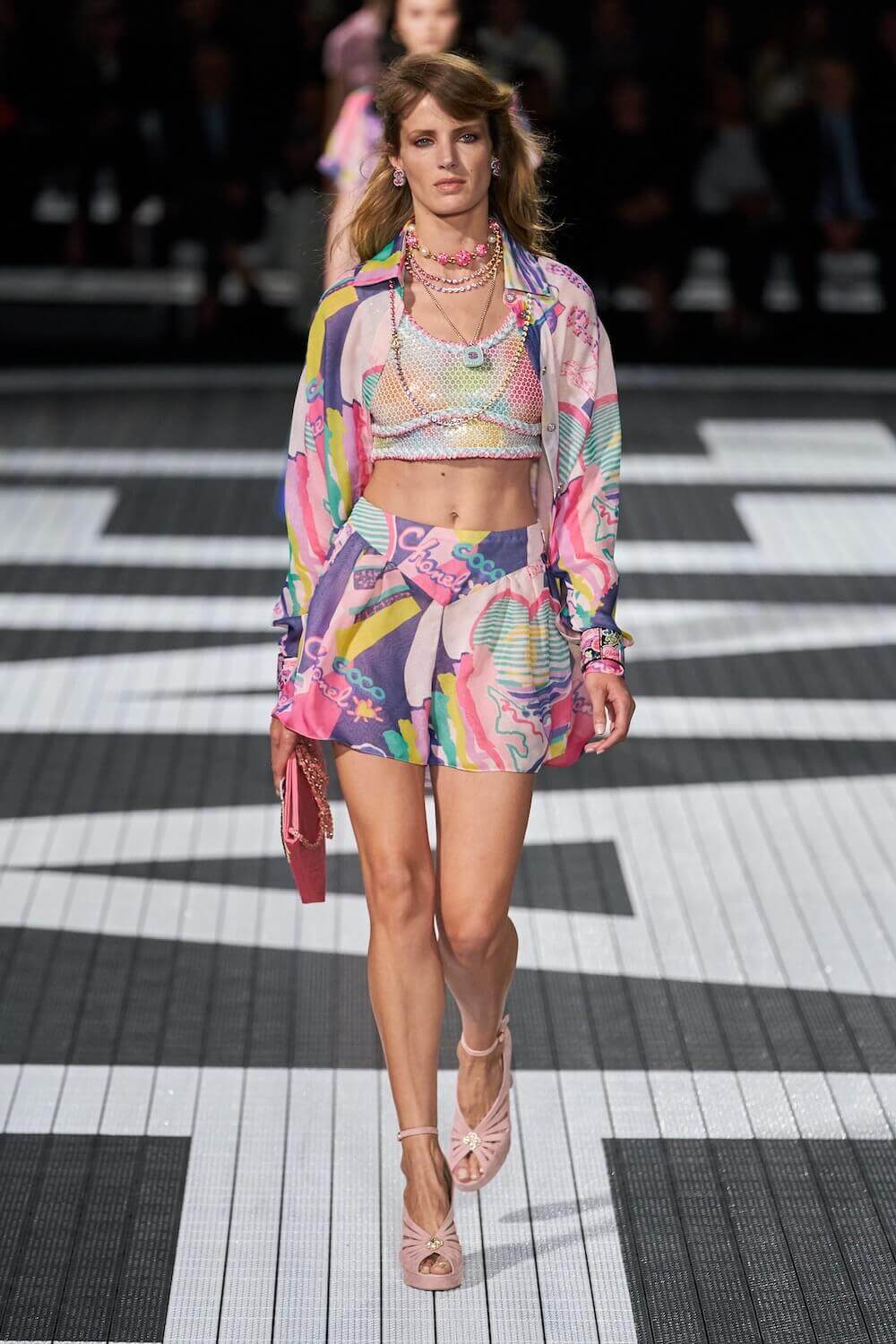 The soundtrack for the 1992 psycho-sexual thiller, Basic Instinct boomed as the first, big-haired model bounced down the runway in teeny tiny, crystal-trimmed dolphin shorts, a crop top and white sneakers. Paris Hilton was in the audience but her 90210 sensibilities were all over the catwalk. Bedazzled, cut-out swimsuits were worn with Chanel-logo legwarmers, knitted tweed shorts suits came in barbie-core pink, ombre denim hot pants jostled with ice blue satin tracksuits, ears were timed with marabou hoops, heads adorned with rainbow bucket hats. One model wore a onesie emblazoned with fuzzy neon palm trees, another carried a Chanel skateboard. The mood was playful (wedge-heeled sneekers anyone?), youthful (skateboard pendants and rainbow bucket hats) and LA casual (yes, you can wear jewels with your swimsuit), but it was all done with Chanel’s artisan eye.