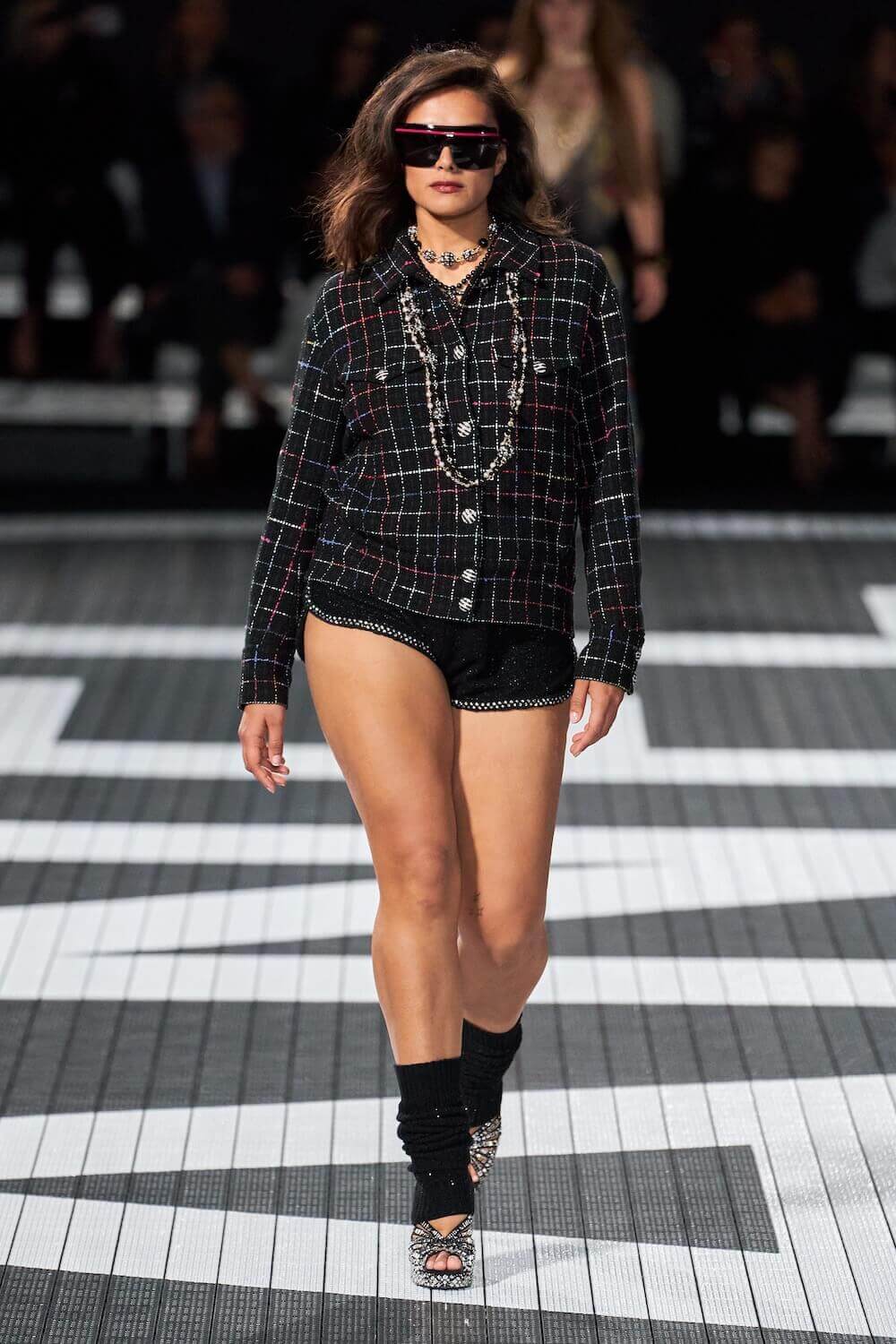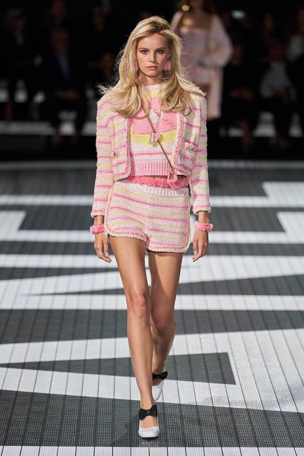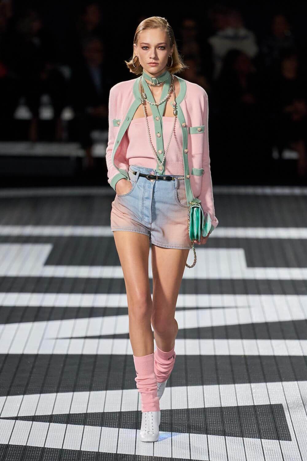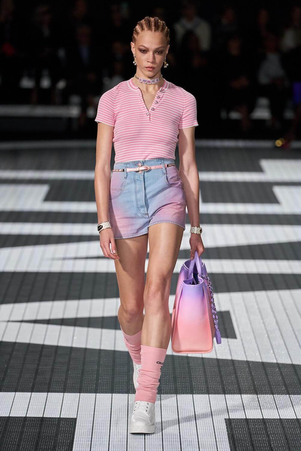 The soundtrack for the 1992 psycho-sexual thiller, Basic Instinct boomed as the first, big-haired model bounced down the runway in teeny tiny, crystal-trimmed dolphin shorts, a crop top and white sneakers. Paris Hilton was in the audience but her 90210 sensibilities were all over the catwalk. Bedazzled, cut-out swimsuits were worn with Chanel-logo legwarmers, knitted tweed shorts suits came in barbie-core pink, ombre denim hot pants jostled with ice blue satin tracksuits, ears were timed with marabou hoops, heads adorned with rainbow bucket hats. One model wore a onesie emblazoned with fuzzy neon palm trees, another carried a Chanel skateboard. The mood was playful (wedge-heeled sneekers anyone?), youthful (skateboard pendants and rainbow bucket hats) and LA casual (yes, you can wear jewels with your swimsuit), but it was all done with Chanel’s artisan eye.