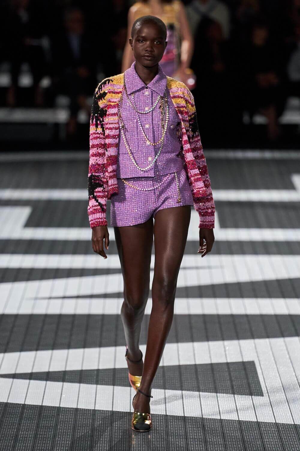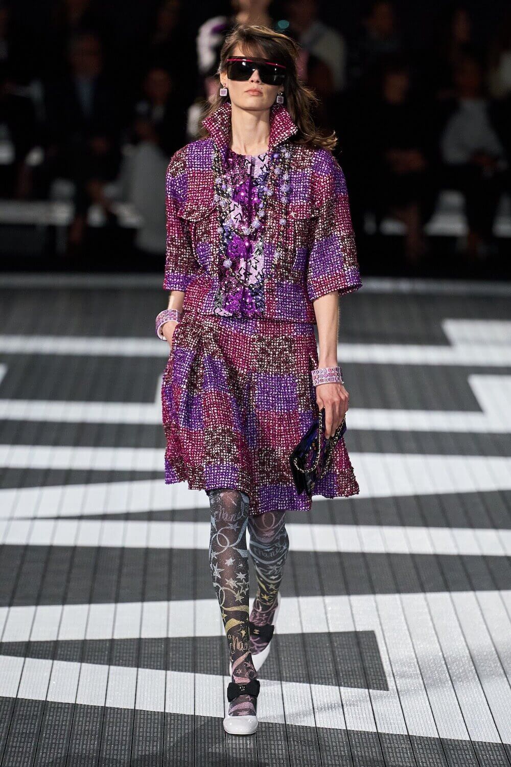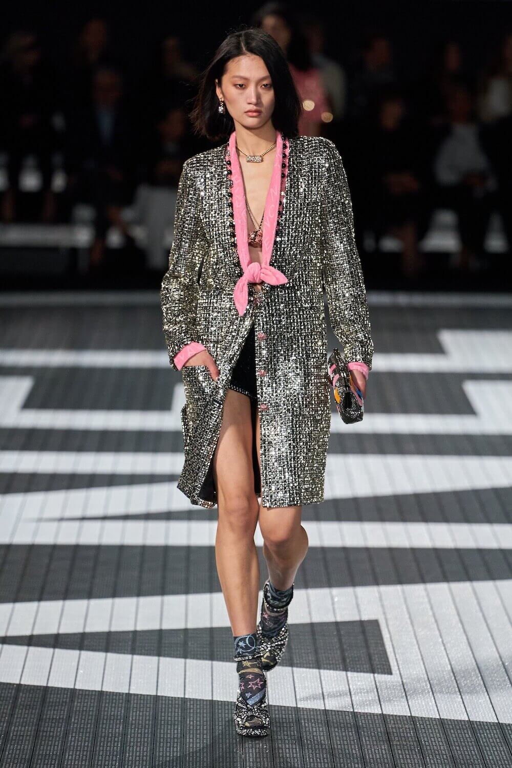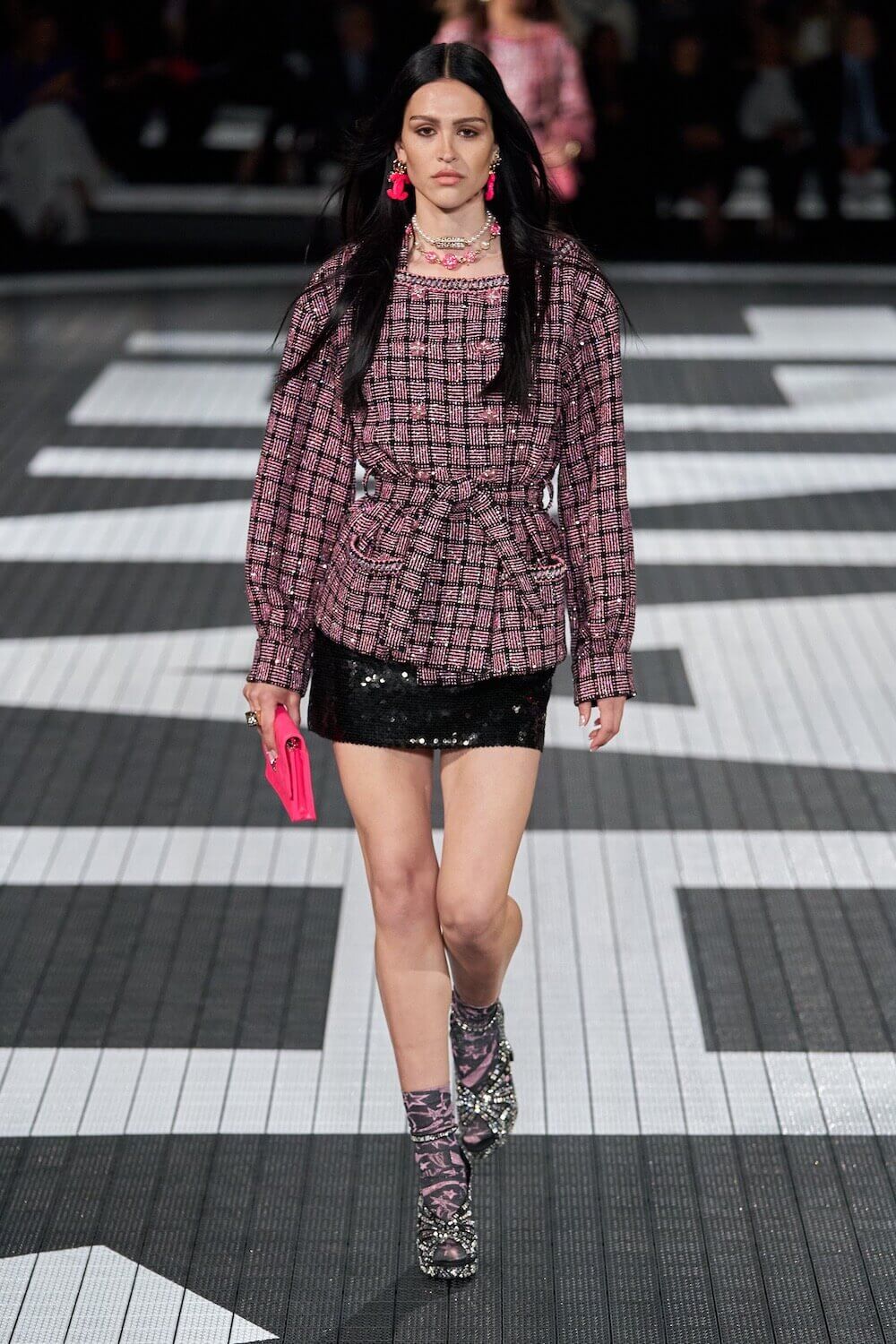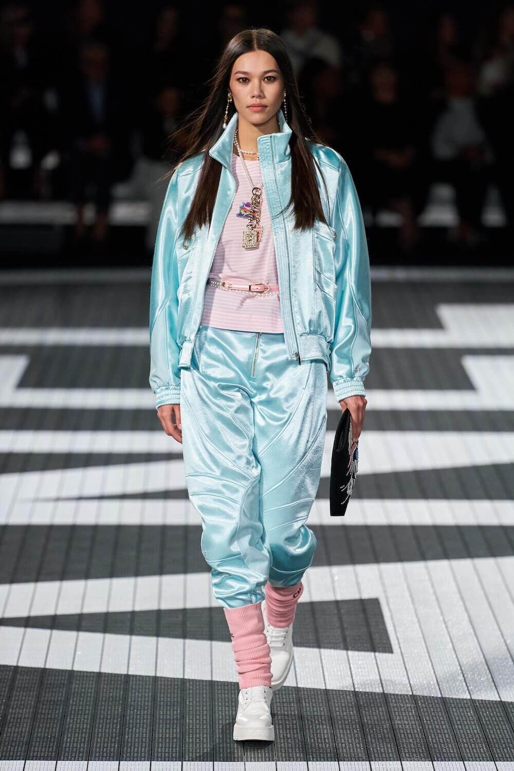 The soundtrack for the 1992 psycho-sexual thiller, Basic Instinct boomed as the first, big-haired model bounced down the runway in teeny tiny, crystal-trimmed dolphin shorts, a crop top and white sneakers. Paris Hilton was in the audience but her 90210 sensibilities were all over the catwalk. Bedazzled, cut-out swimsuits were worn with Chanel-logo legwarmers, knitted tweed shorts suits came in barbie-core pink, ombre denim hot pants jostled with ice blue satin tracksuits, ears were timed with marabou hoops, heads adorned with rainbow bucket hats. One model wore a onesie emblazoned with fuzzy neon palm trees, another carried a Chanel skateboard. The mood was playful (wedge-heeled sneekers anyone?), youthful (skateboard pendants and rainbow bucket hats) and LA casual (yes, you can wear jewels with your swimsuit), but it was all done with Chanel’s artisan eye.