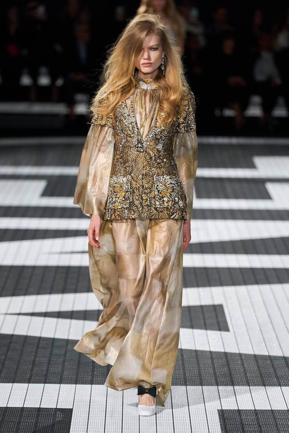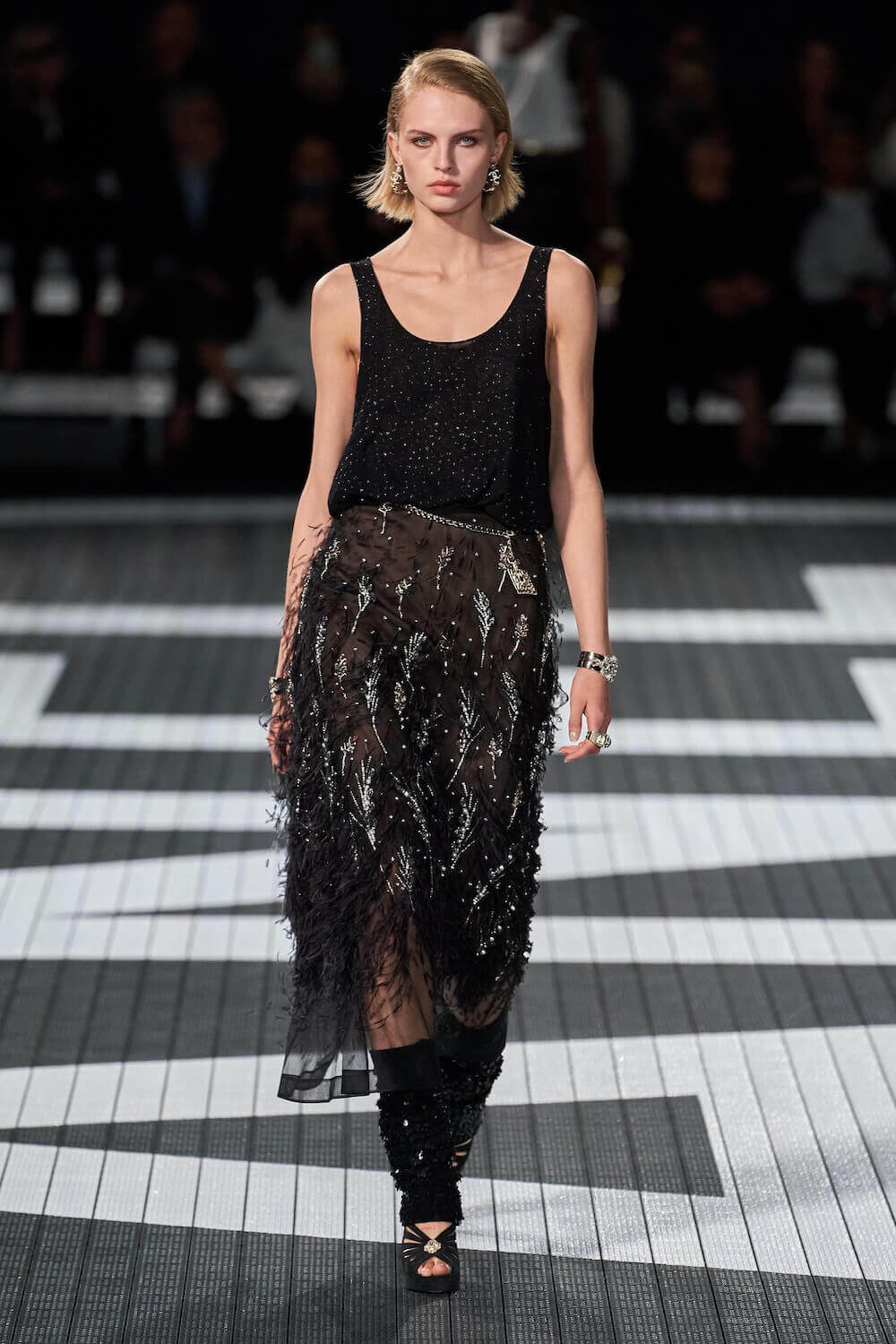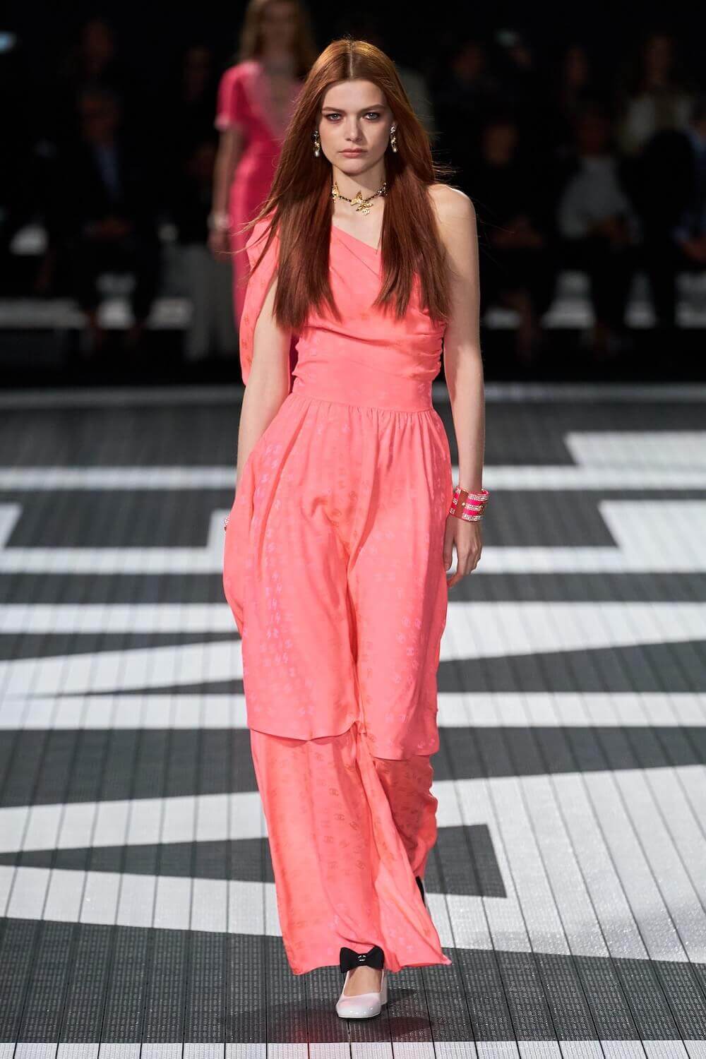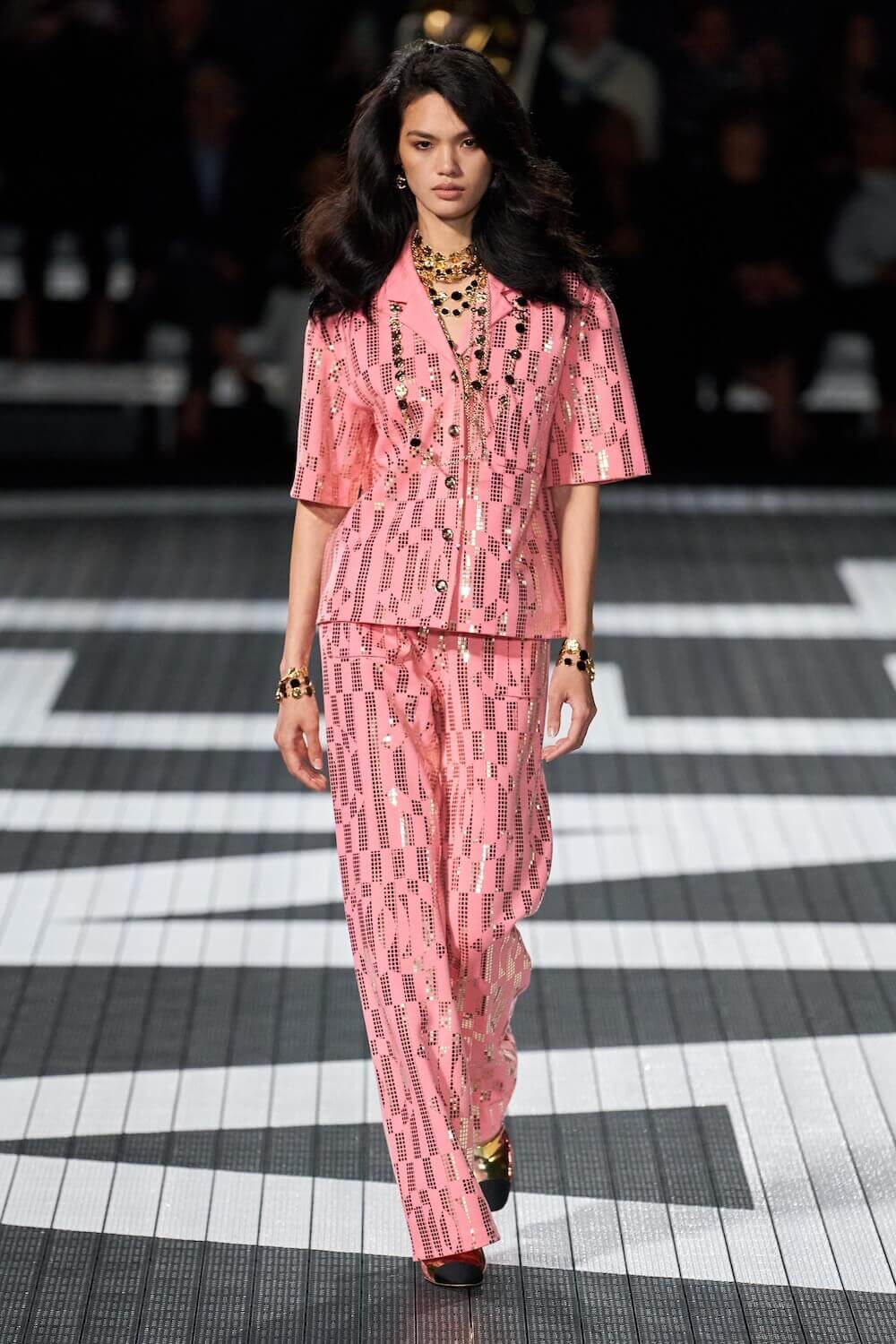 The soundtrack for the 1992 psycho-sexual thiller, Basic Instinct boomed as the first, big-haired model bounced down the runway in teeny tiny, crystal-trimmed dolphin shorts, a crop top and white sneakers. Paris Hilton was in the audience but her 90210 sensibilities were all over the catwalk. Bedazzled, cut-out swimsuits were worn with Chanel-logo legwarmers, knitted tweed shorts suits came in barbie-core pink, ombre denim hot pants jostled with ice blue satin tracksuits, ears were timed with marabou hoops, heads adorned with rainbow bucket hats. One model wore a onesie emblazoned with fuzzy neon palm trees, another carried a Chanel skateboard. The mood was playful (wedge-heeled sneekers anyone?), youthful (skateboard pendants and rainbow bucket hats) and LA casual (yes, you can wear jewels with your swimsuit), but it was all done with Chanel’s artisan eye.