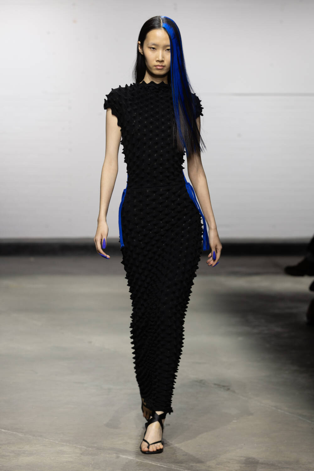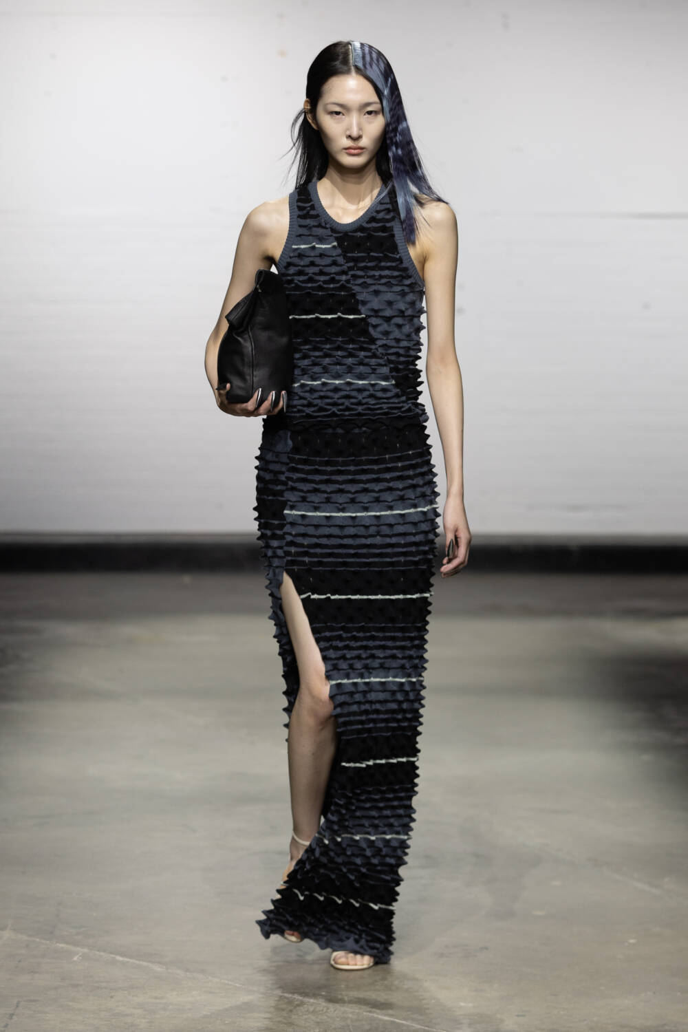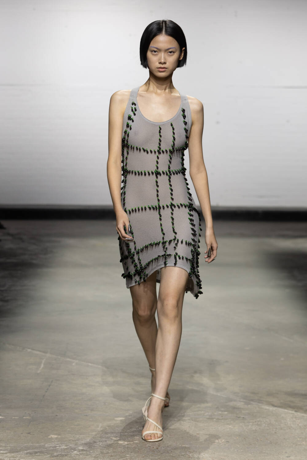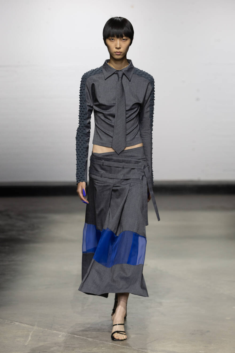 Titled ‘Mai’s Blossom,’ the collection charted her career journey from computer sciences to digital media, eventually becoming an artist and educator. Corporate chic appeared via workwear fabrics that were spliced with Lo’s signature spiky material while a ‘glitch’ pattern – his take on plaid – brought URL to IRL. A grown-up evolution of what we’ve seen to date from the Fashion East alum, Lo’s SS25 collection finished with a duo of sparkling looks – cascading beads that crackled as the models swished by.