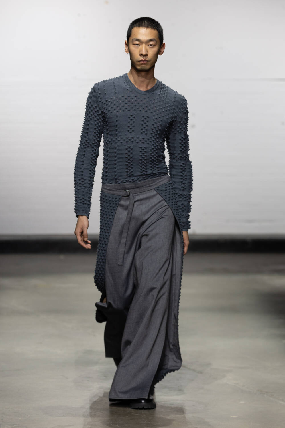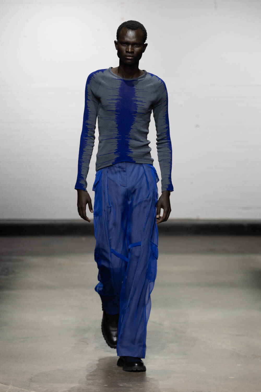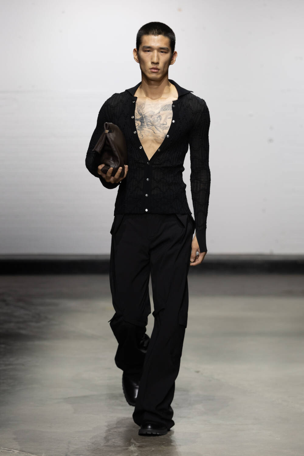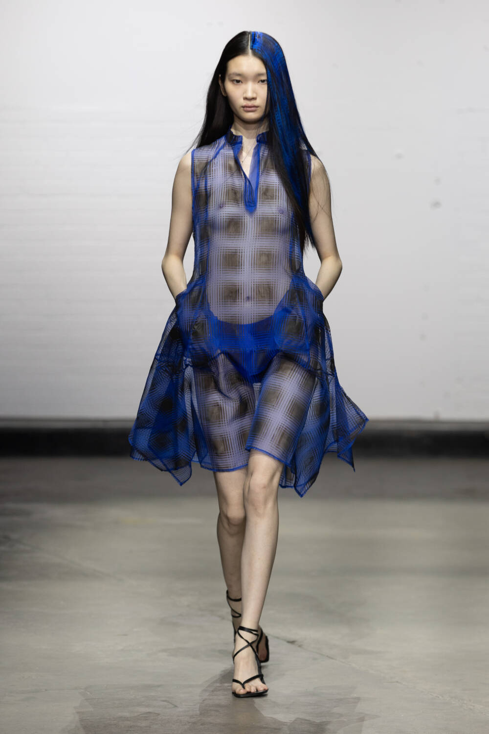 Titled ‘Mai’s Blossom,’ the collection charted her career journey from computer sciences to digital media, eventually becoming an artist and educator. Corporate chic appeared via workwear fabrics that were spliced with Lo’s signature spiky material while a ‘glitch’ pattern – his take on plaid – brought URL to IRL. A grown-up evolution of what we’ve seen to date from the Fashion East alum, Lo’s SS25 collection finished with a duo of sparkling looks – cascading beads that crackled as the models swished by.