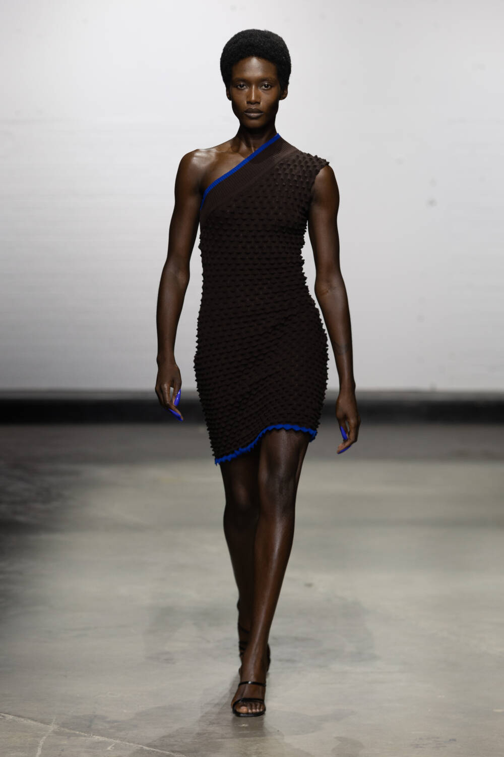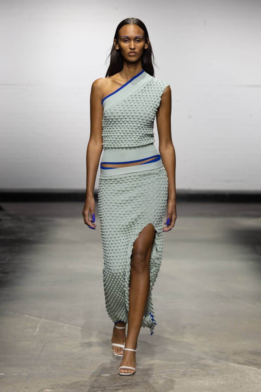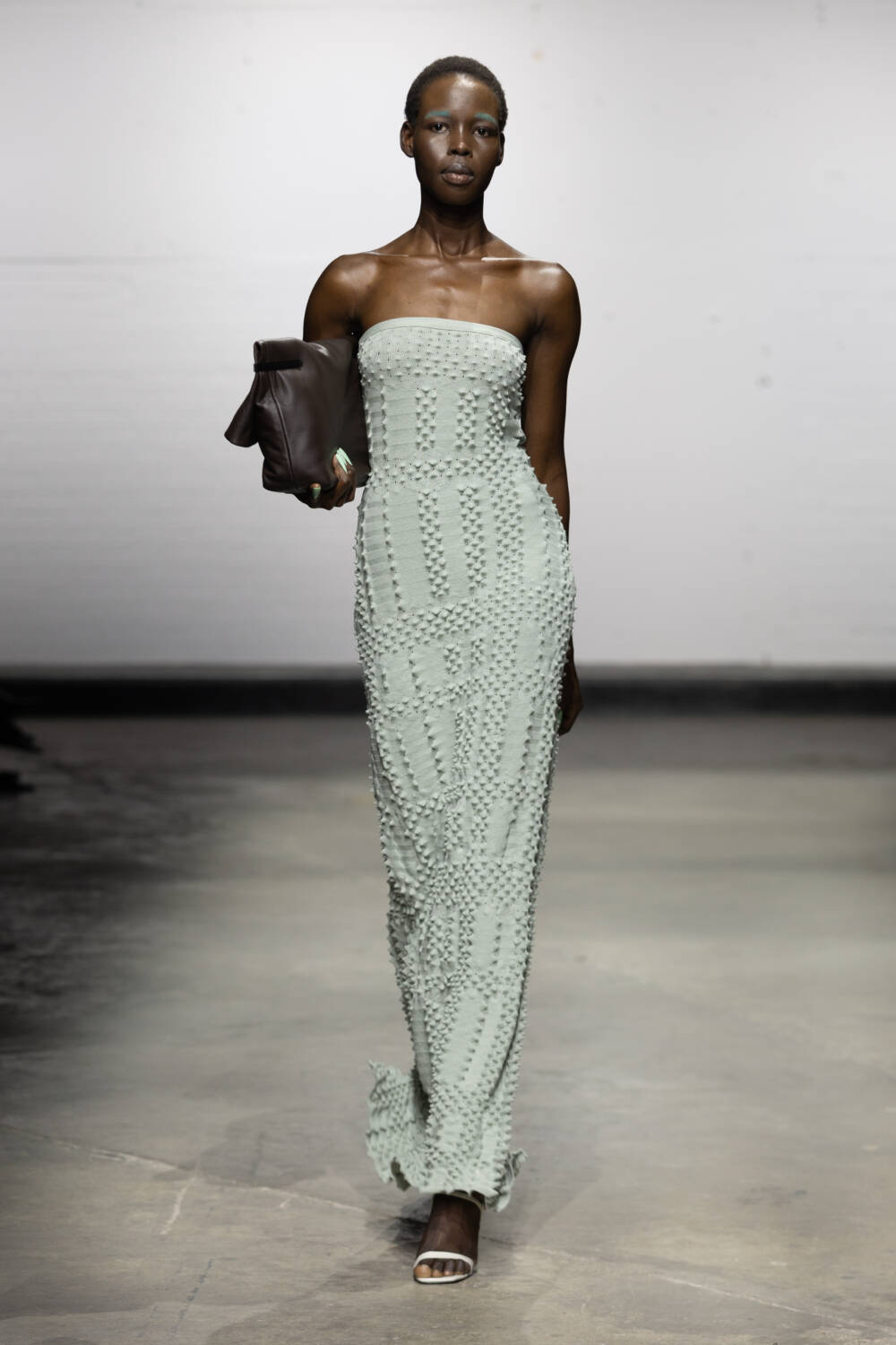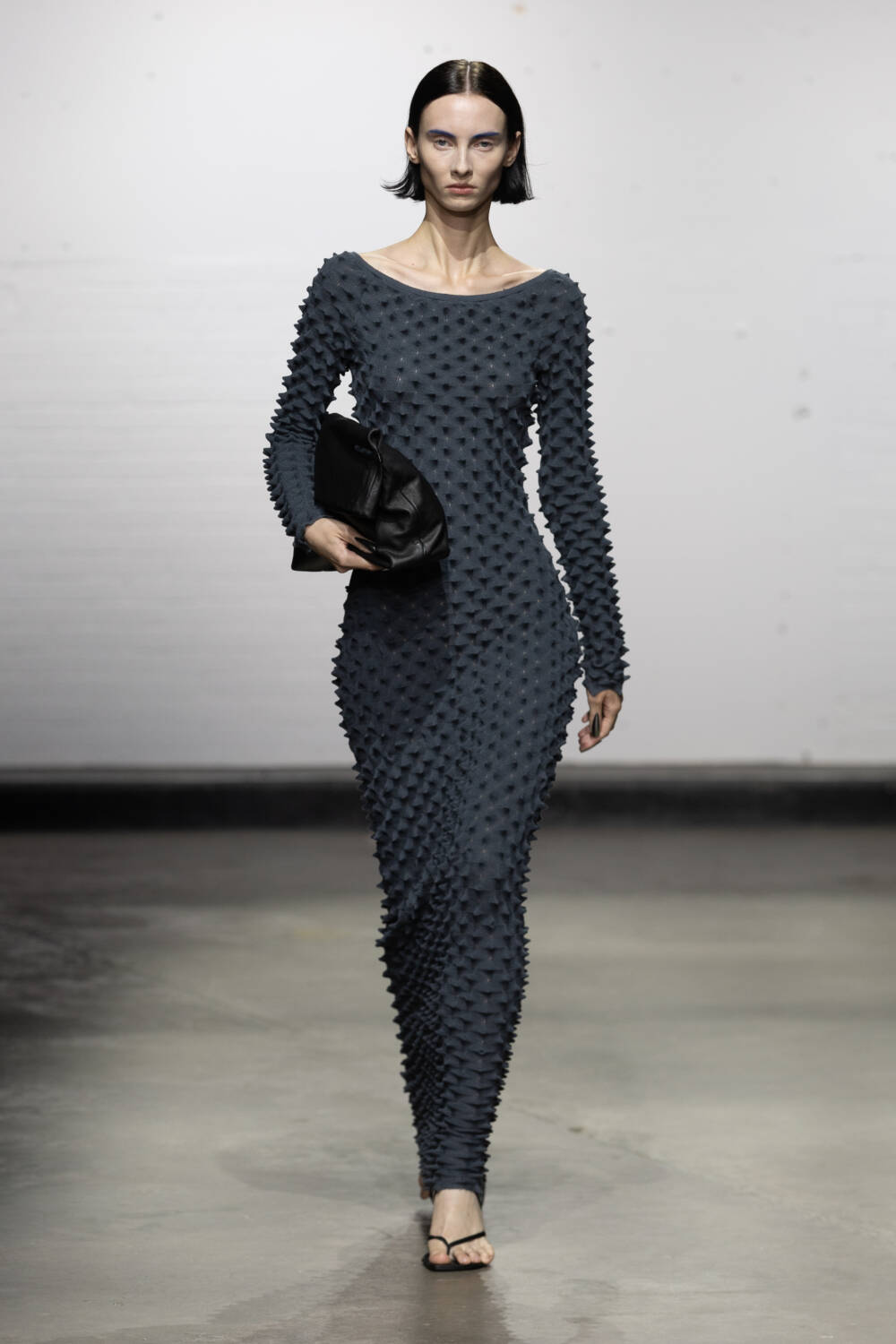 Titled ‘Mai’s Blossom,’ the collection charted her career journey from computer sciences to digital media, eventually becoming an artist and educator. Corporate chic appeared via workwear fabrics that were spliced with Lo’s signature spiky material while a ‘glitch’ pattern – his take on plaid – brought URL to IRL. A grown-up evolution of what we’ve seen to date from the Fashion East alum, Lo’s SS25 collection finished with a duo of sparkling looks – cascading beads that crackled as the models swished by.