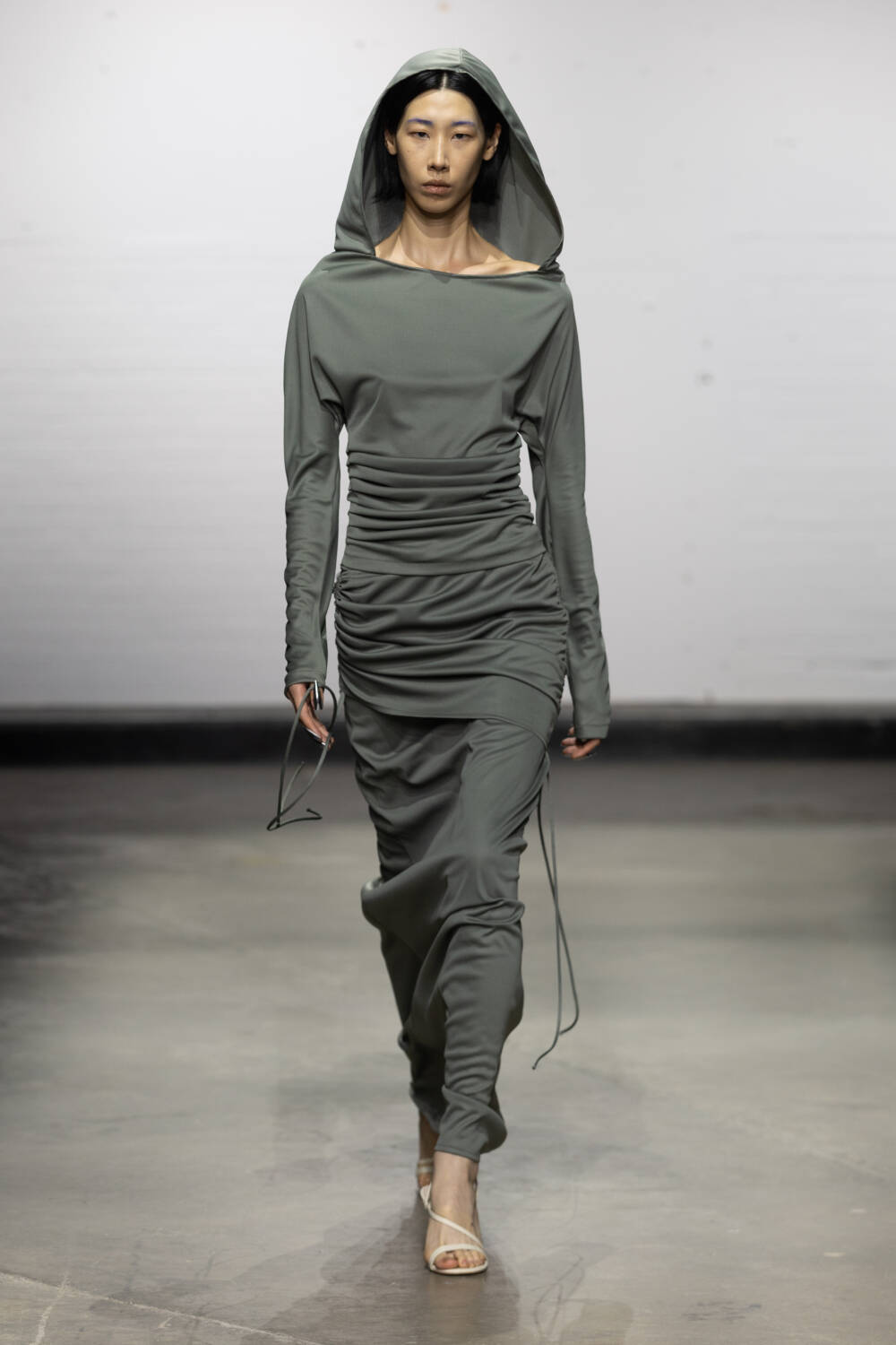 “‘Mai’s Blossoms’ is not just a collection but a narrative woven into fabric, a tribute to a woman who embodies reinvention,” the designer shared in the show notes. “It invites you to reflect on the powerful interplay between memory and identity, technology and art, strength and softness.”