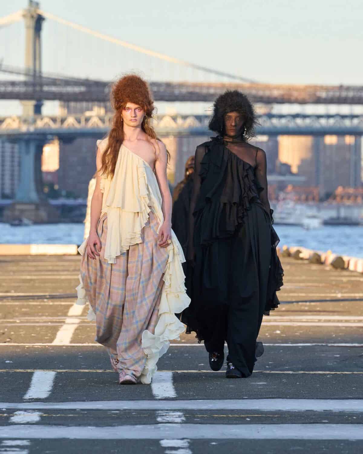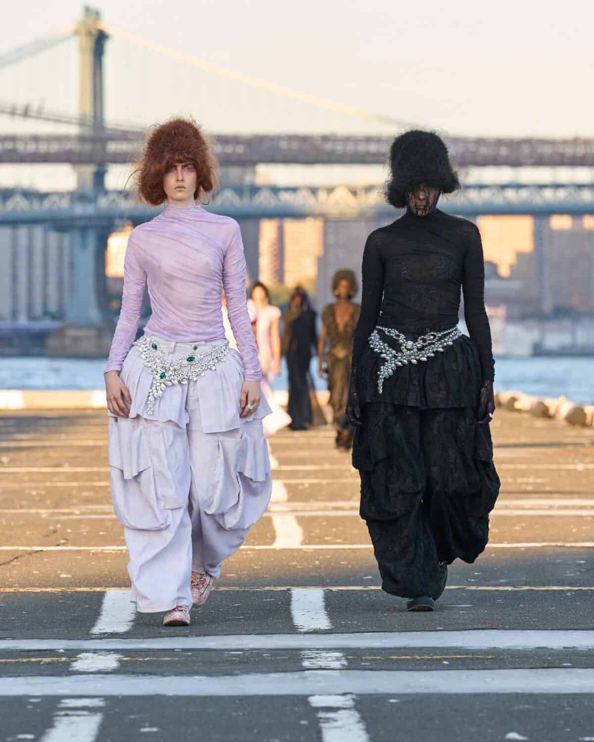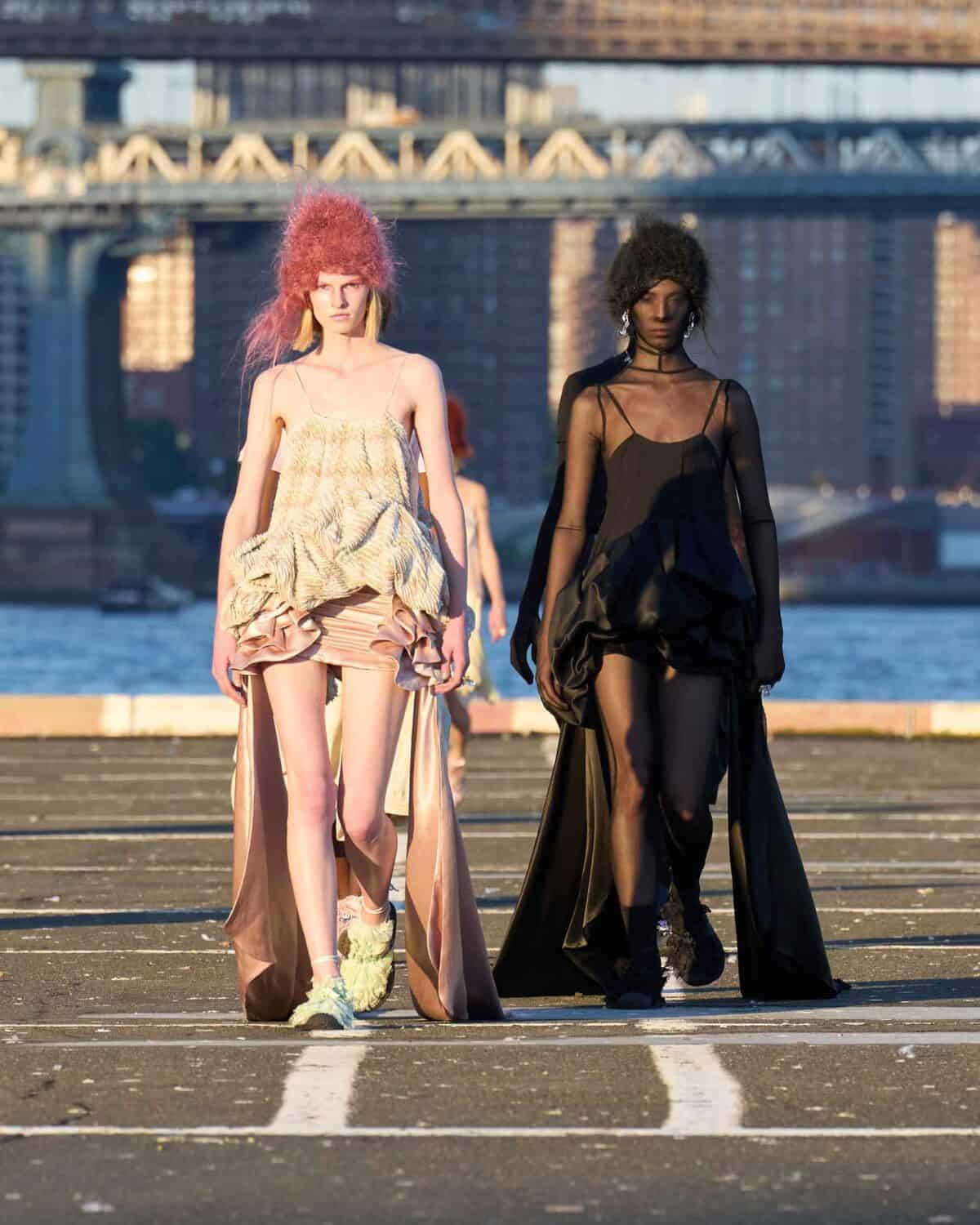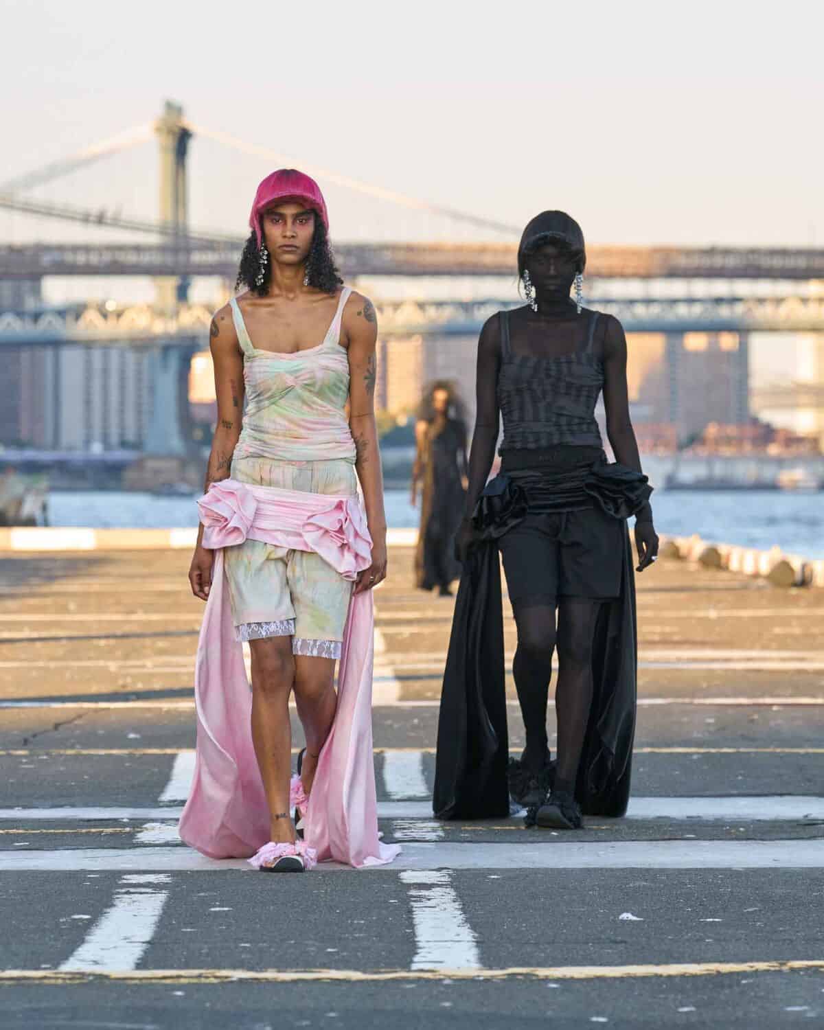 See it, like it? Well, let’s run it back– but this time in black. Under an end-of-summer sun that seemed to flood the East River Pier’s concrete helipad with golden light, seeing double was the motto for Collina Strada’s spring 2026 collection. This was a show about duality and tethers, playing up the duet between the shadow and light of Plath’s Persephones; for every Mario has its Wario, every white swan its black mirror image.
