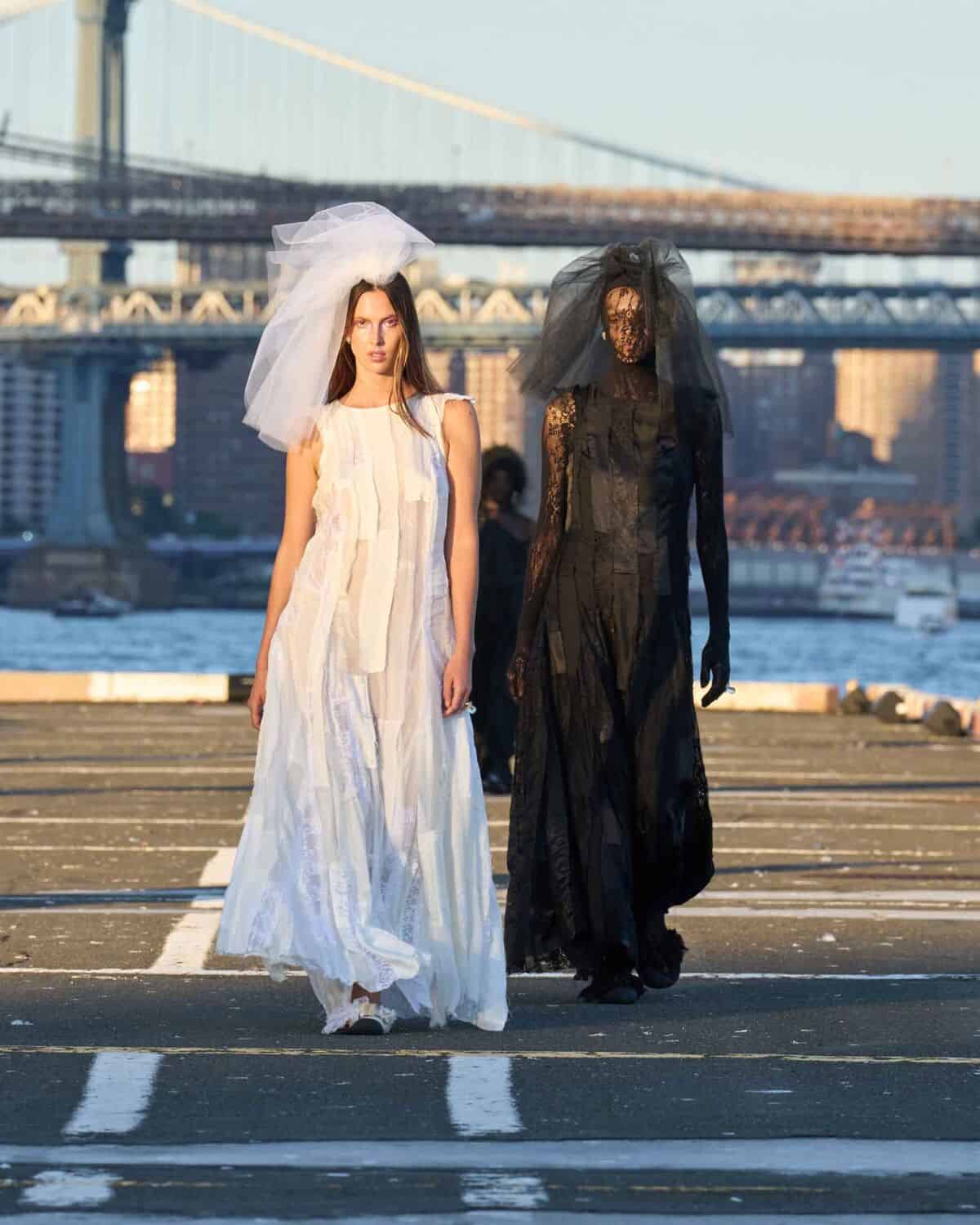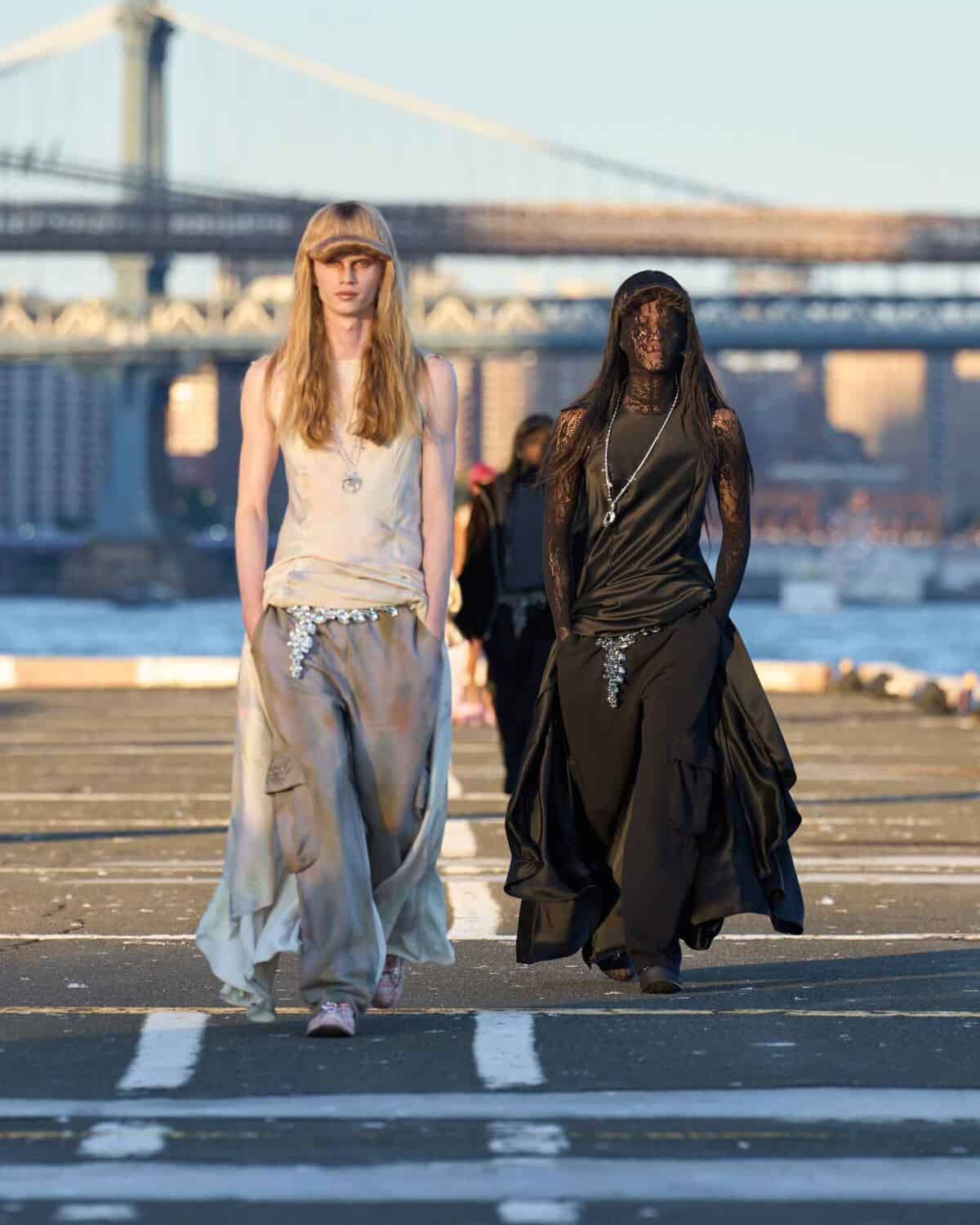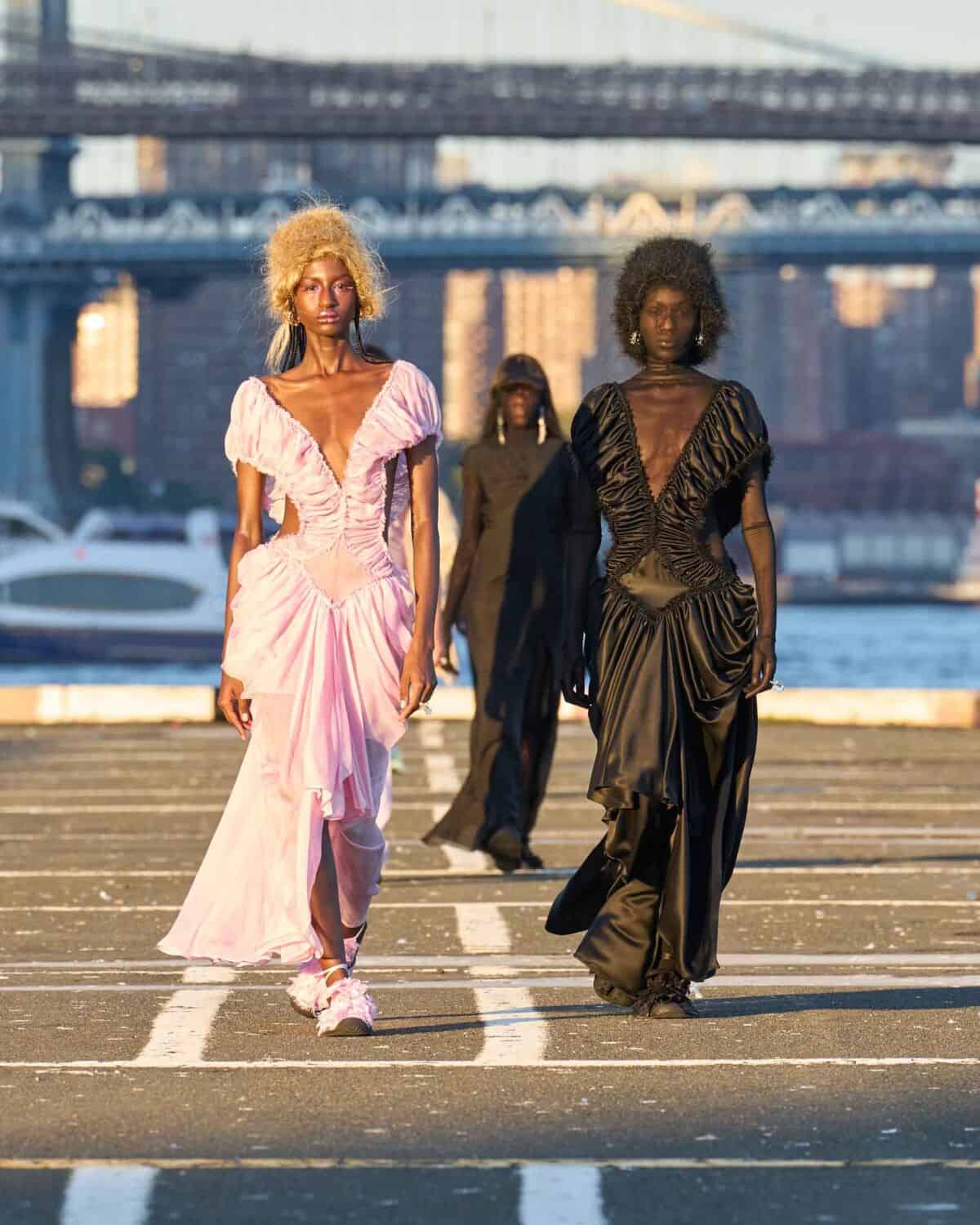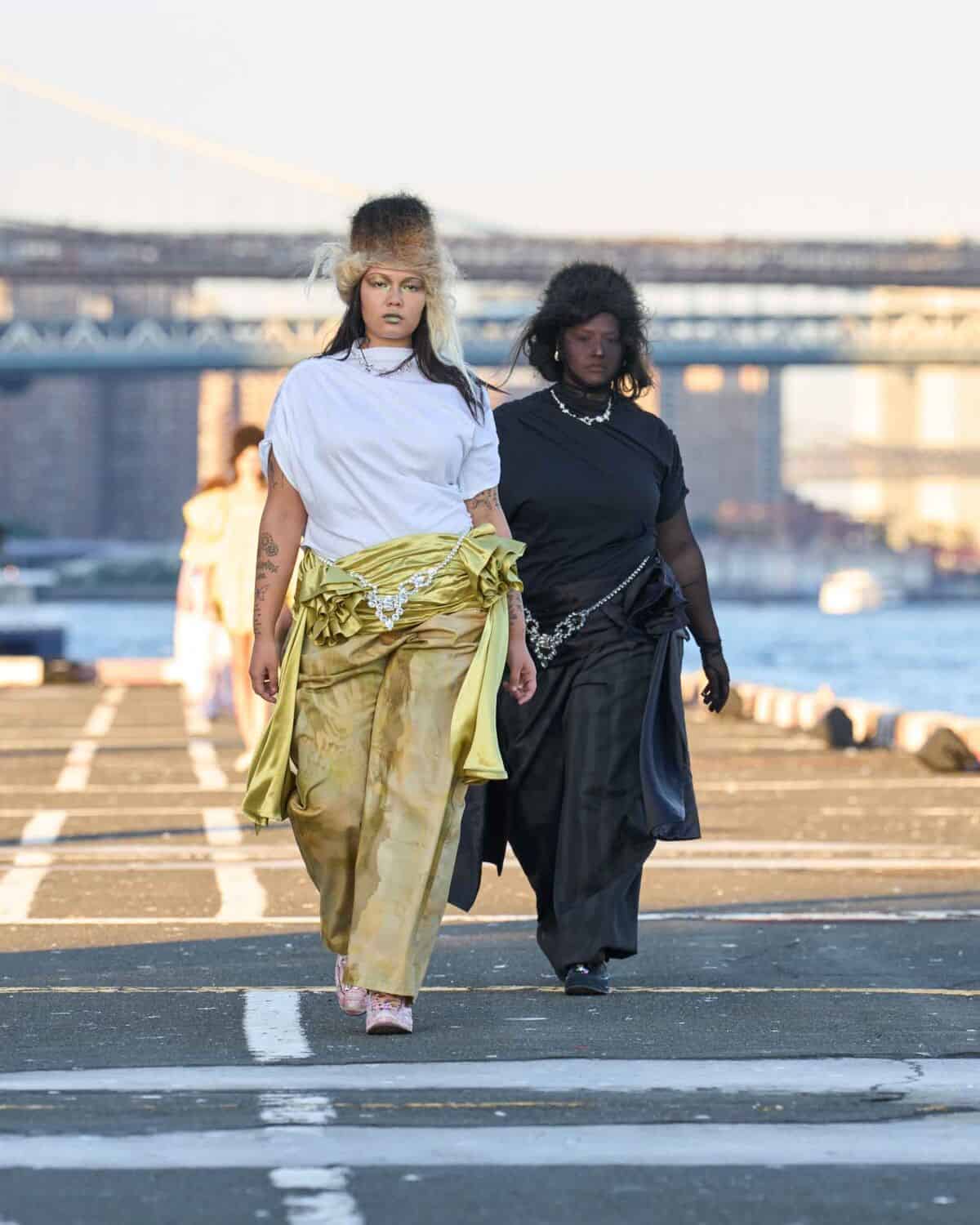 See it, like it? Well, let’s run it back– but this time in black. Under an end-of-summer sun that seemed to flood the East River Pier’s concrete helipad with golden light, seeing double was the motto for Collina Strada’s spring 2026 collection. This was a show about duality and tethers, playing up the duet between the shadow and light of Plath’s Persephones; for every Mario has its Wario, every white swan its black mirror image.
