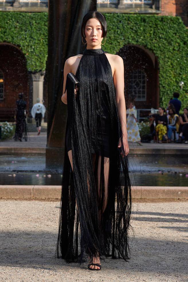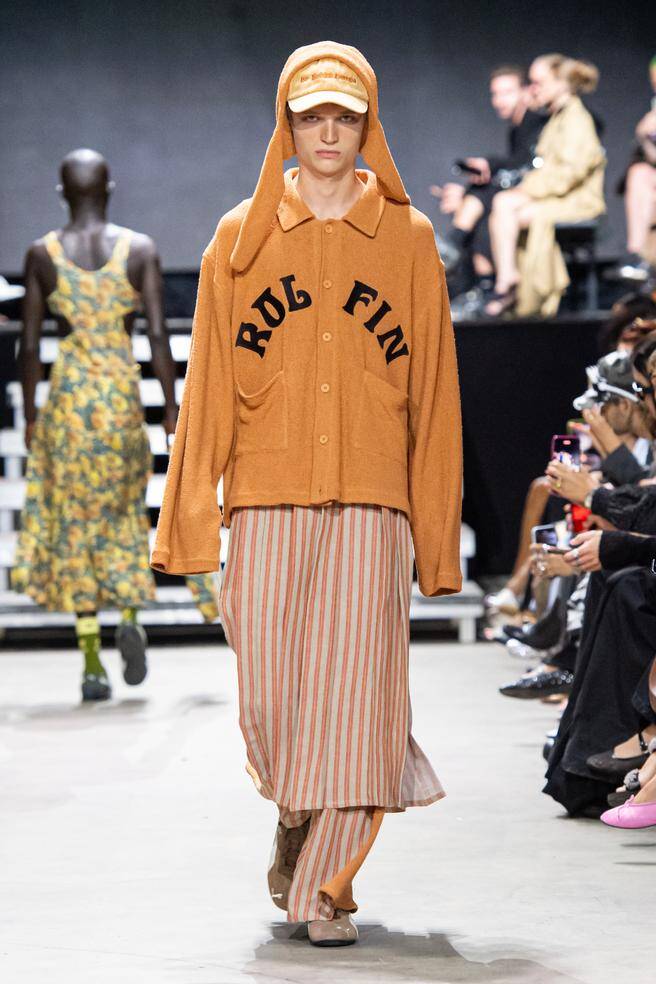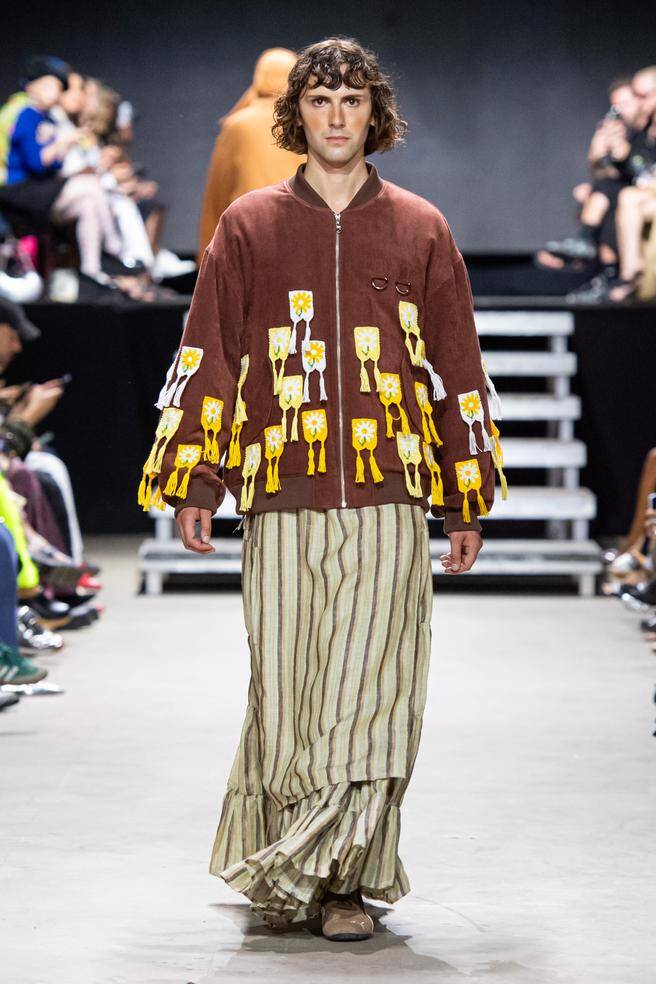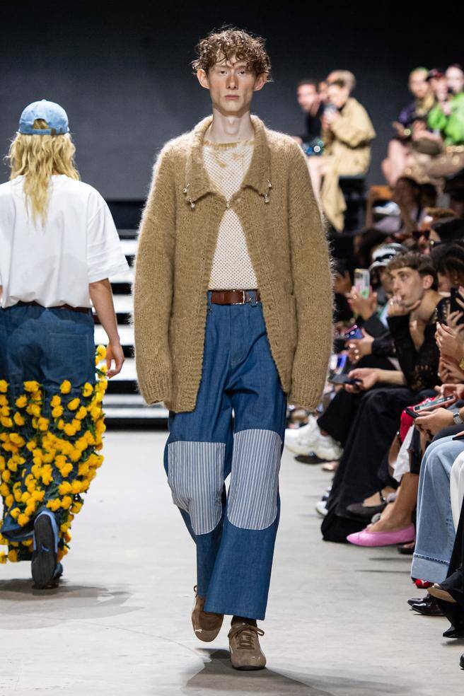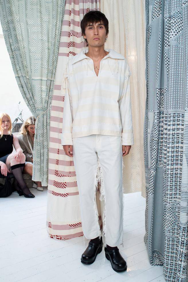 In another warehouse-like setting, Rolf Ekroth brought out a slew of flowering dresses shown on all genders, plus a pair of dandelion jeans embellished with over 250 hours worth of handmade knitted flowers. “Every season I feel I’ve been getting more and more comfortable with showing my roots,” says the designer, who founded his brand right before the pandemic. The collection was based on the historic Finnish dance concept Lavatanssit. “People gathered at these dances, drank a lot, danced and went home alone or with a couple. I wanted to start off with a bit of a more happy, Finnish look that sort of showed people getting ready for the dance, like having flowers and decorating themselves. And then came the more serious part.” Some of the models strolled down the runway with a trail of tears below one eye. “There is a very dark sense of humor that we have In Finland,” added Ekroth, of the oddly satisfying tactile creations and the related inside joke Finnish people have about how many people will end up drowning each year due to drunkenness. T-shirt dresses and crochet sweaters came pierced with little silver hoops in collaboration with the historic Finnish jewelry brand Kalevala.