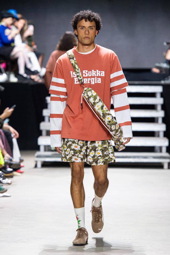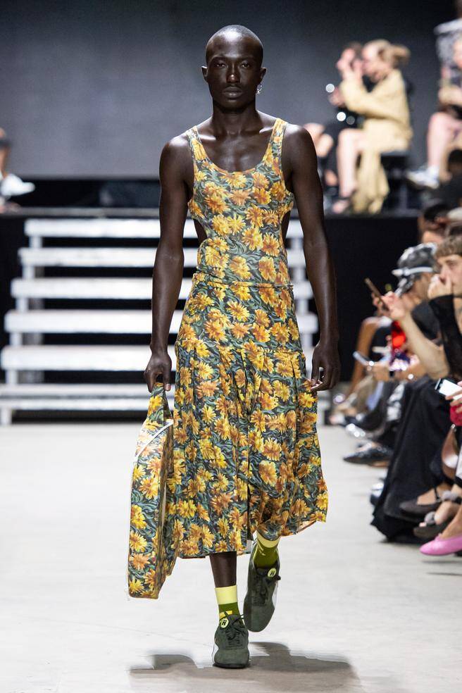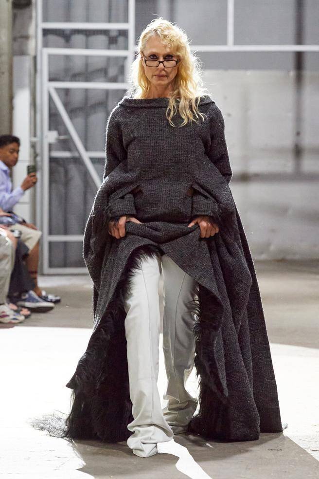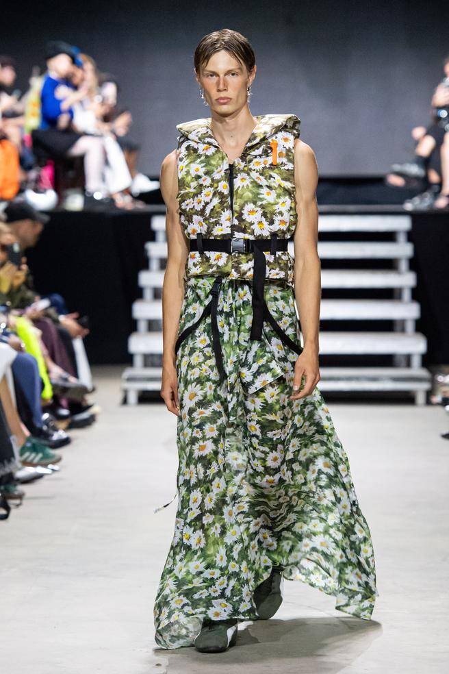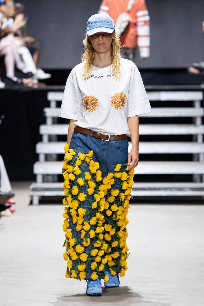In another warehouse-like setting, Rolf Ekroth brought out a slew of flowering dresses shown on all genders, plus a pair of dandelion jeans embellished with over 250 hours worth of handmade knitted flowers. “Every season I feel I’ve been getting more and more comfortable with showing my roots,” says the designer, who founded his brand right before the pandemic. The collection was based on the historic Finnish dance concept Lavatanssit. “People gathered at these dances, drank a lot, danced and went home alone or with a couple. I wanted to start off with a bit of a more happy, Finnish look that sort of showed people getting ready for the dance, like having flowers and decorating themselves. And then came the more serious part.” Some of the models strolled down the runway with a trail of tears below one eye. “There is a very dark sense of humor that we have In Finland,” added Ekroth, of the oddly satisfying tactile creations and the related inside joke Finnish people have about how many people will end up drowning each year due to drunkenness. T-shirt dresses and crochet sweaters came pierced with little silver hoops in collaboration with the historic Finnish jewelry brand Kalevala.