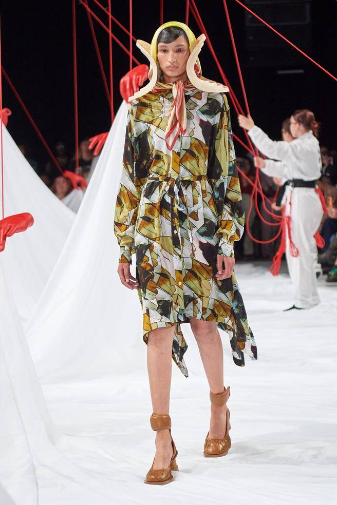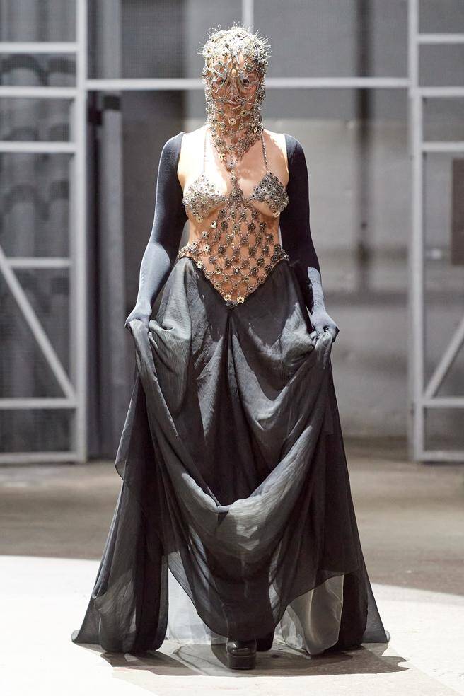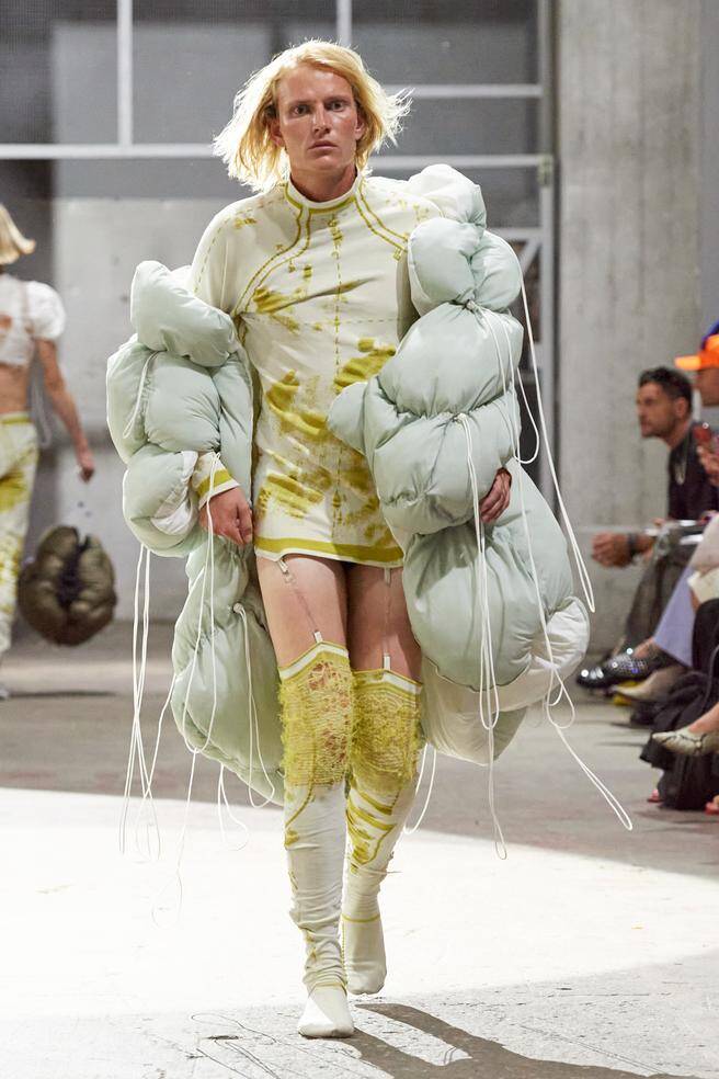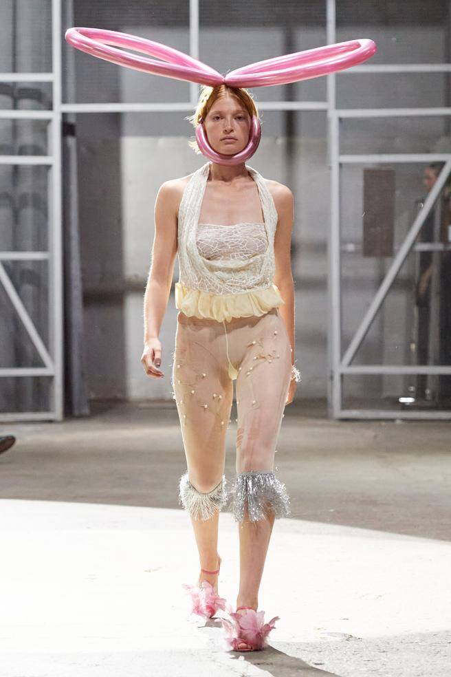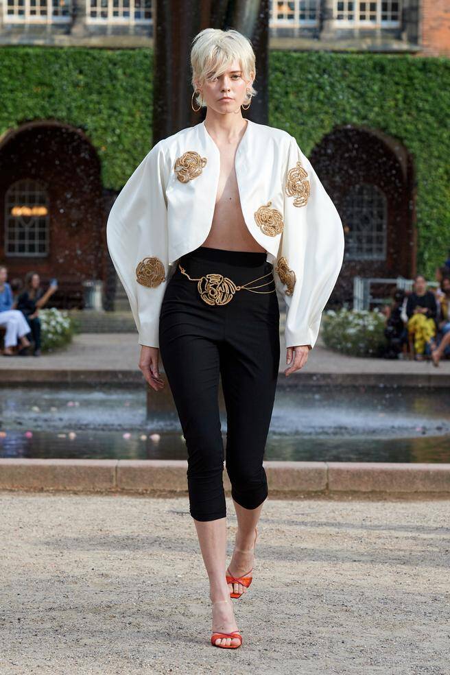 Other highlights to note? With sculpted silver metal bustiers and Mean Girls-esque boob cut-out tops at Forza Collective, there was no shortage of weirdly good silhouettes at Copenhagen fashion week this season. Rotate closed Copenhagen Fashion Week with a slew of party dresses and baby-sized bloomers, plus tops and dresses covered in cascades of Pandora jewelry reworked by the rising jewelry artist Grete Henriette who turns jewelry into dresses. In one case, she took 2,000 Pandora tennis bracelets and created a fringed dress. Henrik Vibskov, who might just be the king of Copenhagen weird for his bizarre fashion week set-ups (like a 20-foot-tall person with many hands in the past) staged a show that had multiple people dressed as mechanics controlling plastic hands that lifted mountains and valleys of white sheets for models to walk over.