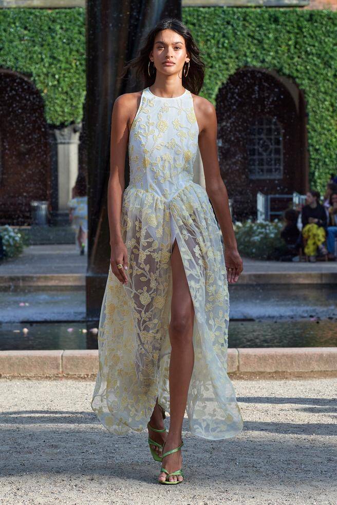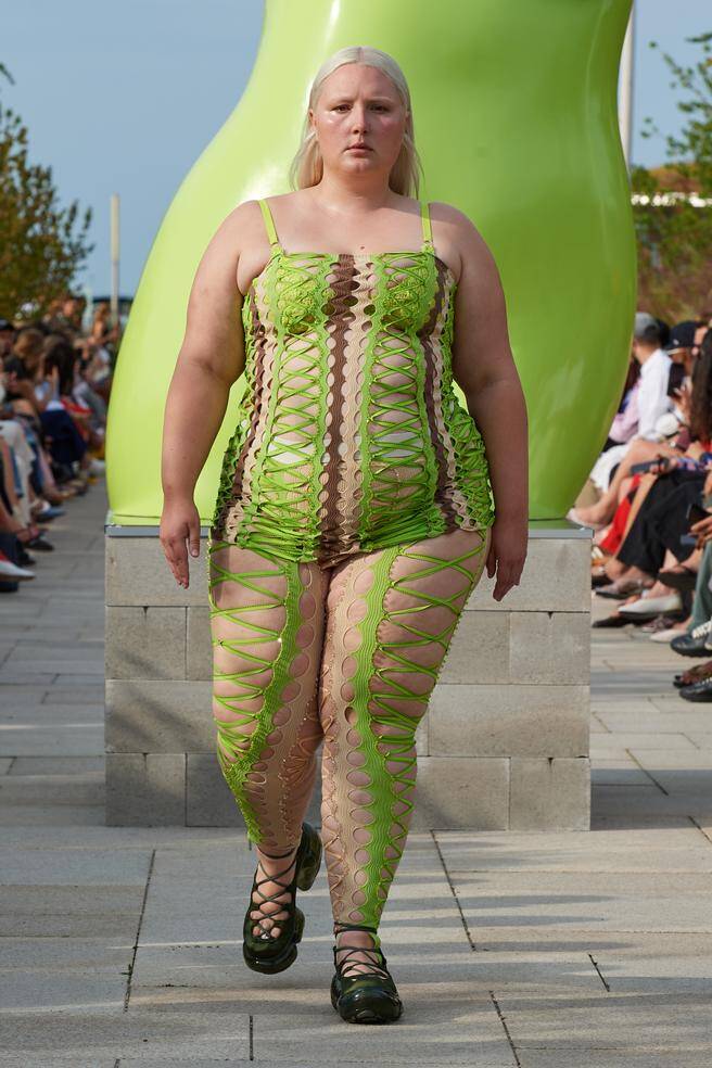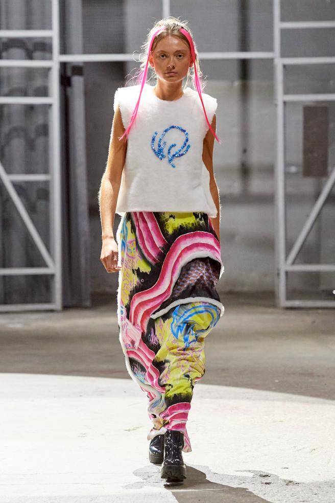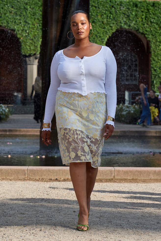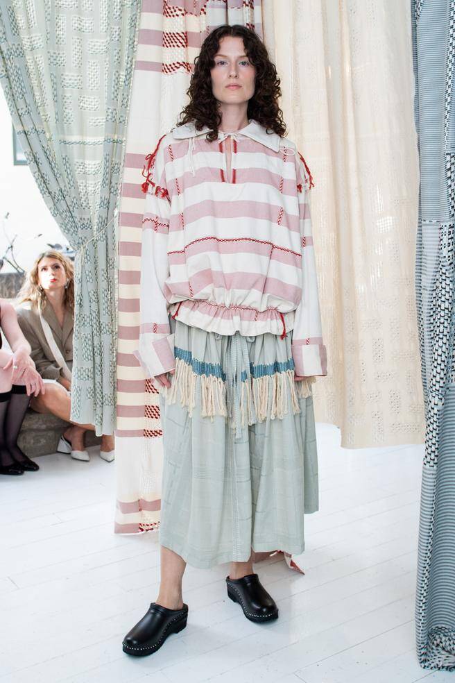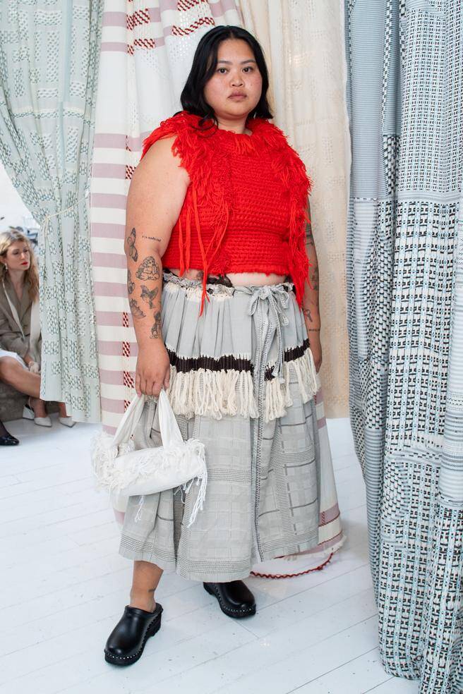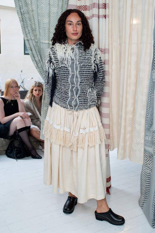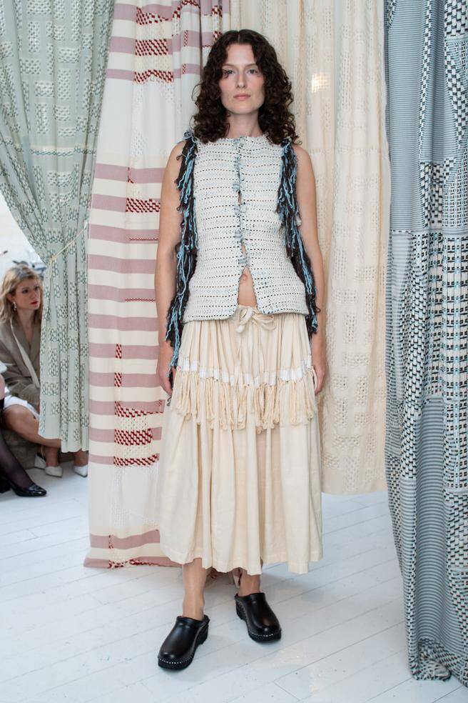 Stem was another brand that challenged the norm this season. Launched in 2021 by the textile designer and weaver Sarah Brunnhuber, the 12-piece collection is zero waste and made up entirely out of natural materials. “This particular collection, which is called the Pulling Collection, is based on the pulling technique, which is a new sort of weaving and fabric manipulation that developed the past two years,” says Brunnhuber. “It’s similar to smocking in that it pulls and gathers to shape the fabric. It’s woven industrially in Italy and then I hand pull a knot to create the garments.” The result? A couple really covetable mini skirts that are textural wonderlands that speak to the tactile part of our soul. These were clothes that made you want to reach out and touch them.