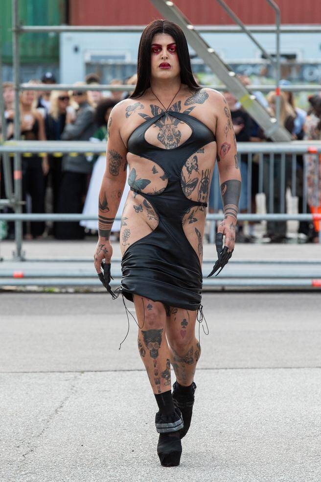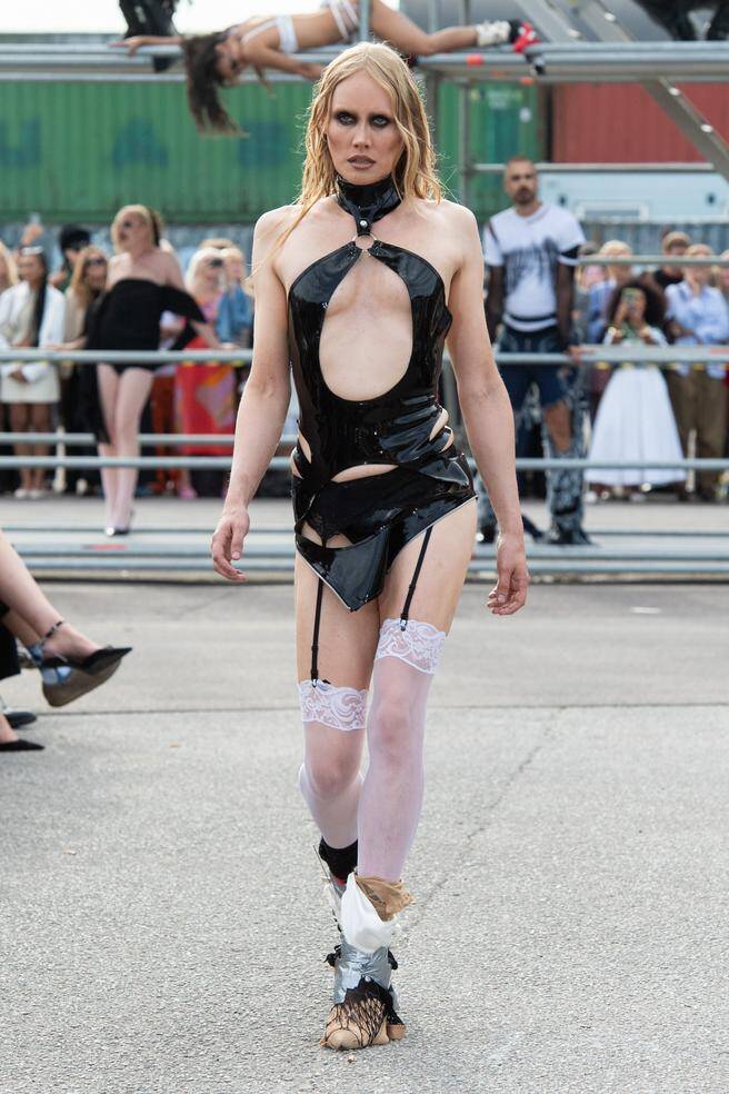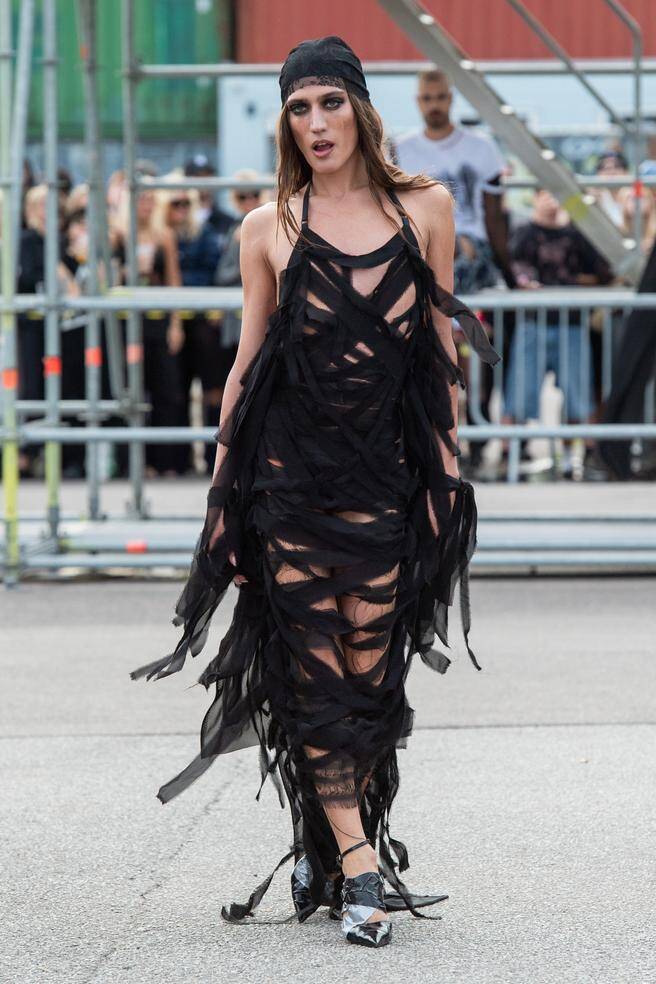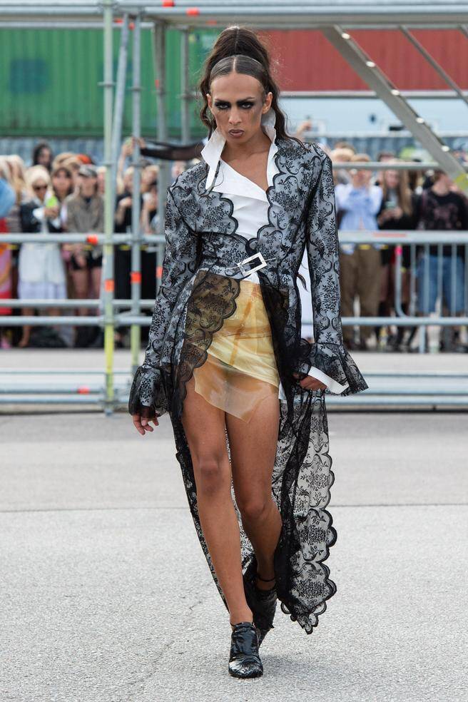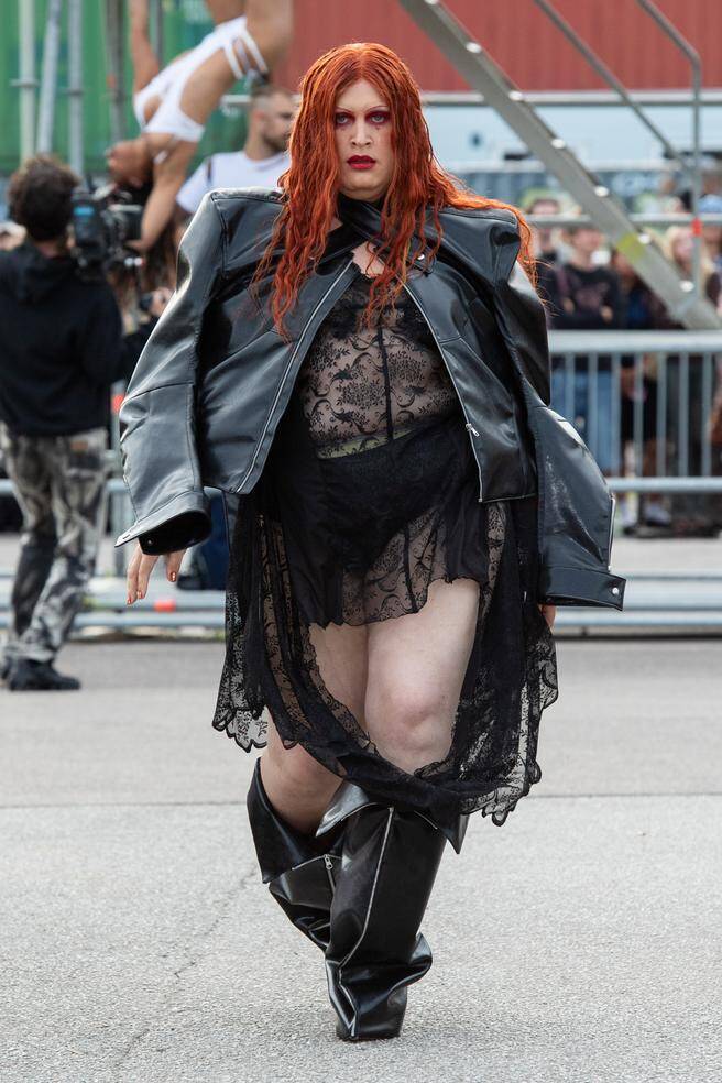 As for the clothes? They all explored the intrepid idea of intimacy, from nightgowns to skin-baring get-ups and distressed ruffled jackets, as well as other pieces titled “Tortured Rose.” Rothschild/Masculina’s show felt more akin to something you’d see in Brooklyn, but with a unique kind of twist that could only happen in Copenhagen. As that motorcycle twirled around the runway, electric Polestar cars whooshed by the edge of the venue and the sun faded in the distance over a warehouse-like building painted with the phrase “Copenhell”.