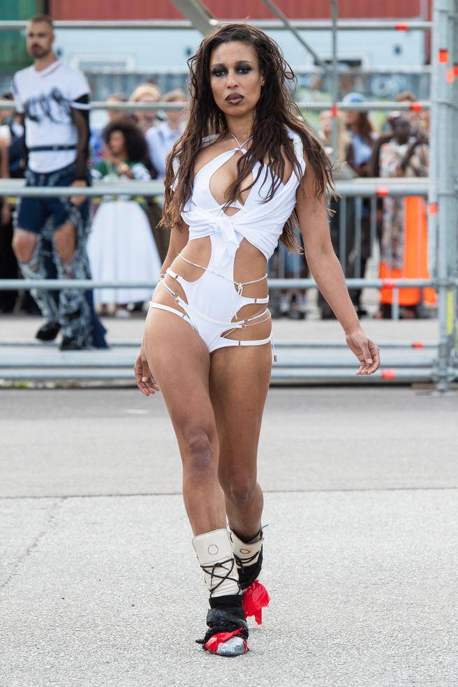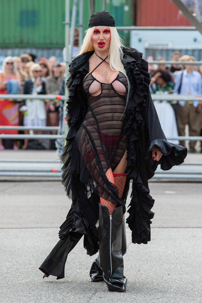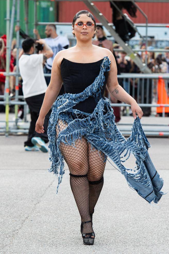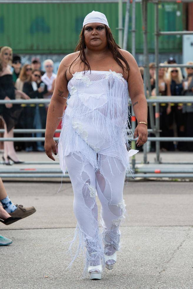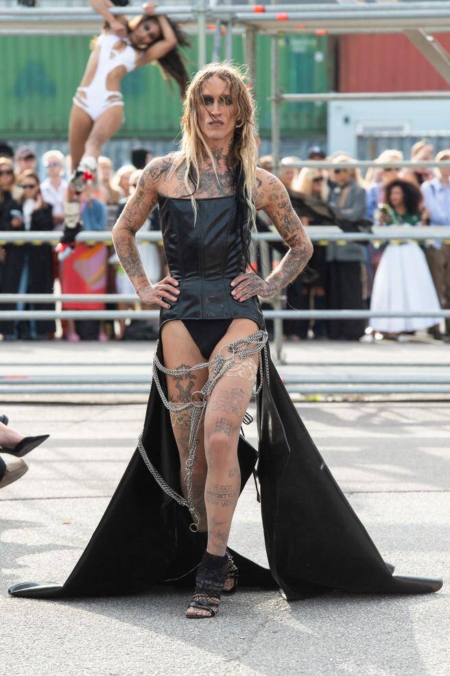 As for the clothes? They all explored the intrepid idea of intimacy, from nightgowns to skin-baring get-ups and distressed ruffled jackets, as well as other pieces titled “Tortured Rose.” Rothschild/Masculina’s show felt more akin to something you’d see in Brooklyn, but with a unique kind of twist that could only happen in Copenhagen. As that motorcycle twirled around the runway, electric Polestar cars whooshed by the edge of the venue and the sun faded in the distance over a warehouse-like building painted with the phrase “Copenhell”.