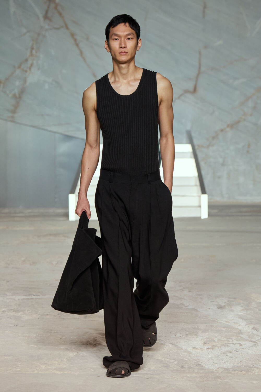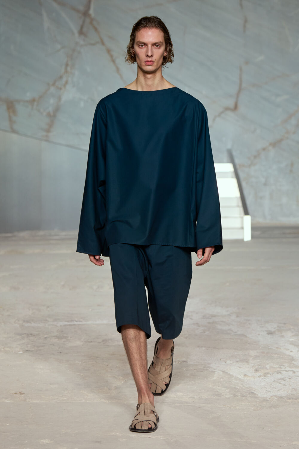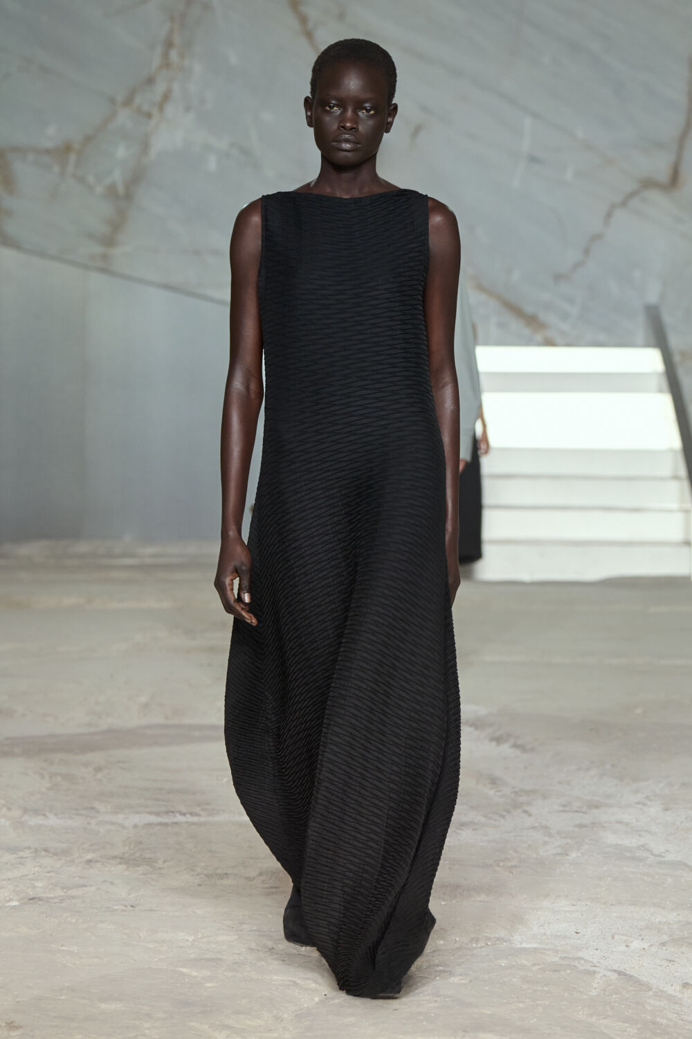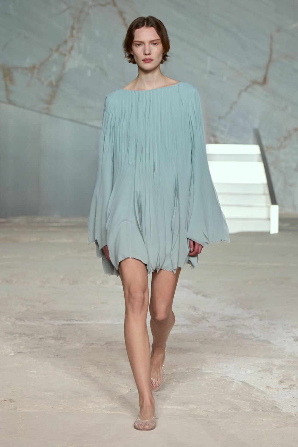 The quarry has an important place in Athens’ structure, sourcing the same premium marble that went into building the Acropolis citadel in ancient times. Its cavernous structure was a delightful contrast to the clean shapes of the collection, which the designer noted were a dance “between structure and fluidity, strength and softness”.
