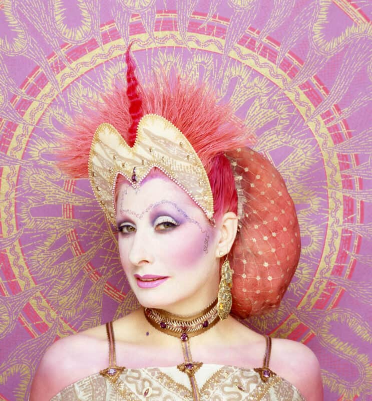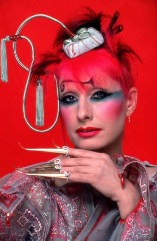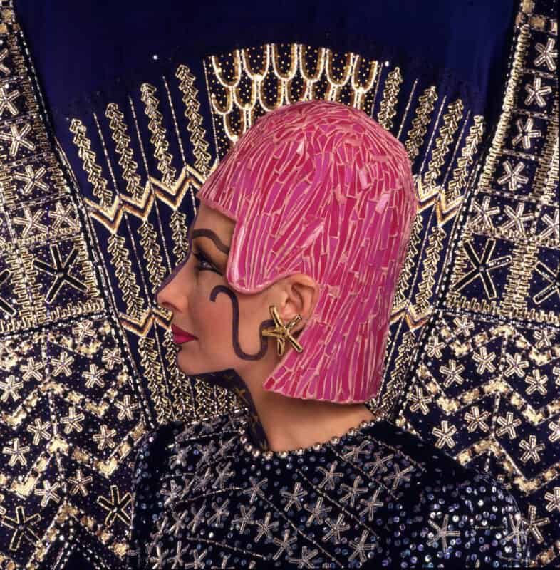 Zandra Rhodes poses for her Medieval collection poster, 1983