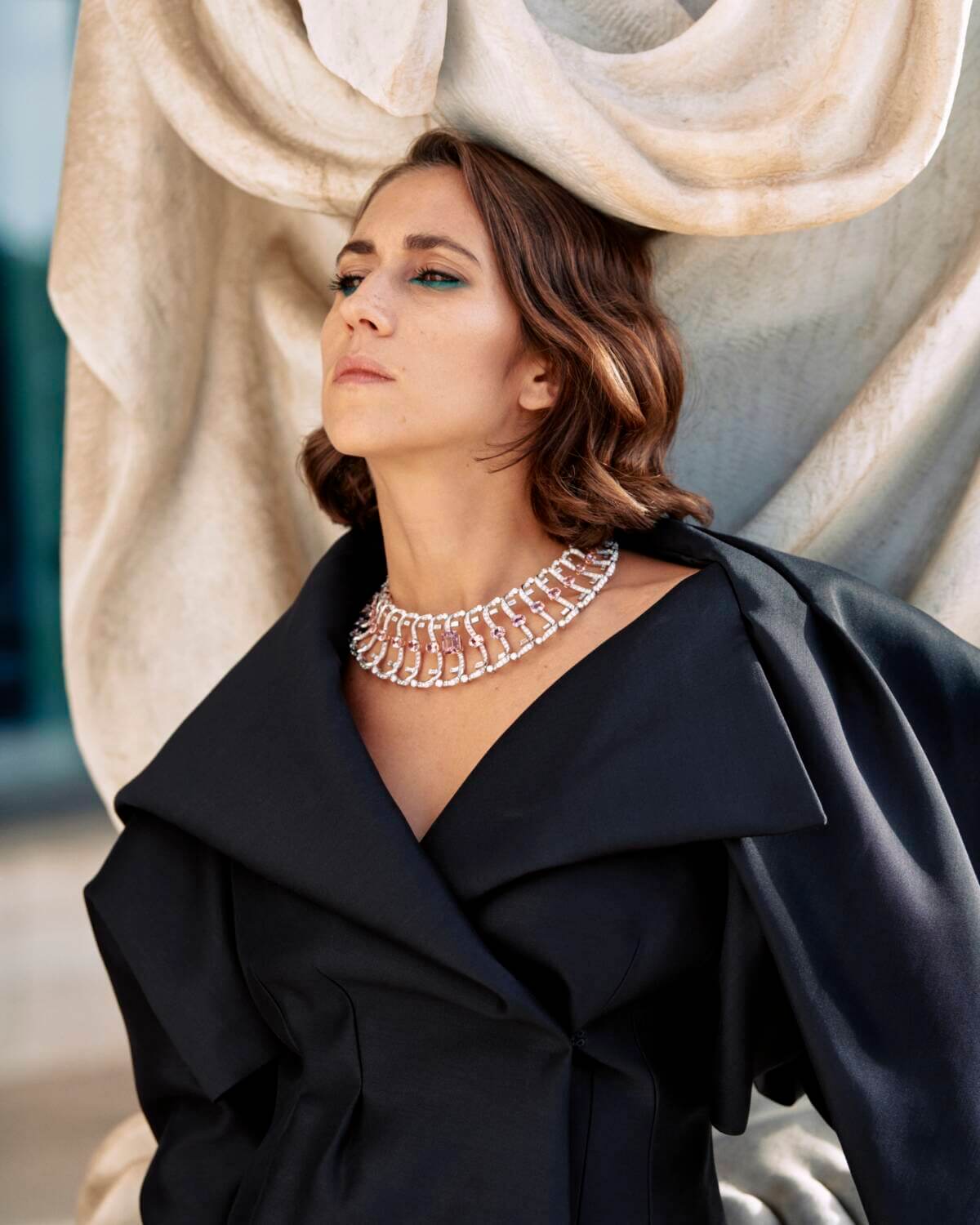 It comes as no surprise, then, that the ‘FF’ motif is repeated throughout the Fendi Triptych collection. “I have a natural attraction towards the logo,” the designer admits. “It’s like my family. There is so much sentiment for me in it, and no matter how you transform it, its strength remains.” By using the line-heavy logo “like a whisper” throughout the design process, she has, in a way, feminised it. The flow of the repeating FFs that shape the Undarum set illustrate Delettrez Fendi’s artistry. They seem to flow around the neck like a song. “The two Fs are like two halves,” she explains. “Sometimes they’re futuristic, sometimes more romantic. In a way, it’s a metaphor for the new kind of dynamism we bring to this jewellery world.” Unlike the tired marketing mantra of ‘jewels for powerful women’, Delettrez Fendi’s design vision speaks in the altogether less shouty tone of feminine grace. Playing with the logo also got Delettrez Fendi thinking about how she might approach future collections, and she is keen to challenge herself as her high jewellery design journey progresses. “I like the idea of something that is new and exciting but with less, of exploring the negative space. With high jewellery, there’s a tendency to think about adding more – complex techniques, baroque elements, voluminous forms.” Naturally, this high jewellery designer prefers “doing the opposite”, whether around the Fendi logo, the colour palette or the feeling of lightness, of movement.