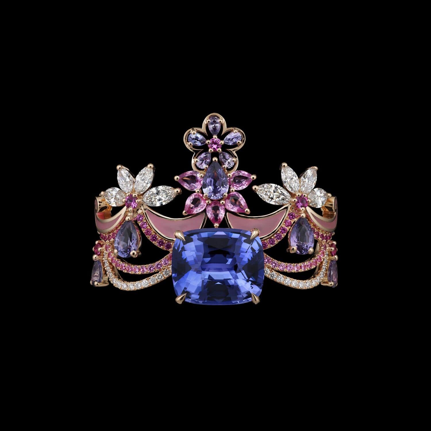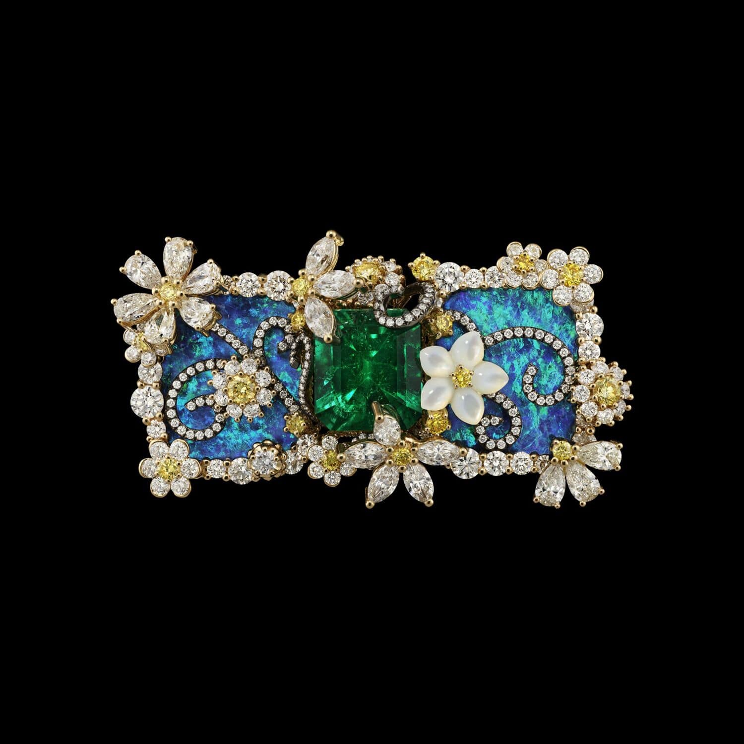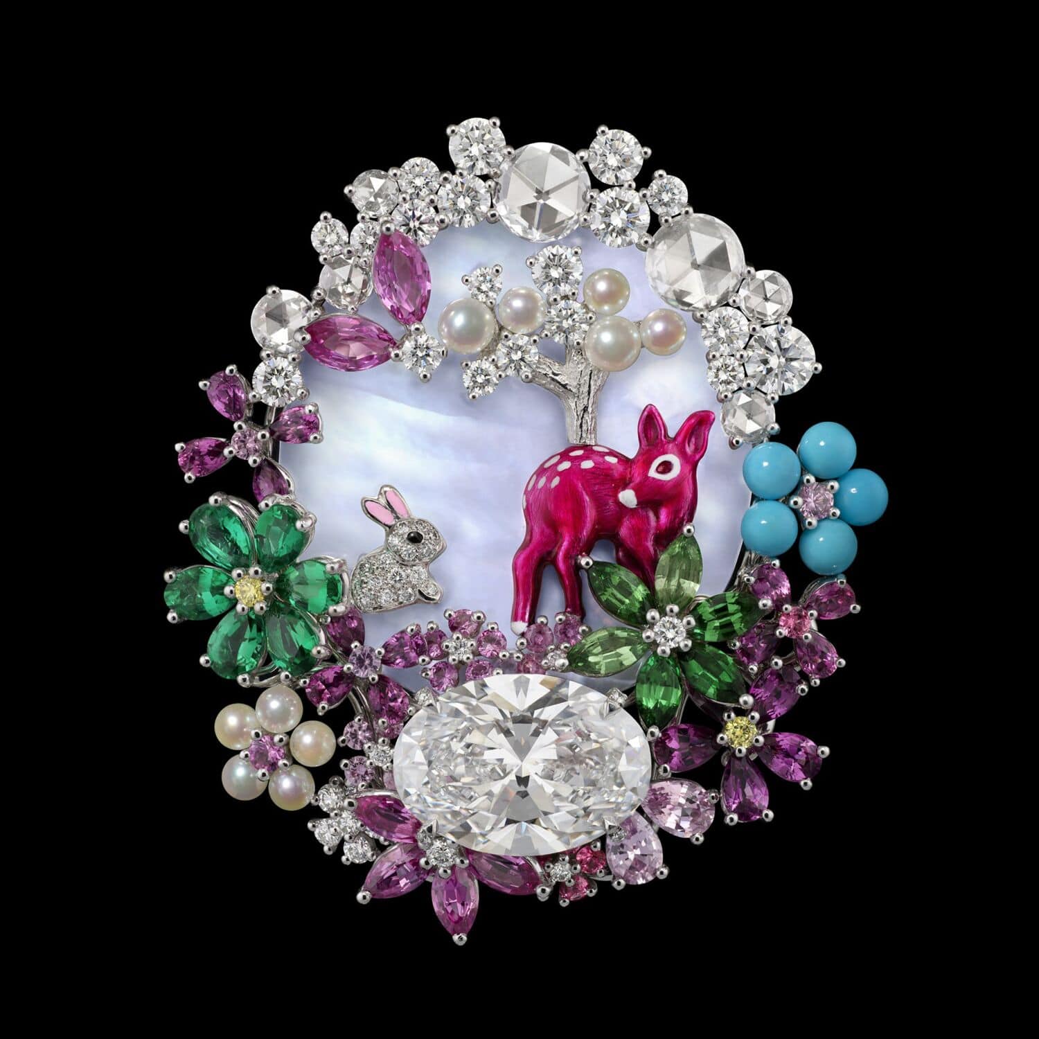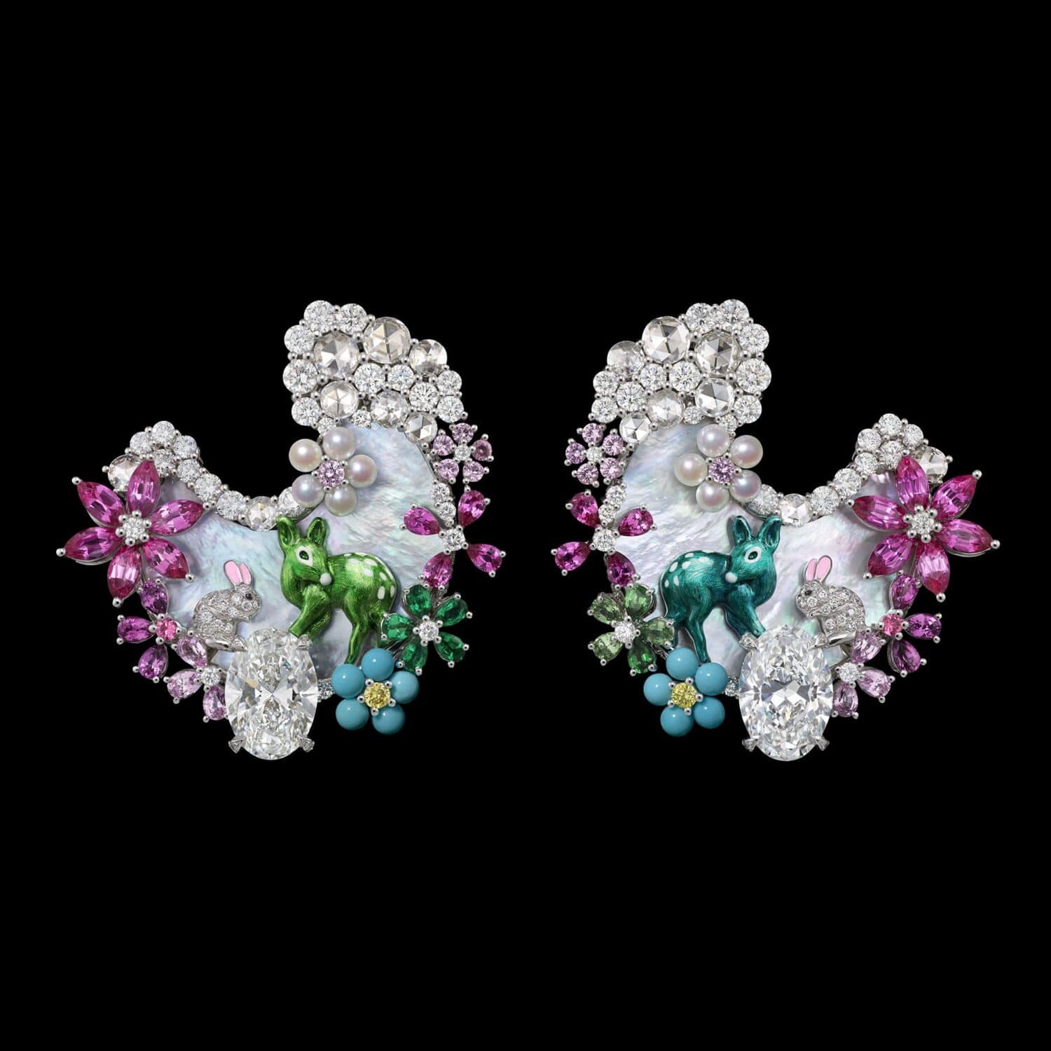 Central to the collection is the opale doublet technique, where opal is layered with onyx or mother-of-pearl to produce mesmerizing hues, reminiscent of sky and water. The result are pieces that transform natural elements into gorgeous displays of color. Further elevating the collection is the plique-à-jour, a hallmark of Dior Joaillerie. This intricate process, similar to crafting miniature stained glass, allows light to pass through a mosaic of lacquered colours, creating an effect that feels vibrant and magical. Given the craftsmanship and attention to detail, it’s no surprise then that the designs appear almost like two-dimensional paintings despite having very three-dimensional gems. But that’s deliberate — they’re little artworks with a sense of childlike whimsy as seen in the pink deer or the rainbow earrings. With everything from brooches to ear cuffs to a tiara, DiorExquis is every bit of the fantasy you’d want from a high jewelry collection.