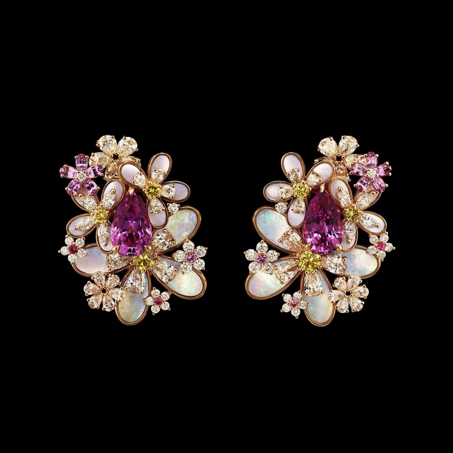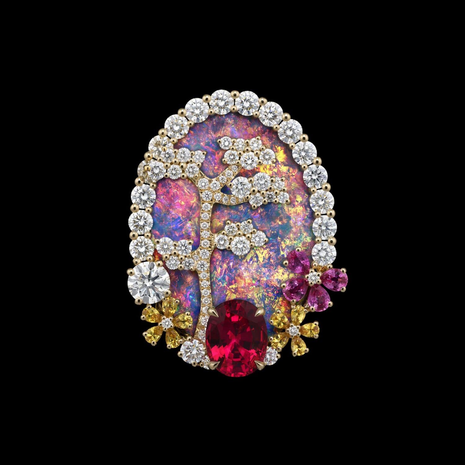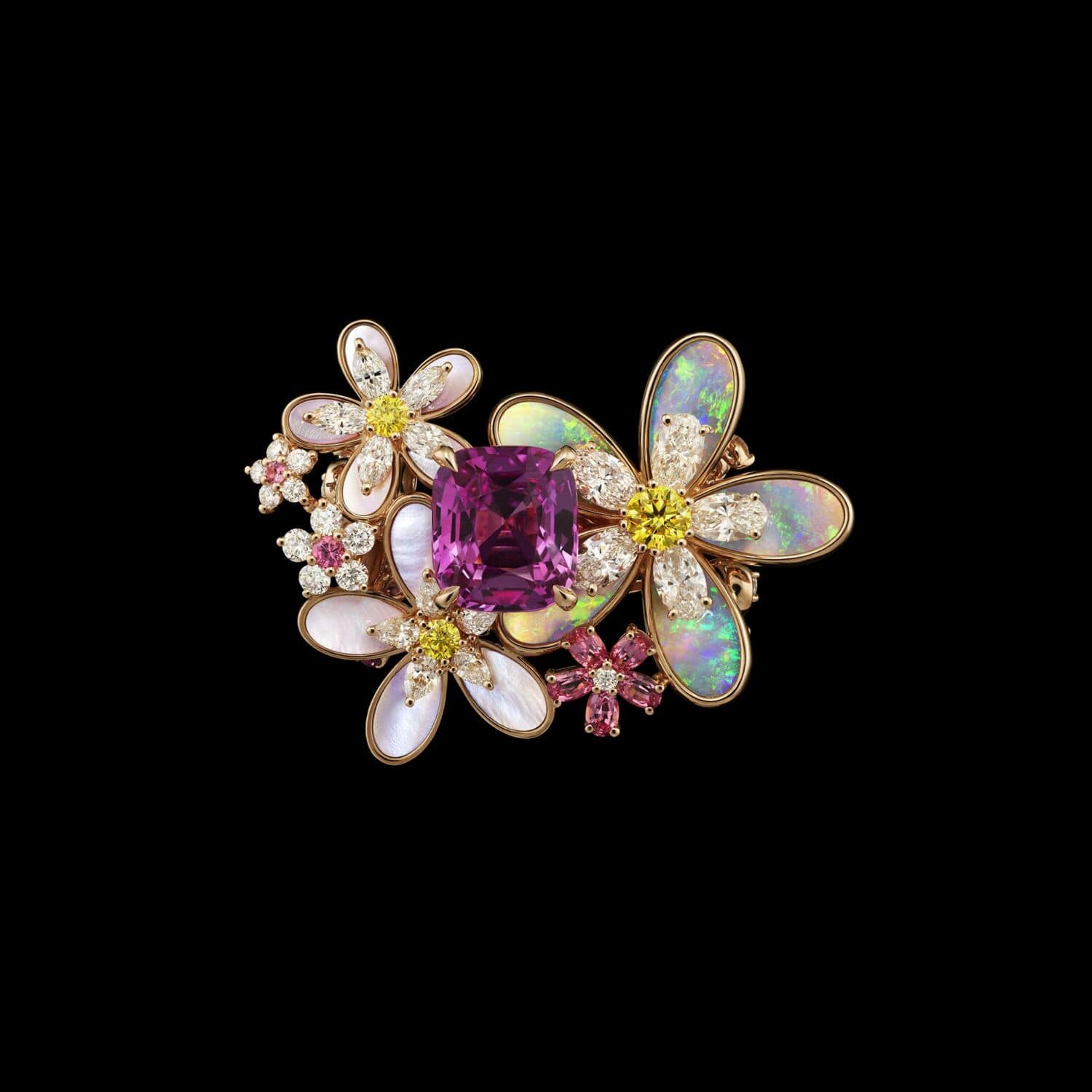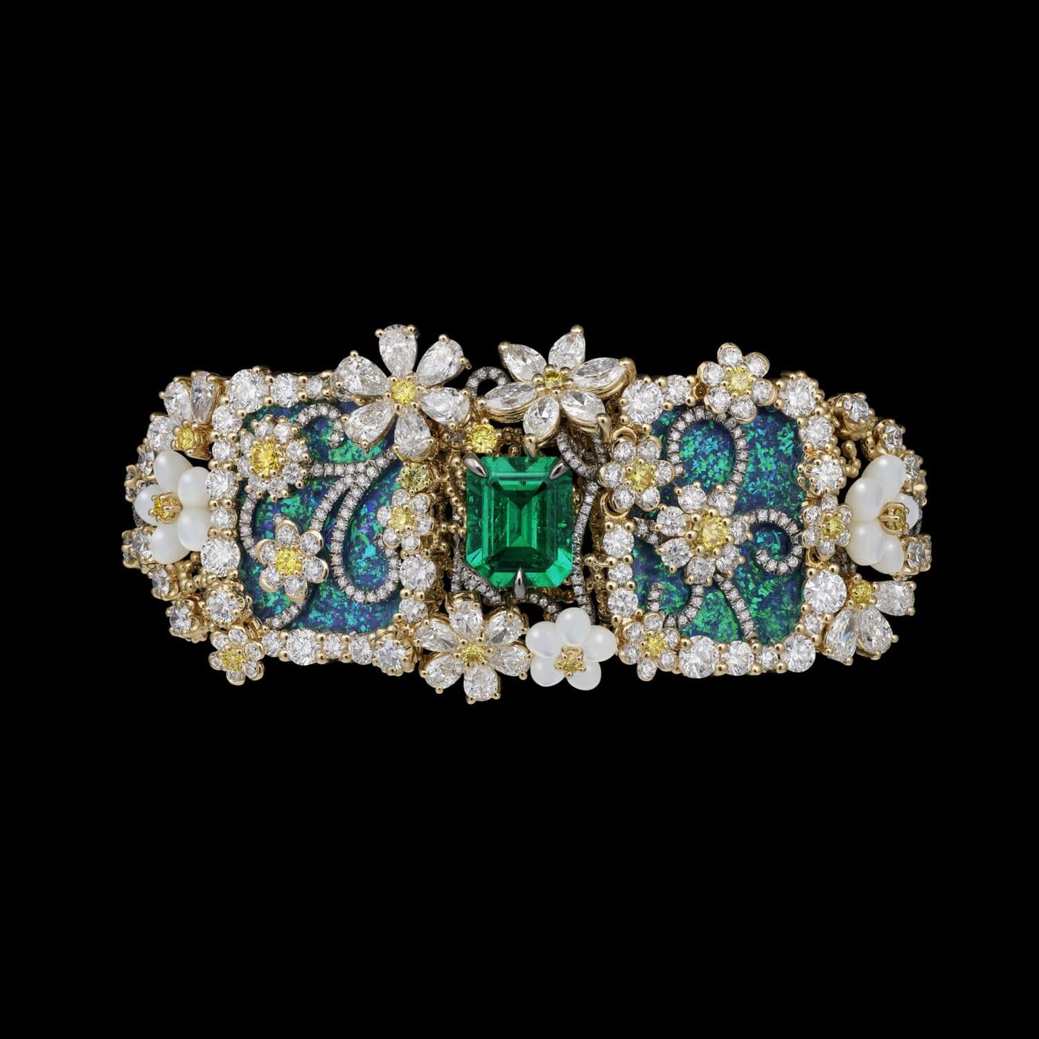 Central to the collection is the opale doublet technique, where opal is layered with onyx or mother-of-pearl to produce mesmerizing hues, reminiscent of sky and water. The result are pieces that transform natural elements into gorgeous displays of color. Further elevating the collection is the plique-à-jour, a hallmark of Dior Joaillerie. This intricate process, similar to crafting miniature stained glass, allows light to pass through a mosaic of lacquered colours, creating an effect that feels vibrant and magical. Given the craftsmanship and attention to detail, it’s no surprise then that the designs appear almost like two-dimensional paintings despite having very three-dimensional gems. But that’s deliberate — they’re little artworks with a sense of childlike whimsy as seen in the pink deer or the rainbow earrings. With everything from brooches to ear cuffs to a tiara, DiorExquis is every bit of the fantasy you’d want from a high jewelry collection.