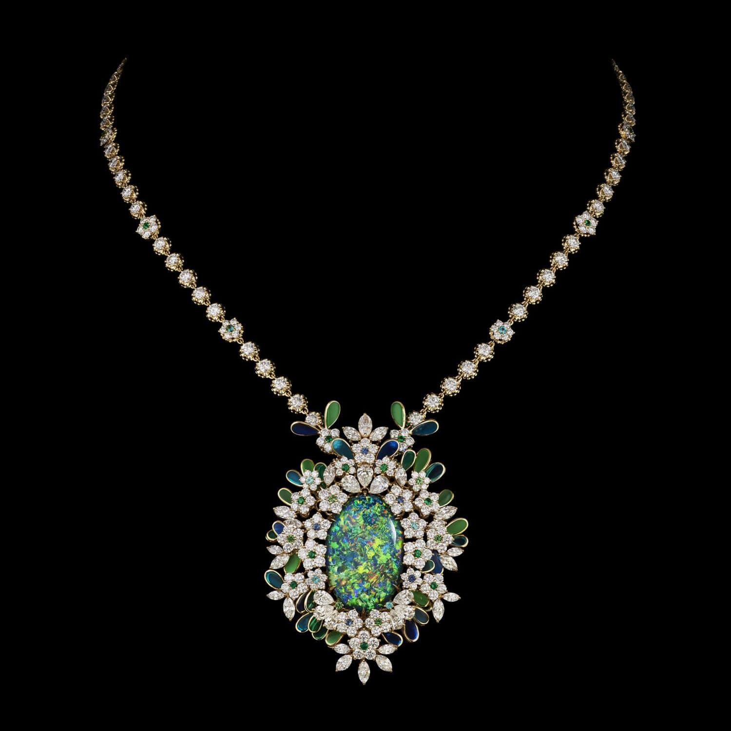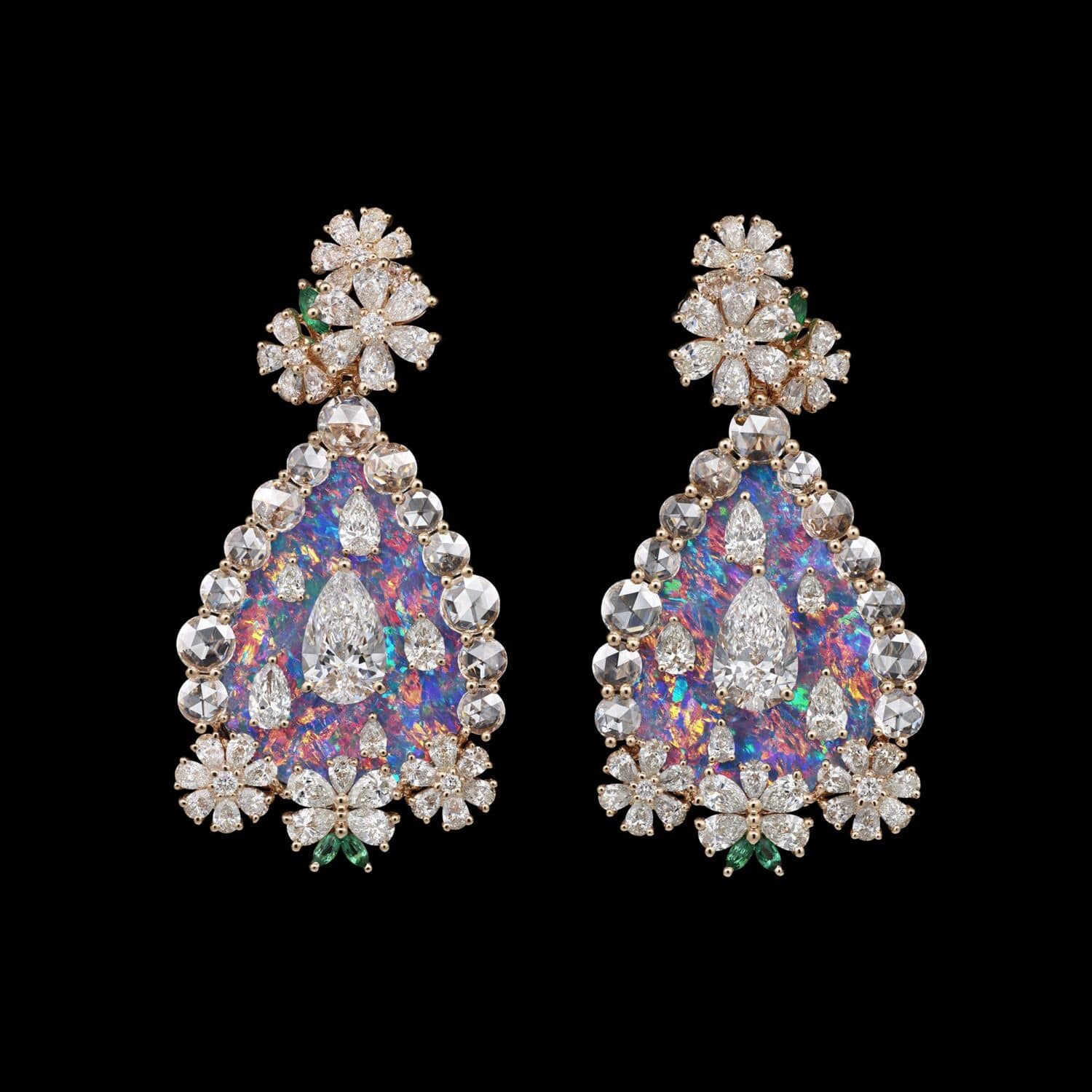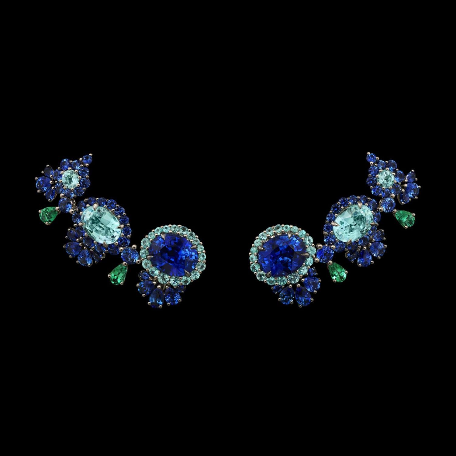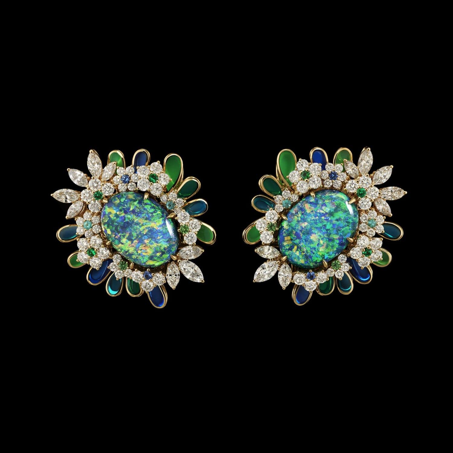 Central to the collection is the opale doublet technique, where opal is layered with onyx or mother-of-pearl to produce mesmerizing hues, reminiscent of sky and water. The result are pieces that transform natural elements into gorgeous displays of color. Further elevating the collection is the plique-à-jour, a hallmark of Dior Joaillerie. This intricate process, similar to crafting miniature stained glass, allows light to pass through a mosaic of lacquered colours, creating an effect that feels vibrant and magical. Given the craftsmanship and attention to detail, it’s no surprise then that the designs appear almost like two-dimensional paintings despite having very three-dimensional gems. But that’s deliberate — they’re little artworks with a sense of childlike whimsy as seen in the pink deer or the rainbow earrings. With everything from brooches to ear cuffs to a tiara, DiorExquis is every bit of the fantasy you’d want from a high jewelry collection.