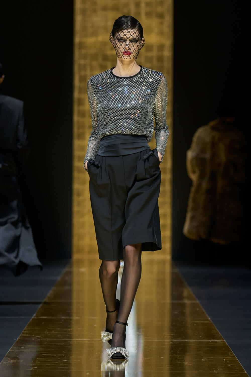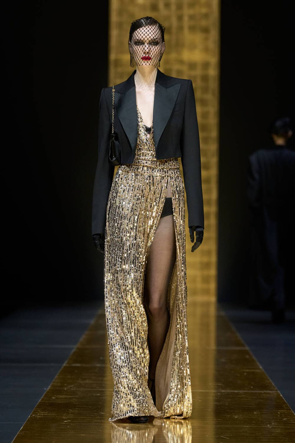 The AW24 collection was dedicated to tuxedo dressing – “To us, designing a tuxedo means offering timeless elegance, deeply rooted in our sartorial culture. It means giving women a classic wardrobe that, escaping from current fashions, allows them to be more self-assured.” The models faces were uniformly veiled, their lips stained red, but each one stepped out in a different tuxedo variation.