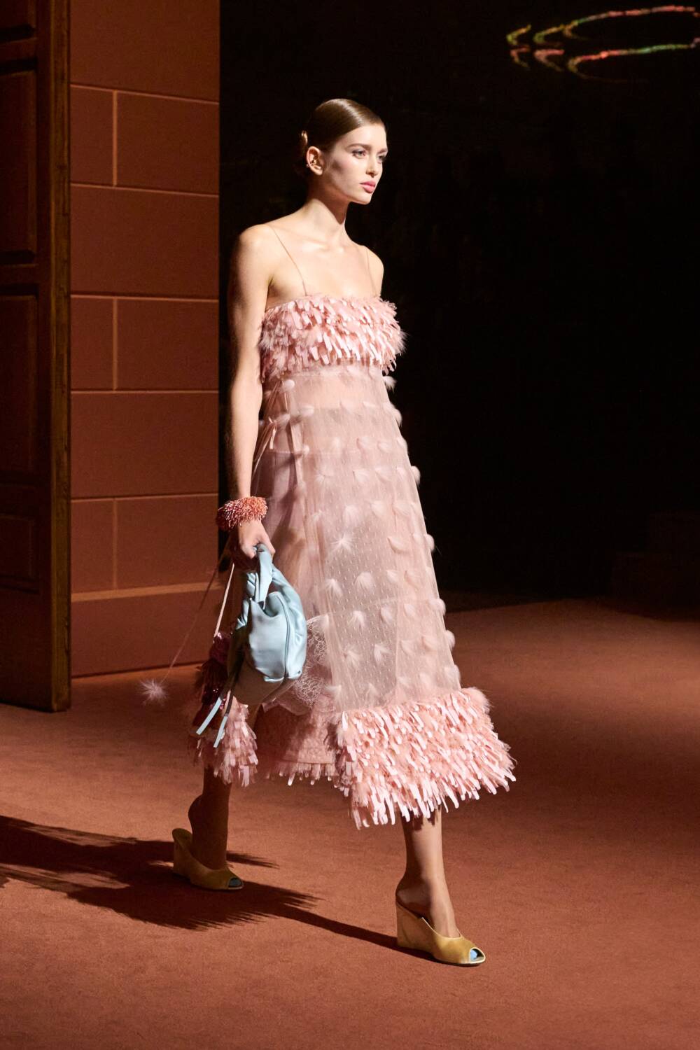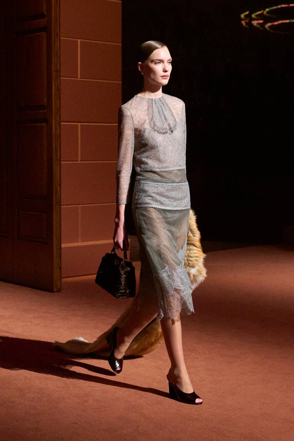The family presence was felt in the carpeted and mirrored show space, designed to resemble the historic Fendi boutique on Via Borgognona, where the five Fendi sisters worked. The invite was a mini Fendi family photo album, showing the dynasty through the years in looks that directly inspired the designer who explained she’d designed from personal memory rather than a deep dive into the archive.
