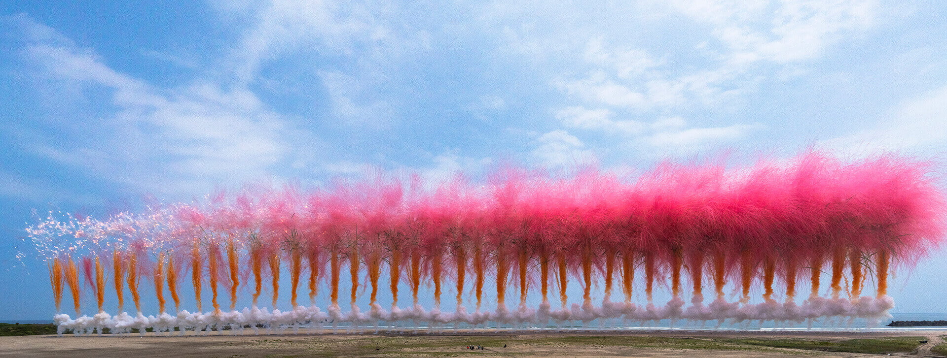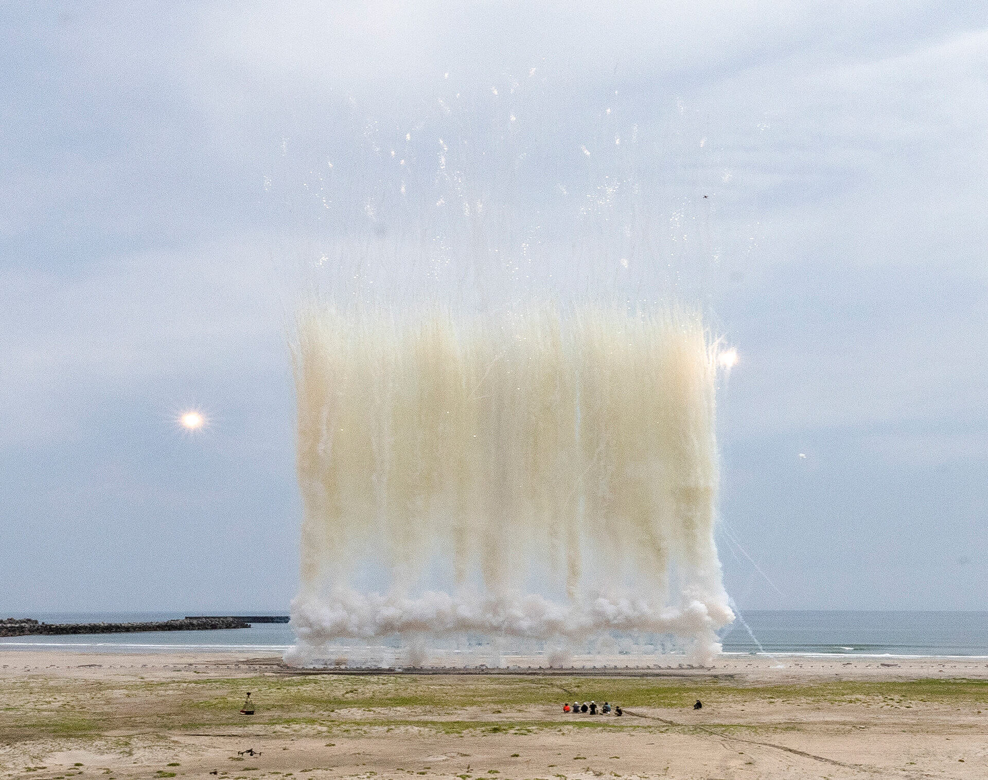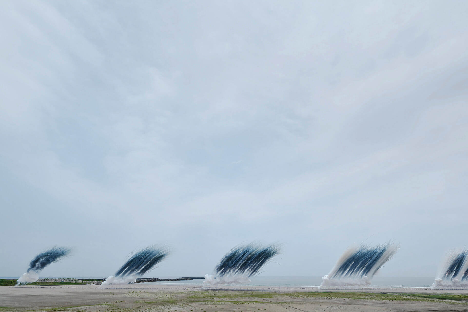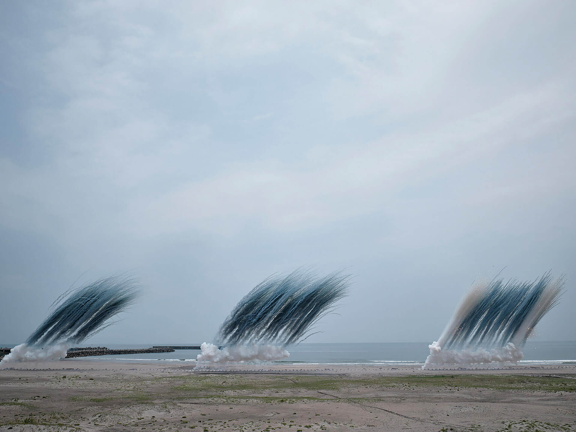 For the latter half of the display, the mood turns hopeful with a specially-designed burst of pink fireworks meant to resemble cherry blossoms. The sakura in the skies above Fukushima are a nod to the ongoing Project to Plant Ten Thousand Cherry Blossom Trees, an initiative by Cai’s friends in Iwaki. Conceived as a project to transform the land in the area that was contaminated by the 2011 earthquake in Fukushima, the goal is to create a pink sea of sakura from afar.