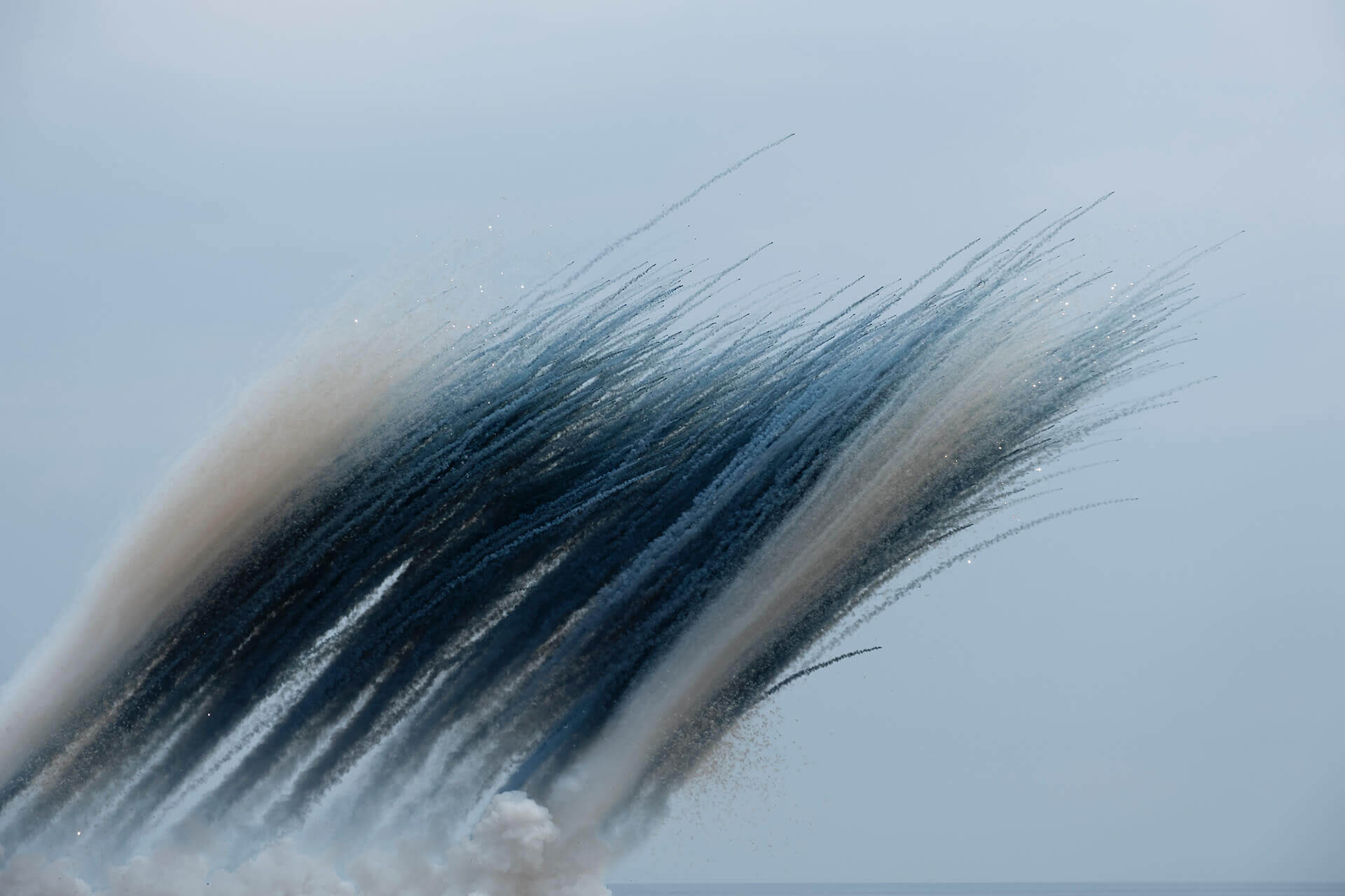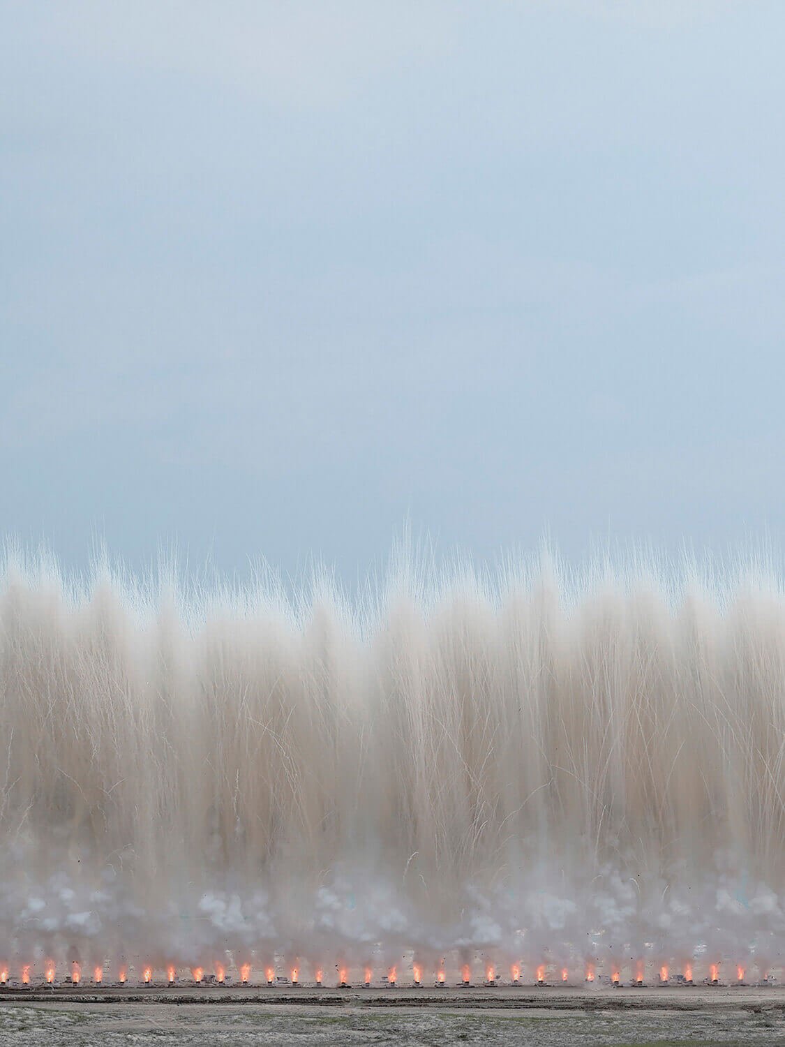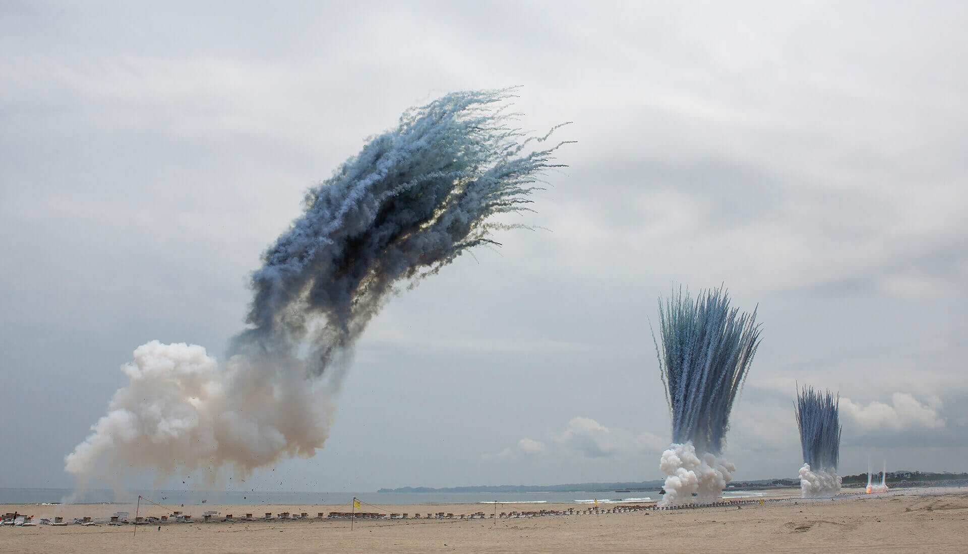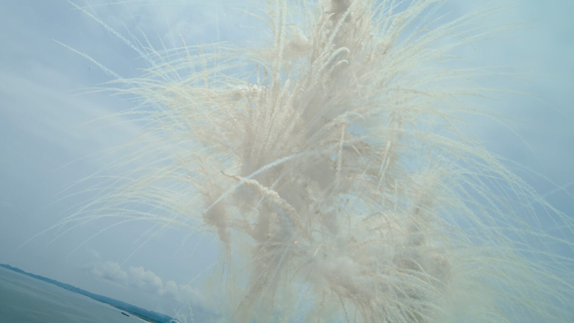 For the latter half of the display, the mood turns hopeful with a specially-designed burst of pink fireworks meant to resemble cherry blossoms. The sakura in the skies above Fukushima are a nod to the ongoing Project to Plant Ten Thousand Cherry Blossom Trees, an initiative by Cai’s friends in Iwaki. Conceived as a project to transform the land in the area that was contaminated by the 2011 earthquake in Fukushima, the goal is to create a pink sea of sakura from afar.