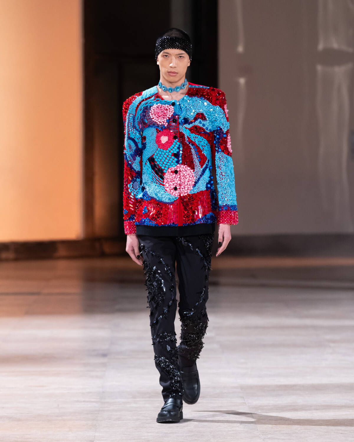Being as Germanier is the unofficial king of color, especially when it comes to the more muted aesthetic of the demure Parisians at fashion week, the designer almost always has an unconventional inspiration behind his work. For this collection, titled Les Globuleuses, he looked to Klari Reis’ petri dish art paintings. His show notes also allude to a Stepford Wife persona who is a prisoner of her own perfection and becomes liberated by a Germanier pearl. “The clothes she wears no longer follow rigid codes of ‘good taste’. They are made of living material: fabrics embroidered with pearls that stretch, undulate and change shape with every movement, reflecting her emotions,” the show notes say. The designer has also been collecting maximalist vintage archive fashion to inspire him, from Mugler, Dior, and more. “What is costume? What is fashion?” he says of one of his main mottos.