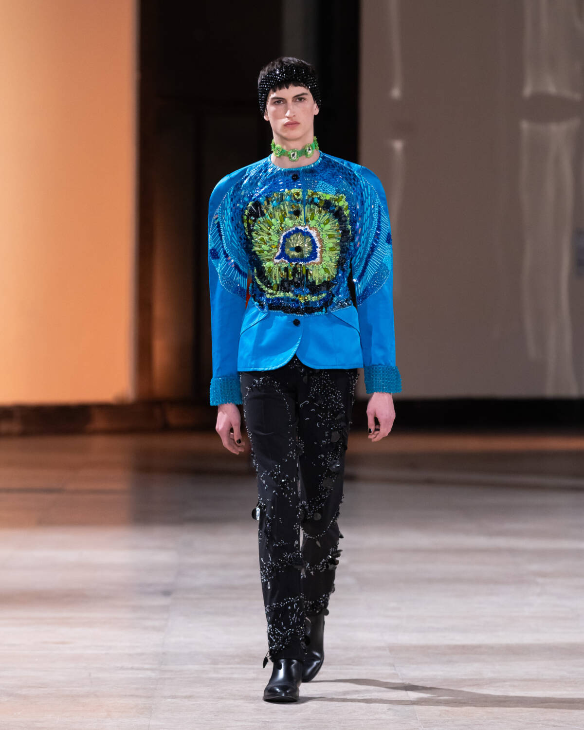 A trio of spiked looks that resembled real life walking Koosh balls were among the standouts from the collection, alongside tailored patterned suit jackets and matching boots covered in the designer’s signature mosaic of rainbow glass beads. “We are making our own feathers with unconventional fabric,” he says. “My biggest inspiration is the 1950s. It’s personal — I love that era. But putting a woman in a corset in 2025 is not very modern. We have to twist that.” Enter: colorful, twisted knitted skirt sets that mix new and old with the wonderfully freaky good aesthetic that Germanier has cultivated these past few years.