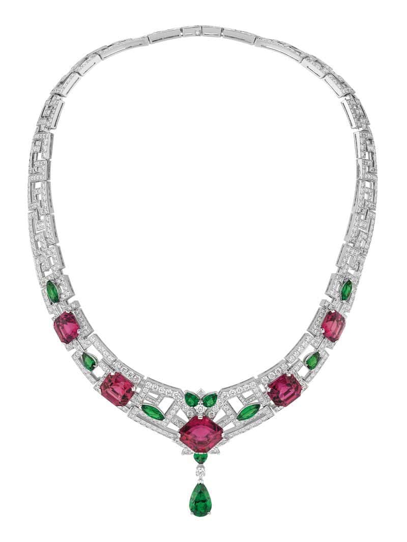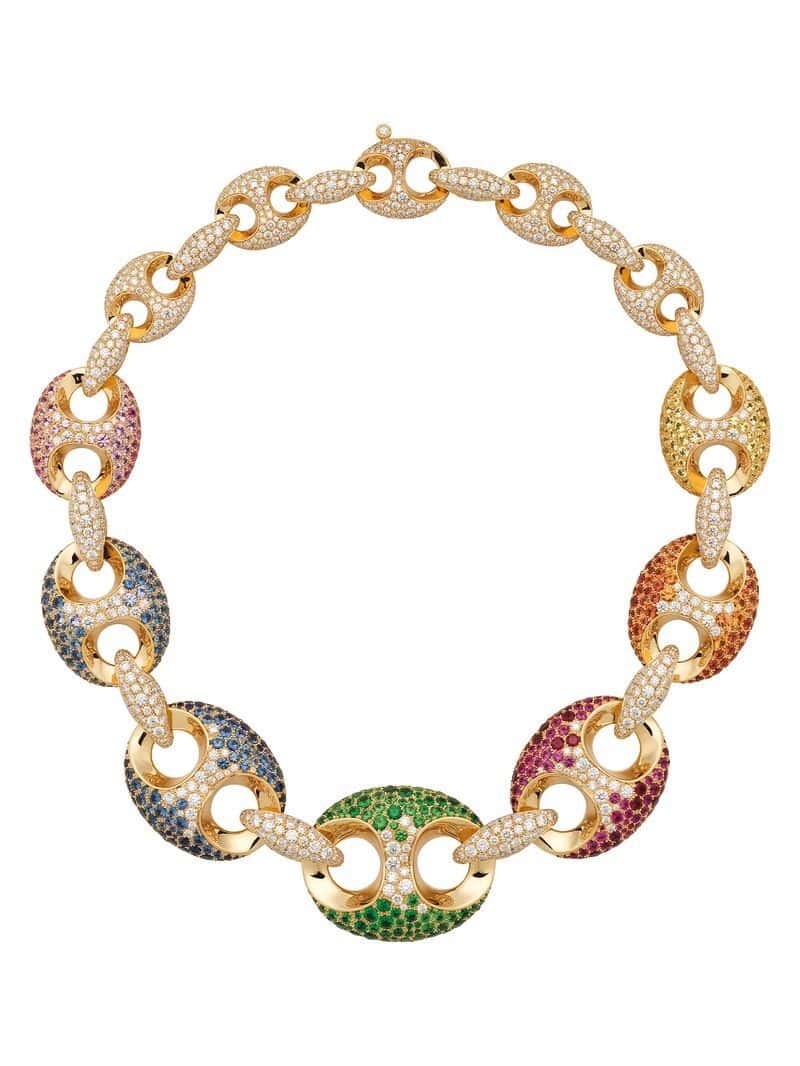 Re-introduced back in 2023, the Marina Chain dates back to the 1960s and is inspired by the maritime world. For 2025, the design gets the rainbow effect with a slew of gems ranging from rubies to sapphires to tsavorites to diamonds. For a slightly more subtle take, there’s a pendant necklace with a 3.40-carat Brazilian aquamarine, surrounded by pavé sapphires and diamonds. And finally, rose gold earrings made up of pink sapphires and featuring a 2.73 spinel centerpiece round out this grouping.