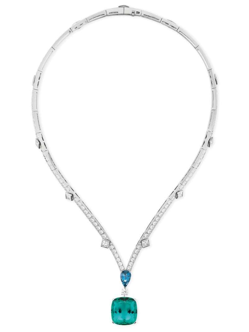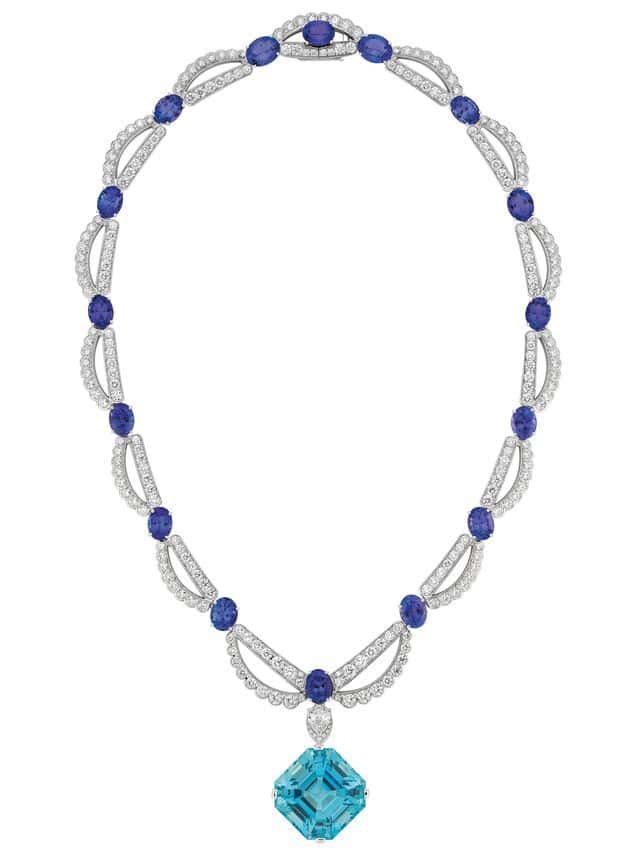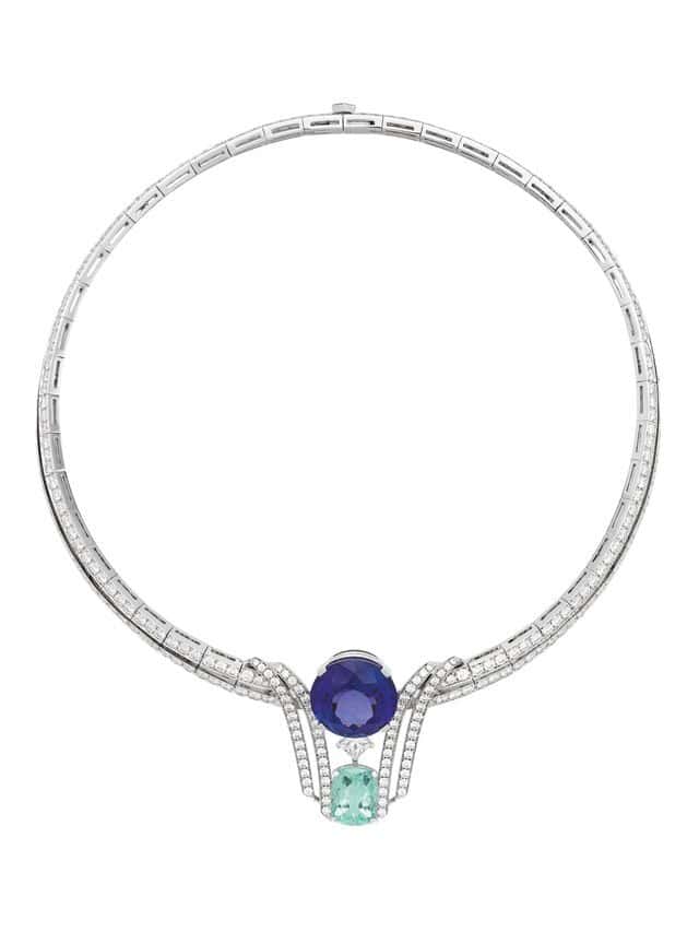 Kicking off the triptych of high jewelry motifs is an extension of last year’s Labrinti collection. With 20 new pieces that fall under this family, highlights include a 24.75 carat tanzanite and a 5.94 carat Paraiba tourmaline necklace that wraps delicately around the neck. Accented with diamonds, the gems sway with every move and are meant to resemble a fountain hidden in a maze. Another noteworthy creation is a 6.02 carat oval cut Brazilian aquamarine ring with two Paraiba diamonds at the center. The setting was created to evoke the lace-like petals of a rose. For those wanting a showstopper look to the necklace has a 62.86 carat Brazilian aquamarine at its heart. Below the center stone, a strand of diamonds interspersed with 30 carats of oval tanzanite stones offers a sense of delicacy and lightness.