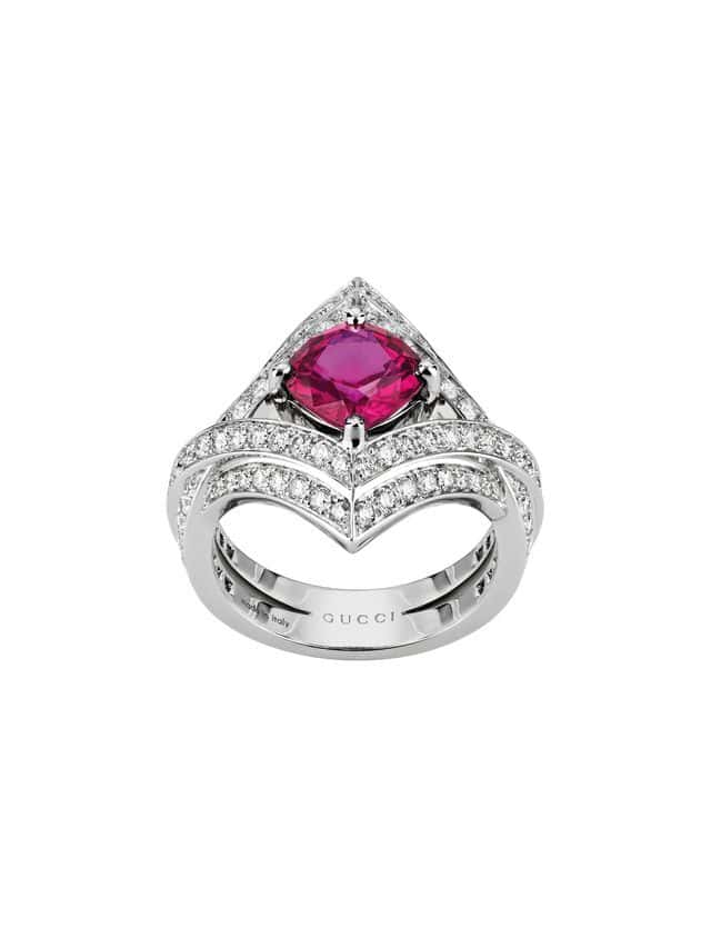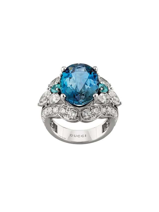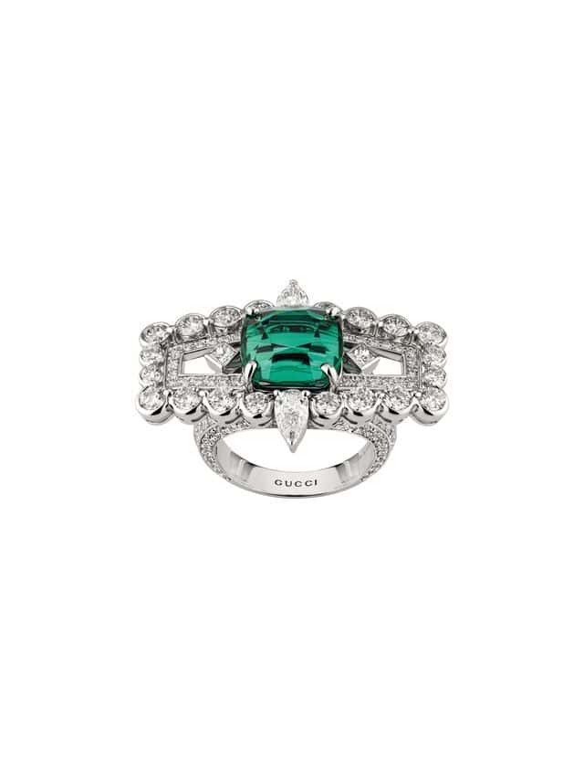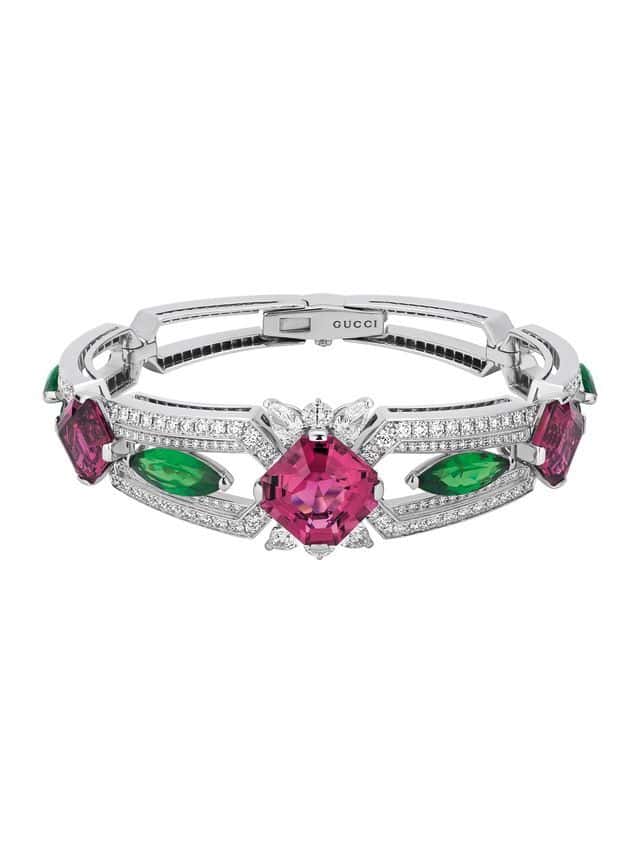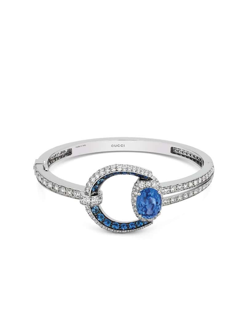 Given that Gucci has an equestrian history, their horsebit design naturally deserves a moment of high jewelry glory. Spanning a selection of necklaces, rings, and bracelets, key pieces to note include a diamond-encrusted bangle with a 5.19 carat oval sapphire at its center. The vibrant stone perfectly matches the blue plated metal it’s set in. Another standout is a red and green collar. Draped in diamonds, it also boasts a 3.07 carat oval-cut ruby as well as Tsavorites. To pair with the necklace, naturally, there are matching stud Horsebit earrings made from two 1.62 carat rubies, tsavorites, and diamonds.