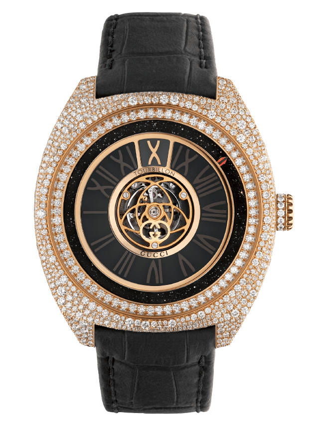 To complete the watch collection, there are two other styles: the Gucci25H, which is a 40mm skeleton tourbillon that was inspired by ancient Rome’s Colosseum, and the Gucci Interlocking. The latter was introduced in 2024 and features a new 41mm rose gold watch adorned with diamonds. With a 10.7mm cushion-shaped case that houses a flying tourbillon as well as a jumping hours complication, it’s a testament to the craftsmanship required to create all of the pieces in this Gucci high jewelry and watches collection.