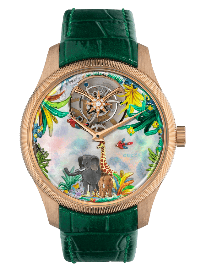 A jewelry collection would not be complete without new watches as well. Joining the G-Timeless collection are five new timepieces highlighting the Métiers d’Art skill. Each 40mm design has a Tourbillon movement and hand-engraved case backs. Highlights include a design inspired by the Flora print scarf, created by Vittorio Accornero. With a floral background set in white gold diamonds and featuring white grand feu enameling, you’ll also find hand-painted flowers and inlays utilizing violet jade, mother-of-pearl, and verdite. Another draws from another, an Accomero scarf, Velieri, a nautical-inspired creation that translates into horology courtesy of a mother-of-pearl dial and maritime motifs. And for those who love Accornero’s Safari print from 1969, they’ll be interested in the rose gold watch with a mother-of-pearl dial that includes a slew of wildlife in the background.