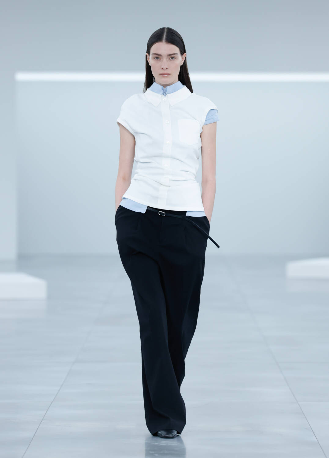 Then came a return to normality – or something like it. Tailored looks emerged, crisp white vests layered over blue poplin shirts. Monochrome moments held their ground. White never truly disappeared; was never fully consumed by colour.