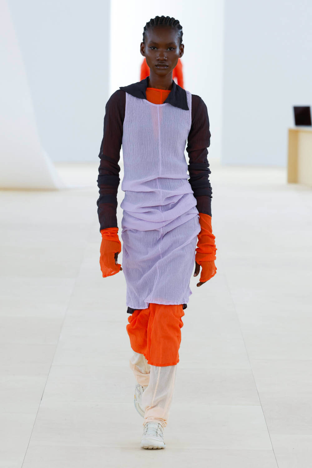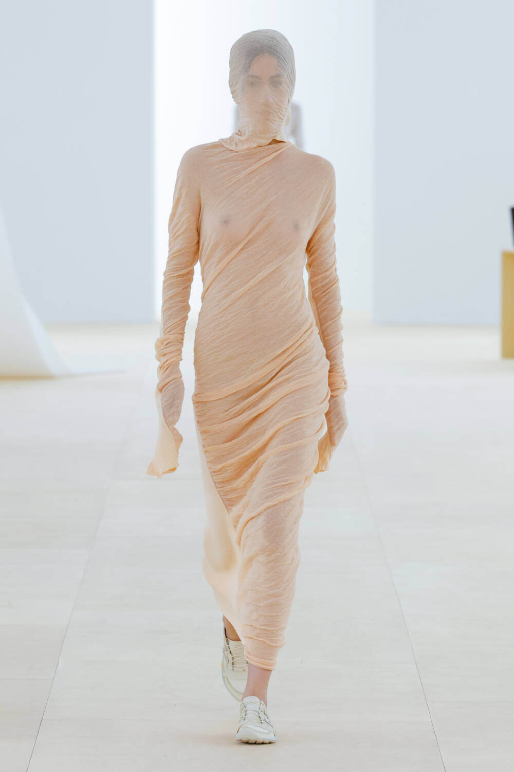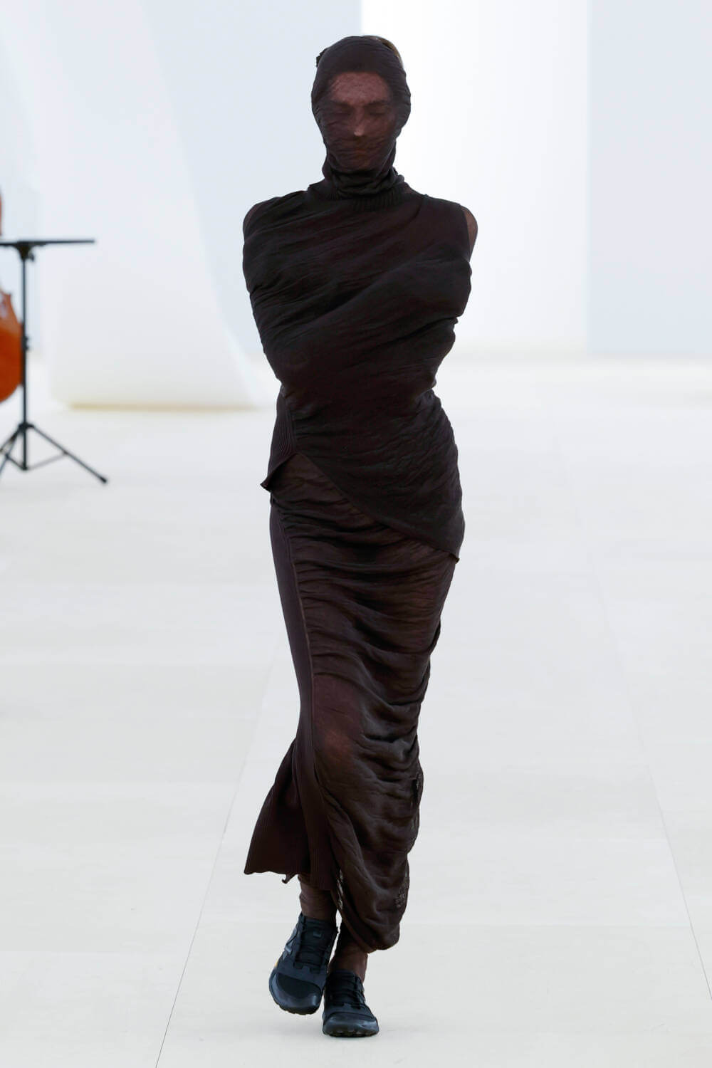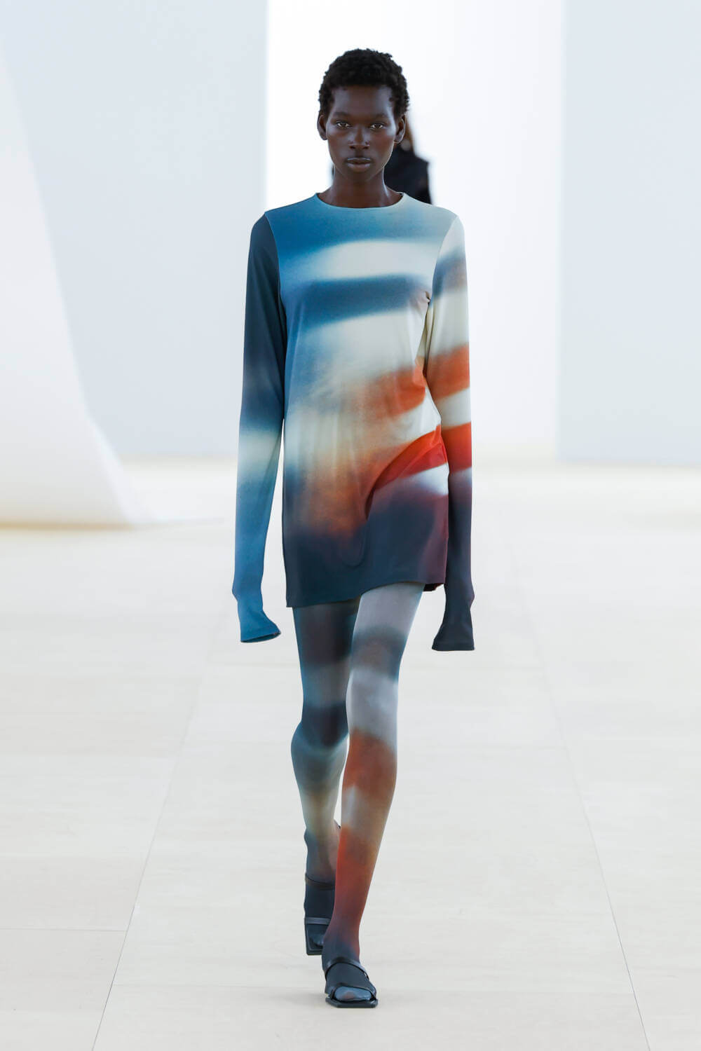 The show kicked off with an extended interpretive dance before opening with a section called Ambiguous, a series of gauzy cotton knits in shades of black, white, and lavender that hugged and draped across the body. Some models wore hoods, adding to the mysterious effect. Next was Twining, a duo of looks in black and orange that Kondo conceived as inspired by a flag fluttering the sky. Featuring a twisted design, the lightweight, voluminous textured fabric appeared to float and wind across the arms, legs, and torso. A third section calls back to the idea of light, aptly entitled Light Leak. Consisting of photo prints that feature blurred gradients, they’re created by deliberately exposing camera film. These looks were bright and served as palate cleanser before the show segued into the final three sections.