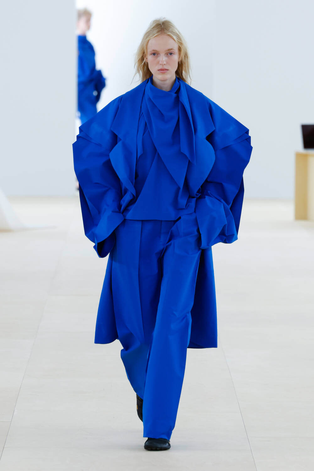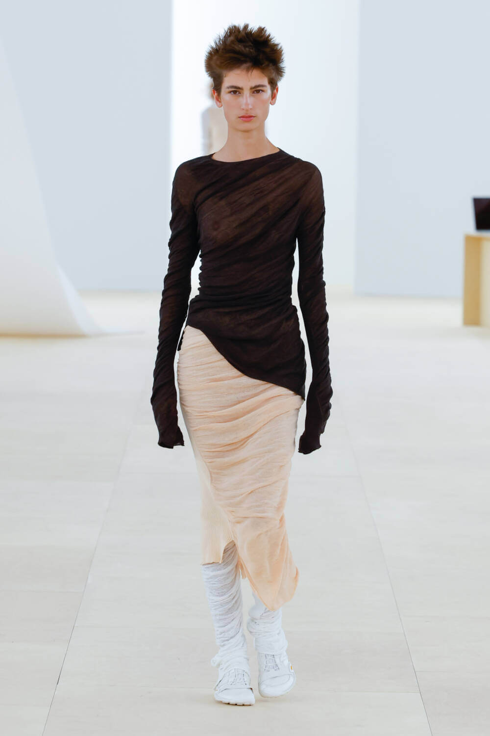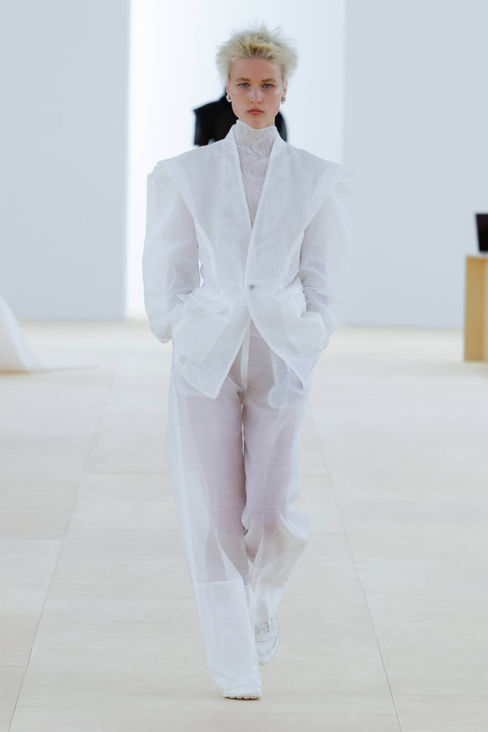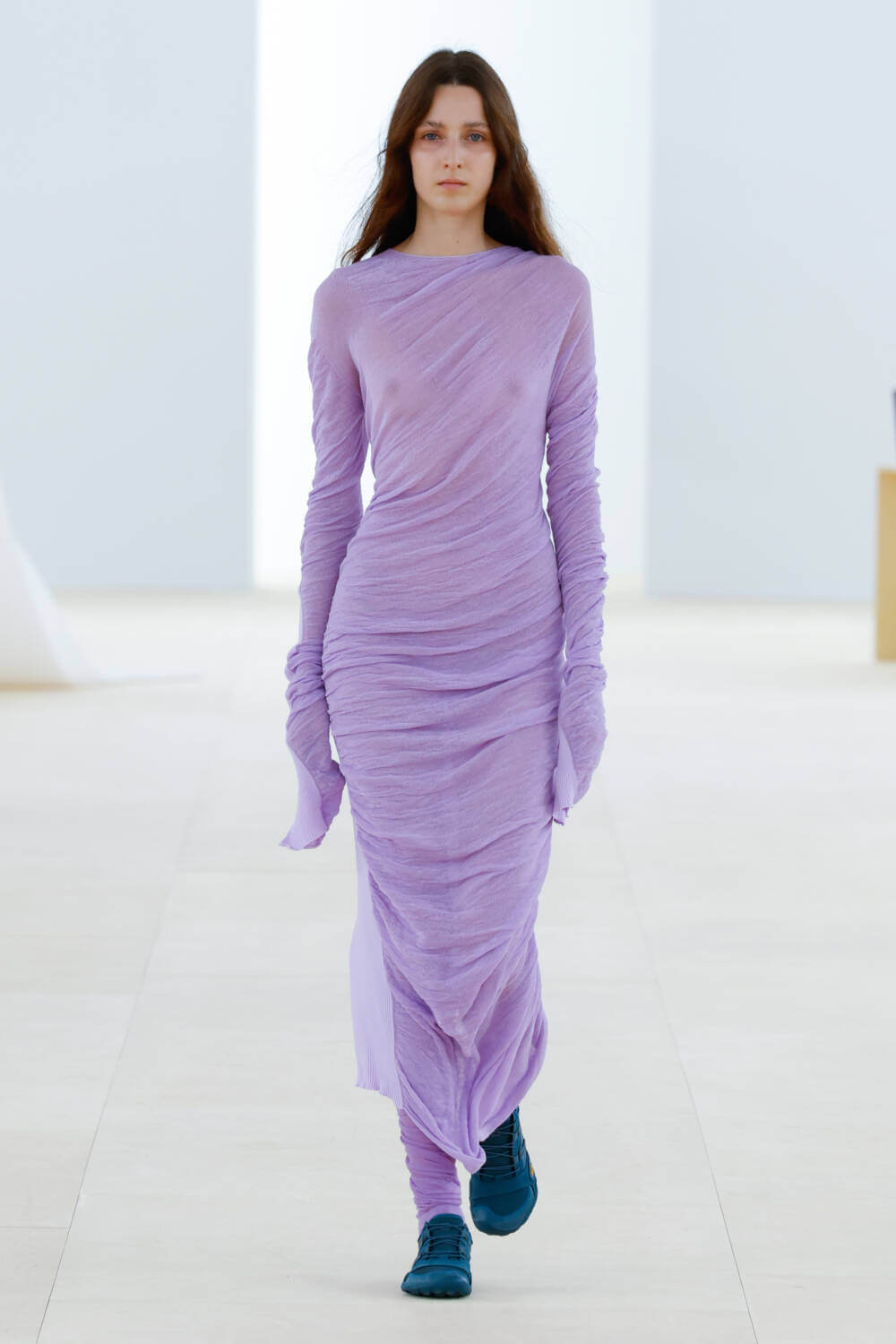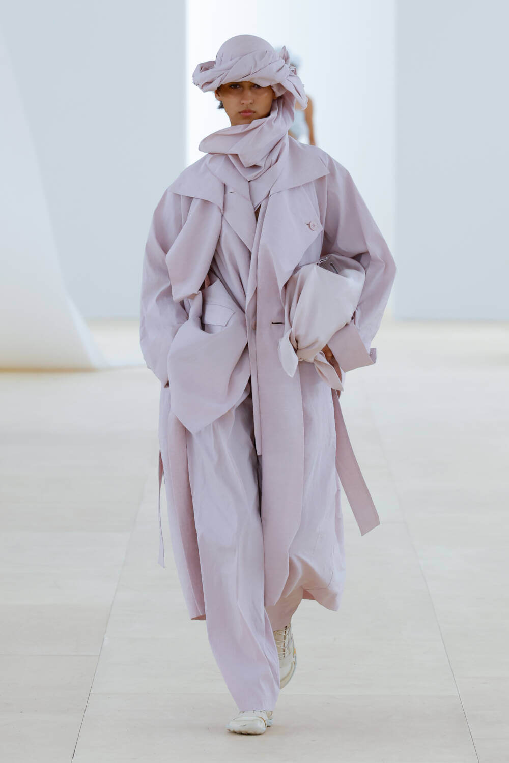 The show kicked off with an extended interpretive dance before opening with a section called Ambiguous, a series of gauzy cotton knits in shades of black, white, and lavender that hugged and draped across the body. Some models wore hoods, adding to the mysterious effect. Next was Twining, a duo of looks in black and orange that Kondo conceived as inspired by a flag fluttering the sky. Featuring a twisted design, the lightweight, voluminous textured fabric appeared to float and wind across the arms, legs, and torso. A third section calls back to the idea of light, aptly entitled Light Leak. Consisting of photo prints that feature blurred gradients, they’re created by deliberately exposing camera film. These looks were bright and served as palate cleanser before the show segued into the final three sections.